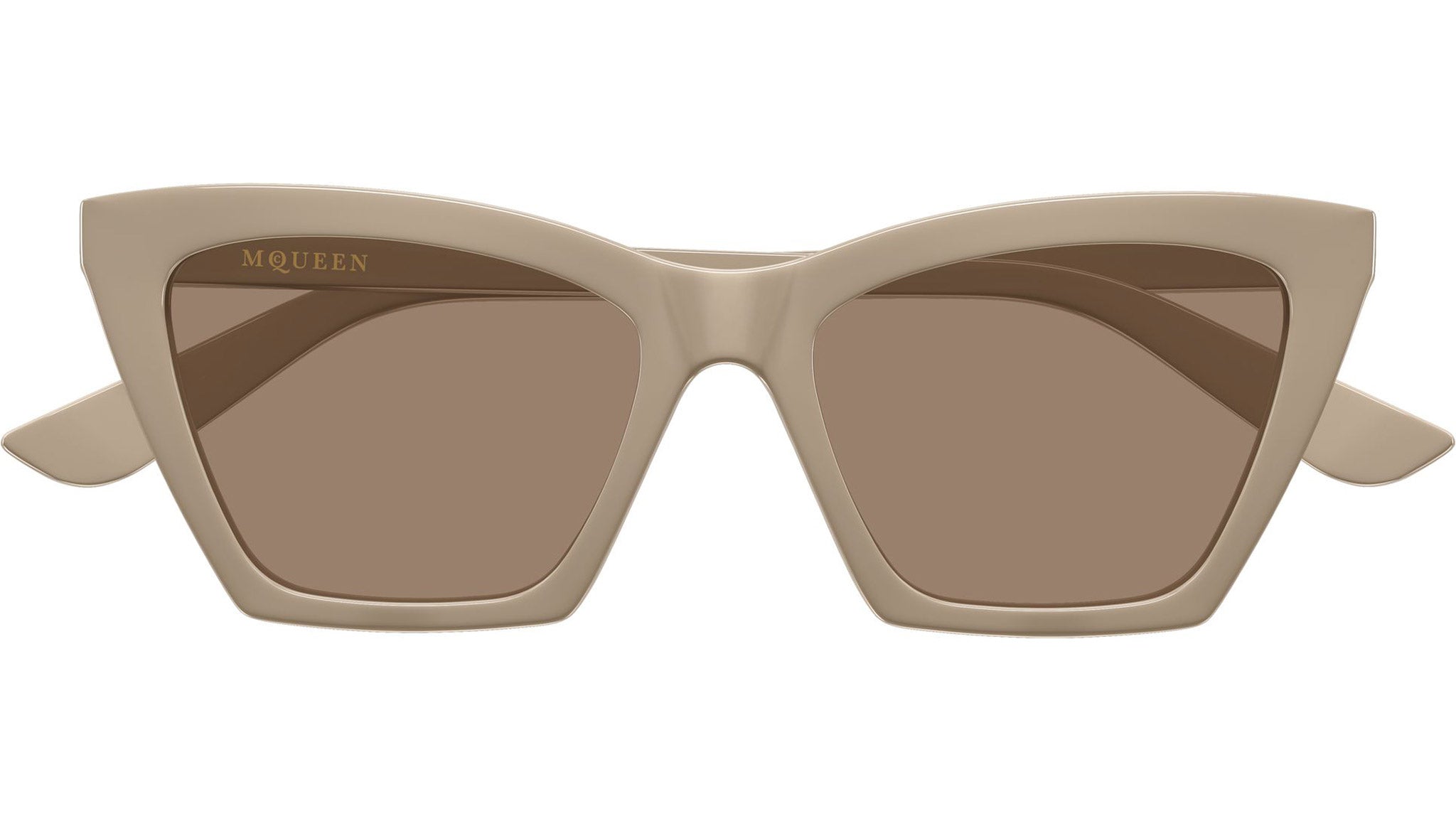 Occhiali da sole Alexander McQueen Logo modello AM0536S in acetato riciclato cat eye codice colore 003 beige intenso lucido con aste beige e lenti color marrone tinta unita. Rivenditore autorizzato Alexander McQueen online. Gli occhiali vengono consegnati con custodia e accessori originali e sono coperti dalla garanzia ufficiale di 12 mesi del produttore.