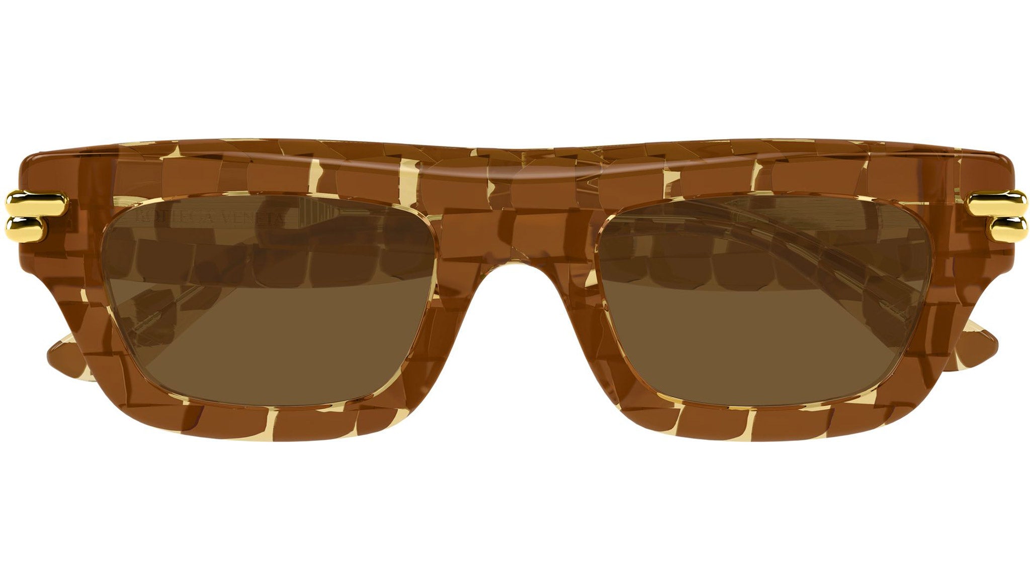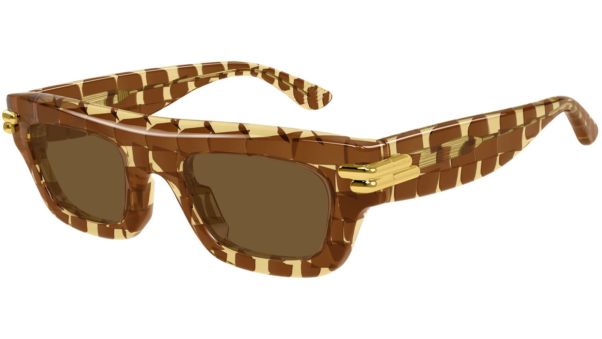 Occhiali da sole Bottega Veneta BV1321S 006 unisex con montatura rettangolare in acetato riciclato marrone opale / giallo trasparente motivo intreccio lucido e lenti marrone tinta unita. Linea: Ribbon. Codice modello: BV1321S. Codice colore: 006. Made in Japan. Rivenditore autorizzato Bottega Veneta online. Gli occhiali vengono consegnati con custodia e accessori originali e sono coperti dalla garanzia ufficiale di 12 mesi del produttore.