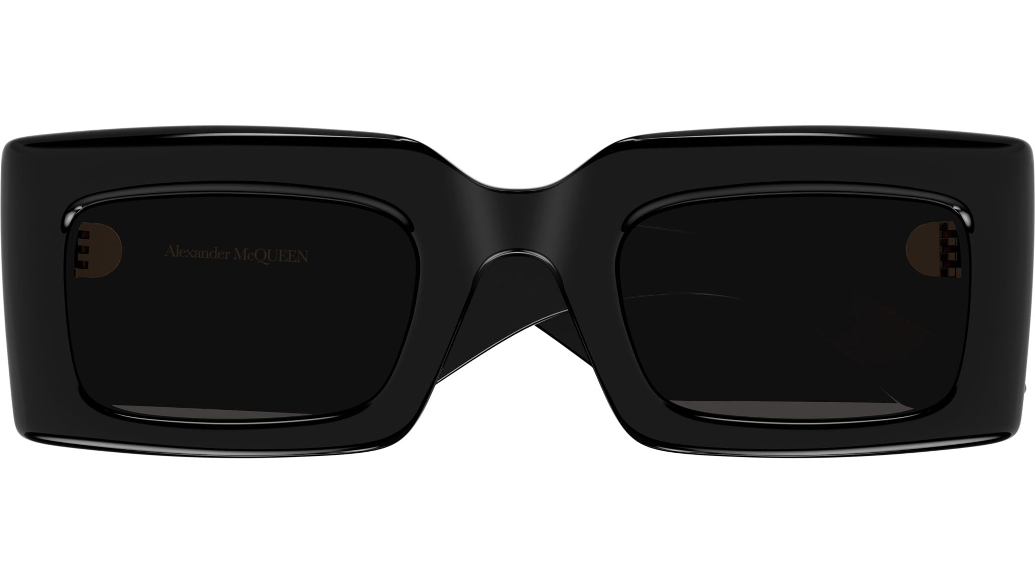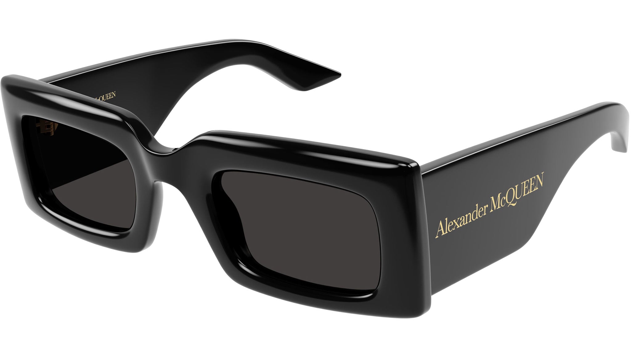 Occhiali da sole Alexander McQueen Casual Lines modello AM0433S rectangle in acetato riciclato codice colore 001 nero lucido tinta unita con aste nero e lenti color grigio tinta unita.