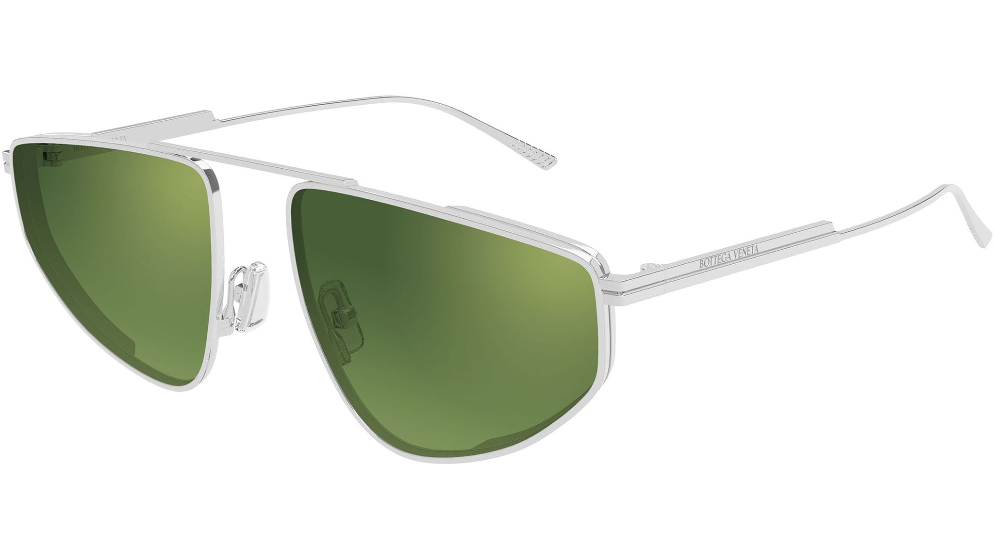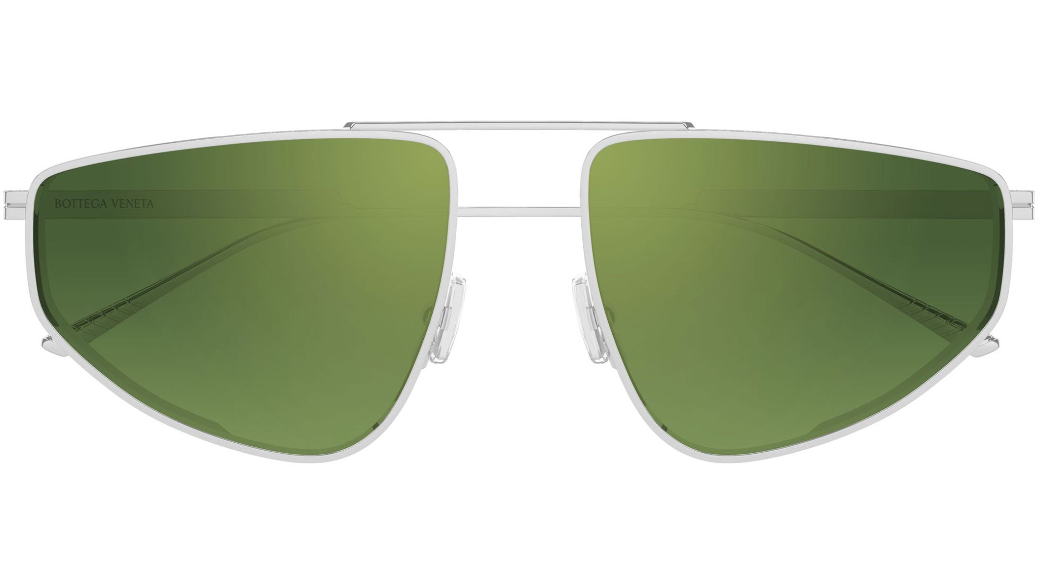 Occhiali da sole Bottega Veneta BV1466S 002 donna con montatura aviatore in metallo argento lucido e lenti verde bosco doppia sfumatura a verde acido chiaro + flash elettrico sul retro. Linea: Ribbon. Codice modello: BV1466S. Codice colore: 002. Made in Italy. Rivenditore autorizzato Bottega Veneta online. Gli occhiali vengono consegnati con custodia e accessori originali e sono coperti dalla garanzia ufficiale di 12 mesi del produttore.