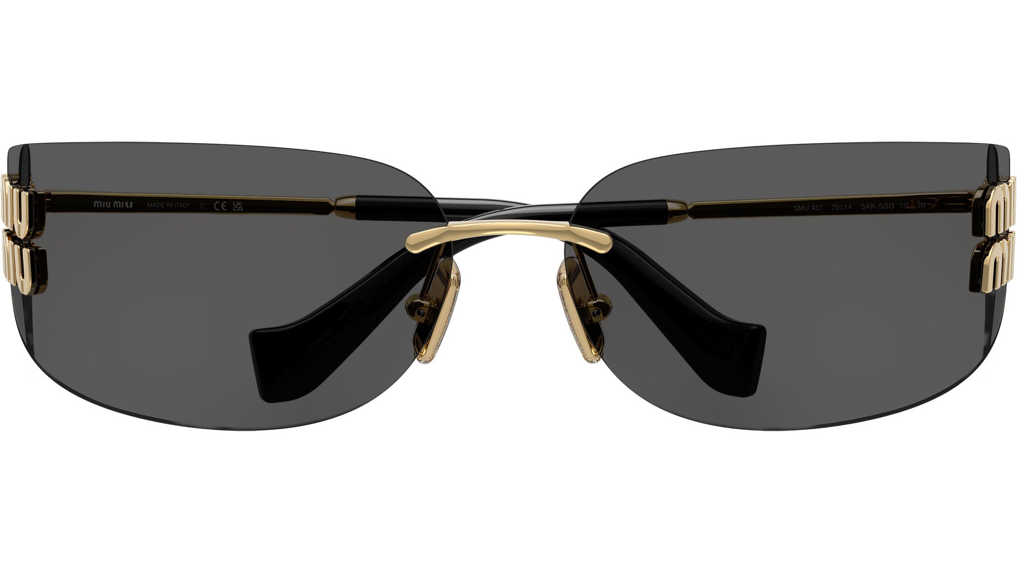 Occhiali da sole Miu Miu MU A51S 5AK5S0 donna con montatura rettangolare in metallo oro e lenti in poliammide color grigio scuro. Naselli regolabili. Linea: Fashion Show. Codice modello: 0MU A51S. Codice colore: 5AK5S0. Made in Italy. Rivenditore autorizzato Miu Miu online. Gli occhiali vengono consegnati con custodia e accessori originali e sono coperti dalla garanzia ufficiale di 12 mesi del produttore.