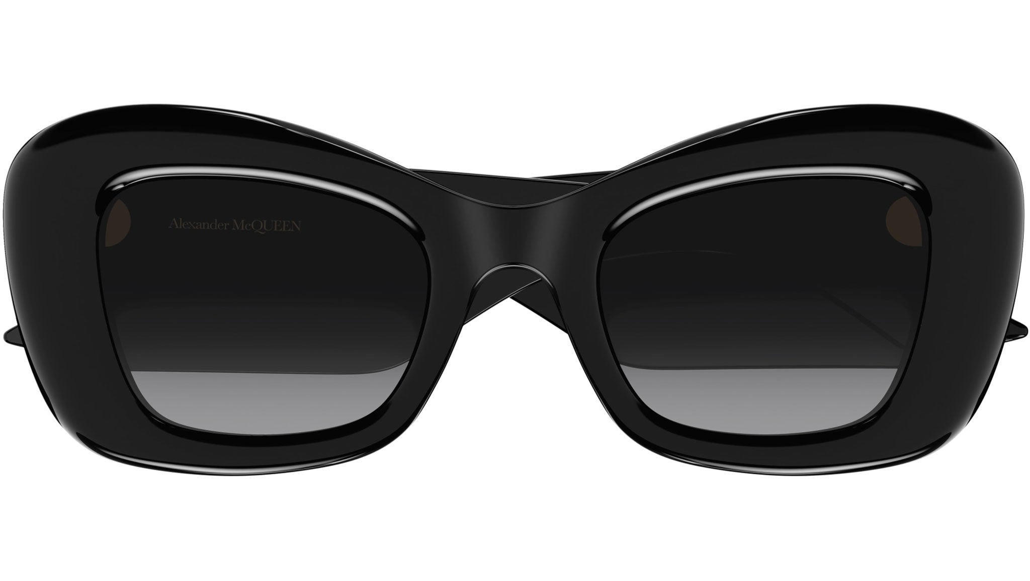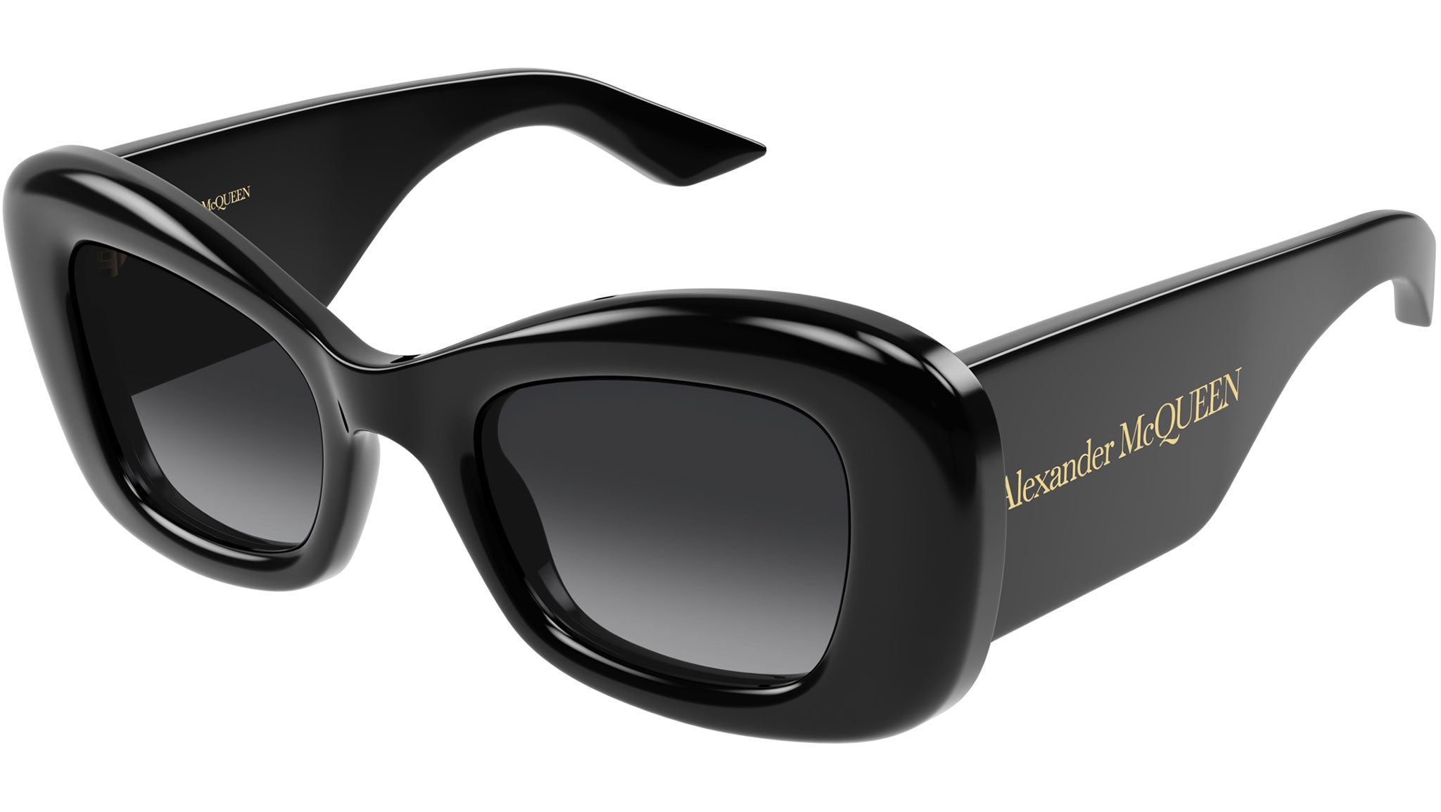 Occhiali da sole Alexander McQueen Casual Lines modello AM0434S cat eye in acetato riciclato codice colore 001 nero lucido tinta unita con aste nero e lenti color grigio sfumato.