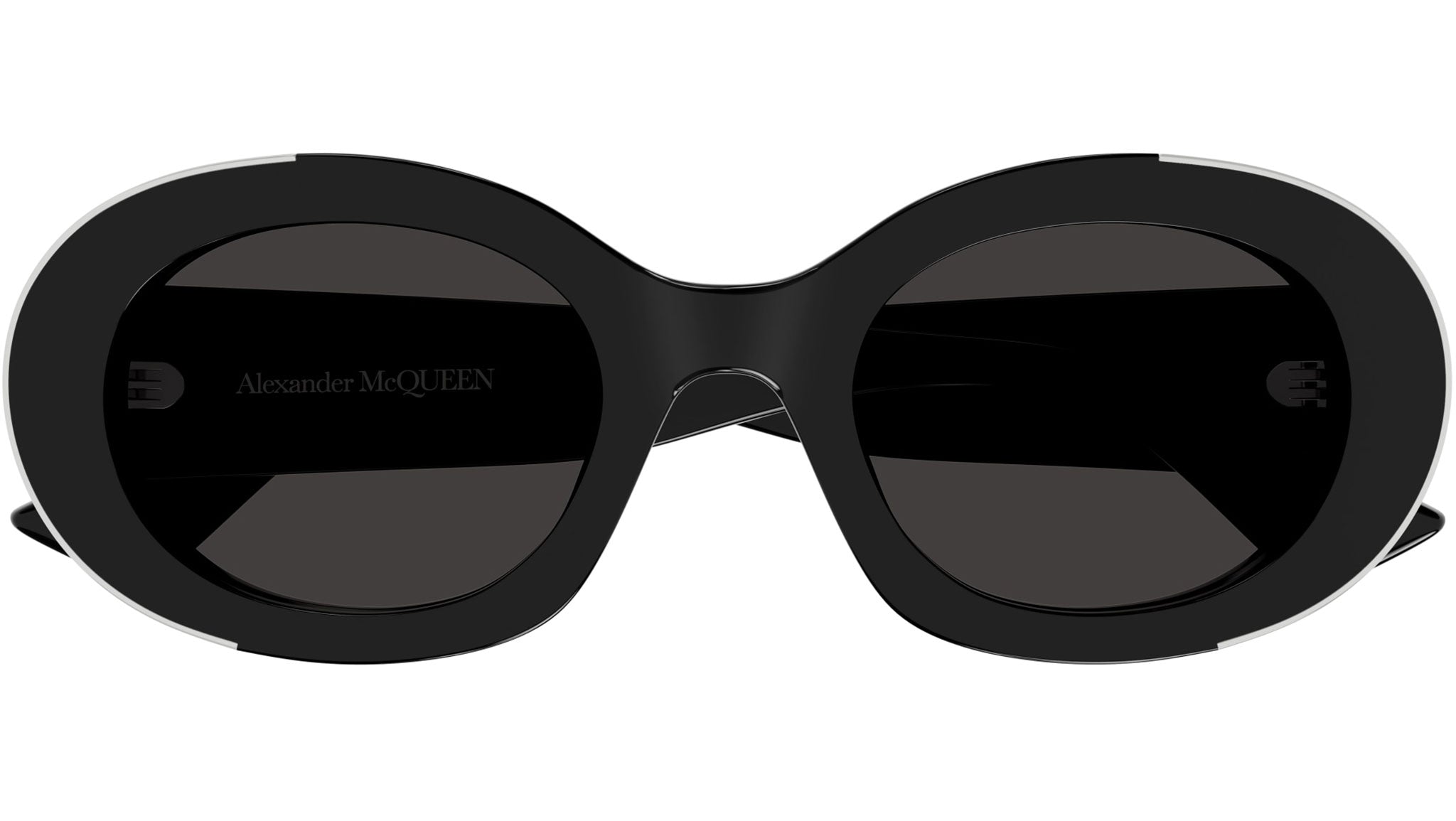 Occhiali da sole Alexander McQueen Icons modello AM0445S panthos in acetato riciclato codice colore 001 nero lucido tinta unita con aste nero e lenti color grigio tinta unita.
