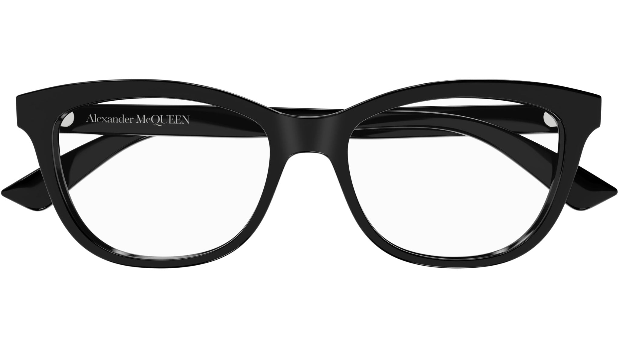 Occhiali da vista Alexander McQueen Casual Lines modello AM0461O cat eye in acetato riciclato codice colore 001 nero lucido tinta unita con aste nero e lenti demo.