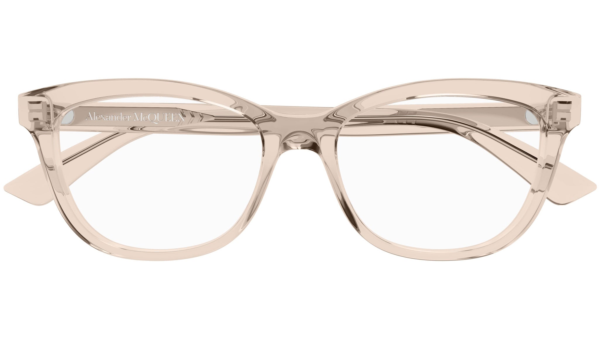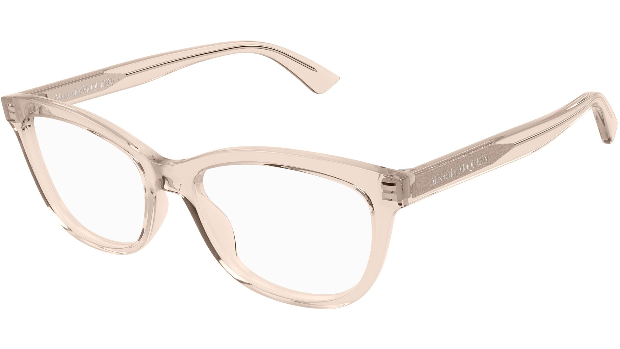 Occhiali da vista Alexander McQueen Casual Lines modello AM0461O cat eye in acetato riciclato codice colore 003 pesca chiaro trasparente lucido con aste rosa e lenti demo.