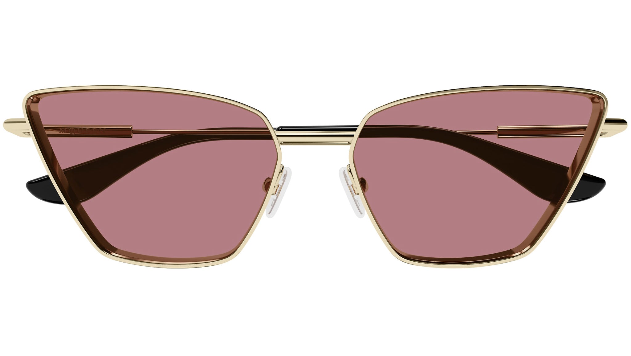 Occhiali da sole Alexander McQueen T-Bar modello AM0501S in metallo cat eye codice colore 004 oro chiaro lucido con aste oro e lenti color ciclamino tinta unita. Rivenditore autorizzato Alexander McQueen online. Gli occhiali vengono consegnati con custodia e accessori originali e sono coperti dalla garanzia ufficiale di 12 mesi del produttore.