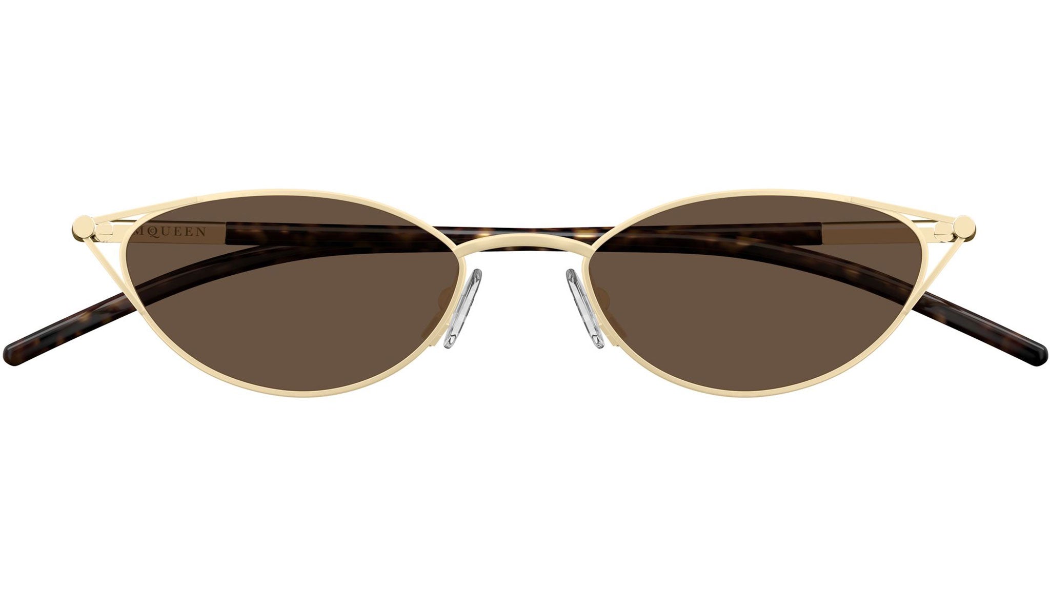 Occhiali da sole Alexander McQueen AM0563S 002 donna con montatura cat eye in metallo oro chiaro opaco e lenti marrone tinta unita. Linea: T-Bar. Codice modello: AM0563S. Codice colore: 002. Made in Japan. Rivenditore autorizzato Alexander McQueen online. Gli occhiali vengono consegnati con custodia e accessori originali e sono coperti dalla garanzia ufficiale di 12 mesi del produttore.