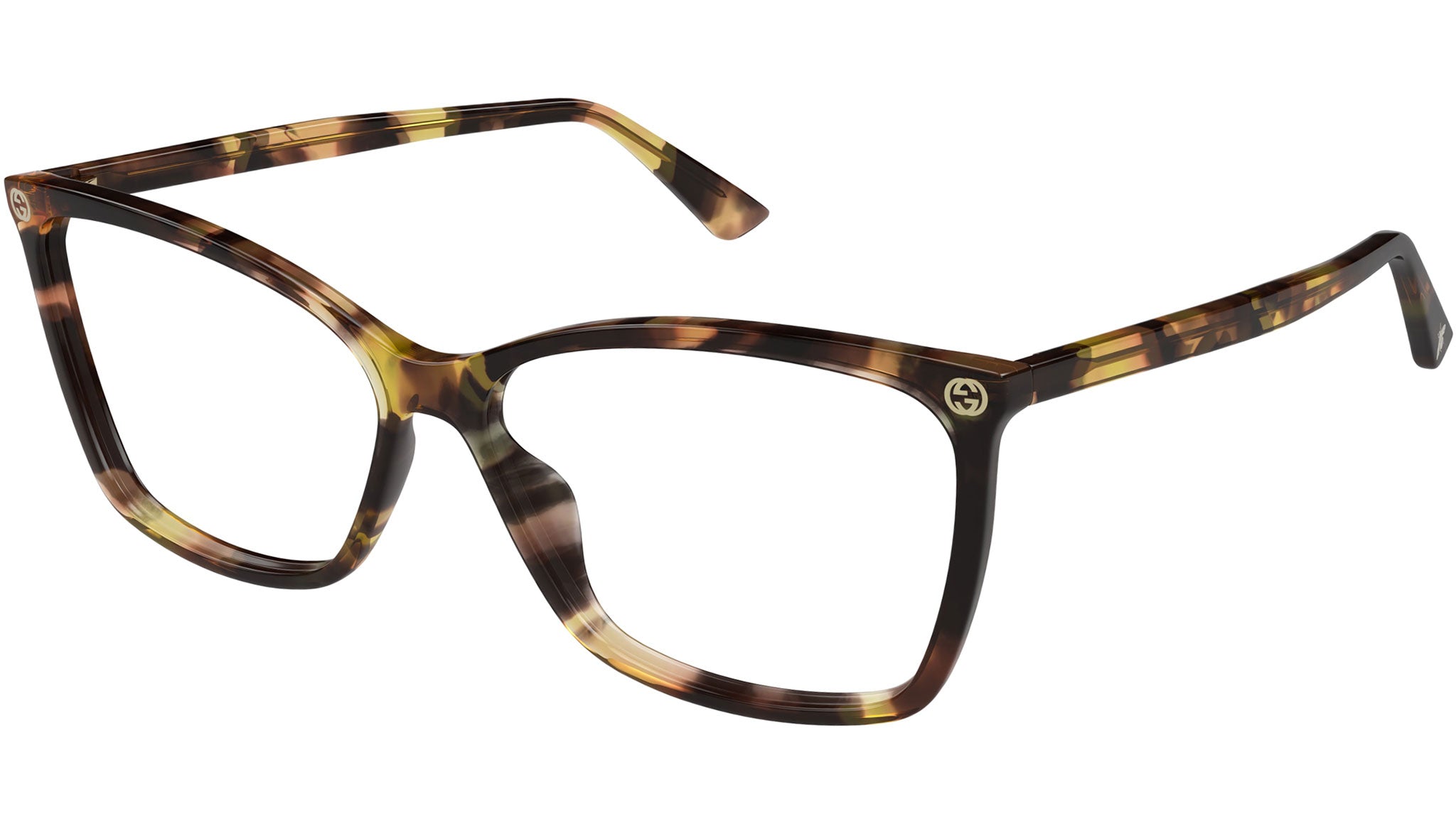 Occhiali da vista Gucci modello GG0025O linea GG Logo in acetato forma a gatto verde ambra melange lucido e avana nero con aste in tartaruga e lenti demo. Rivenditore autorizzato Gucci online. Gli occhiali vengono consegnati con custodia e accessori originali e sono coperti dalla garanzia ufficiale di 12 mesi del produttore.