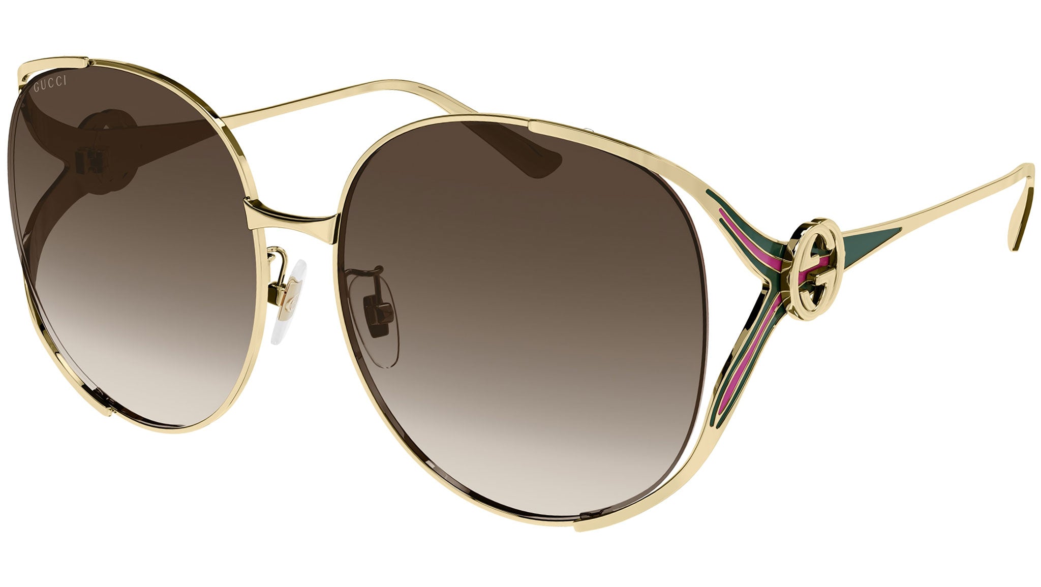 Occhiali da sole Gucci Logo modello GG0225S variante colore 007 oro endura lucido con lenti color marrone sfumato.