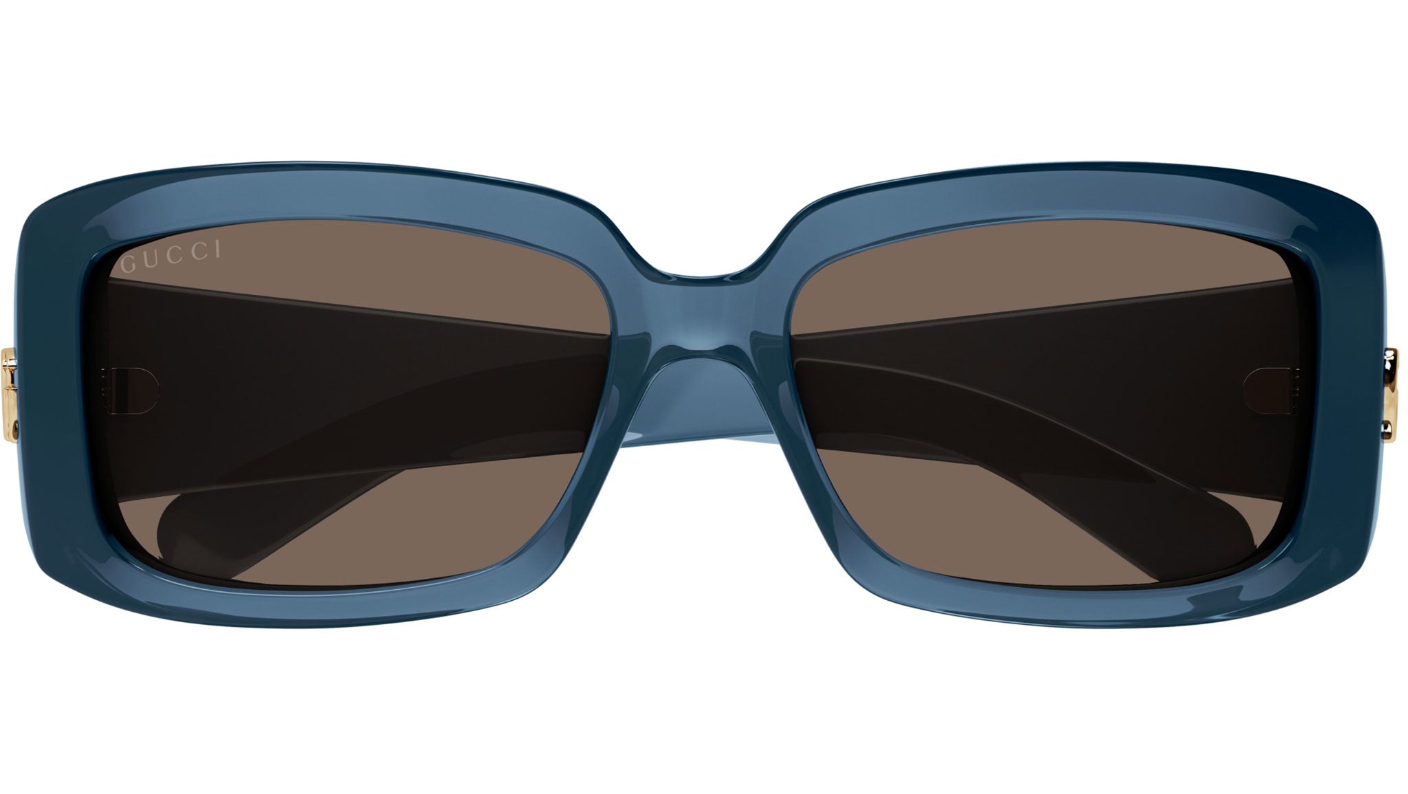 Occhiali da sole Gucci linea GG Logo modello GG1403S 003 in iniettato petrolio trasparente lucido con aste color blu e lenti marrone tinta unita.
