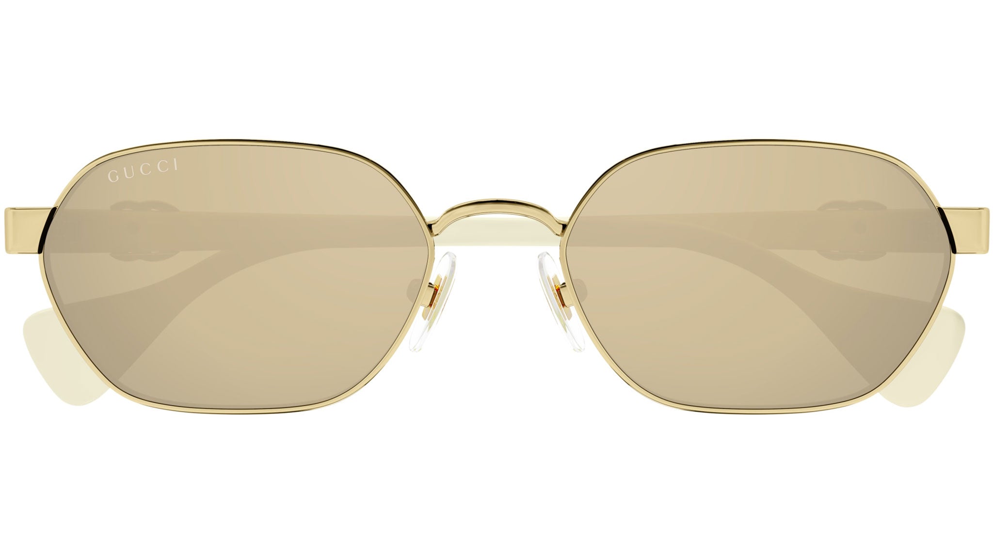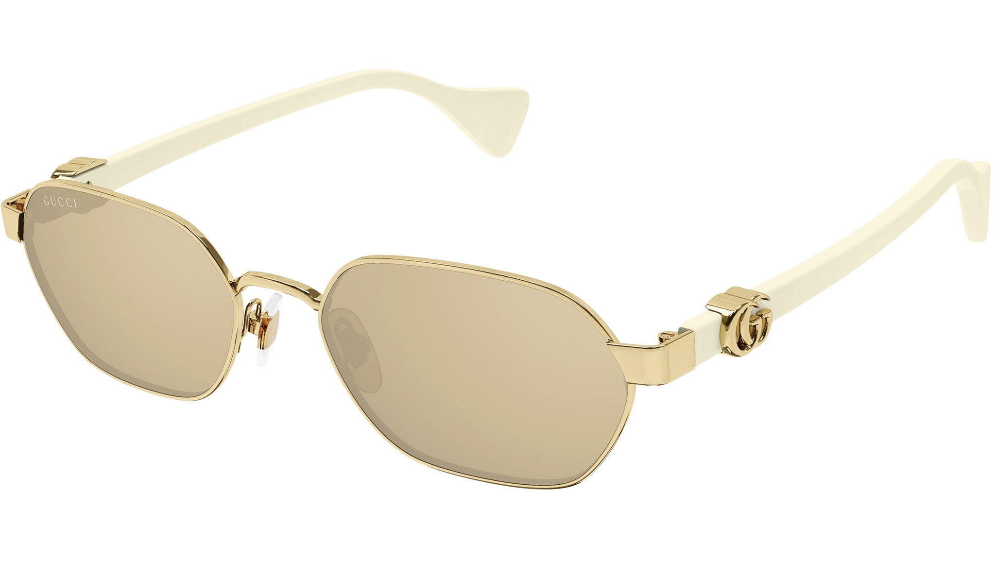 Occhiali da sole Gucci linea GG Logo modello GG1593S pantos in metallo codice colore 002 oro endura lucido con aste avorio e lenti color nudo solido / interno lampo.