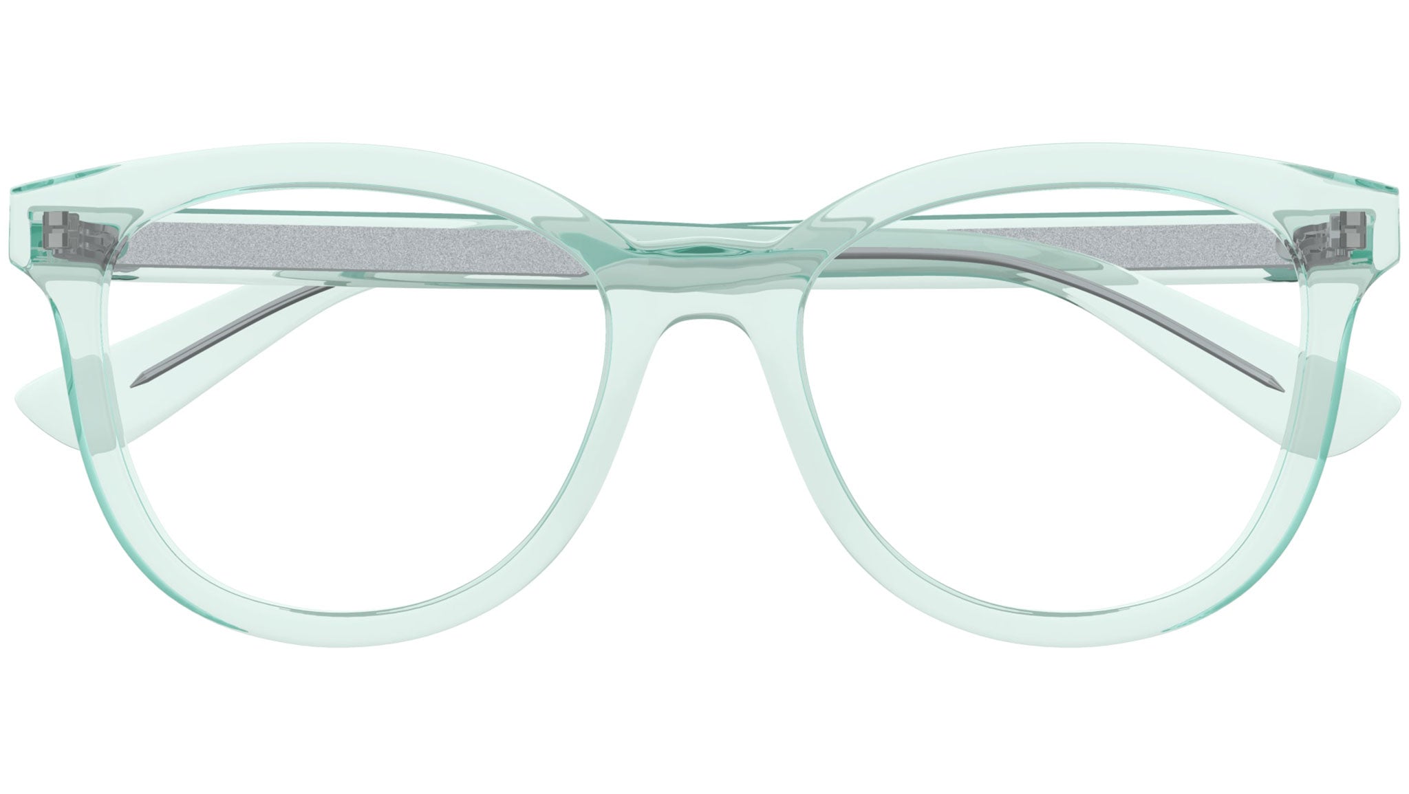 Occhiali da vista Gucci modello GG1687O linea GG Logo in acetato riciclato forma a gatto codice colore 004 verde menta trasparente lucido con aste in verde e lenti demo. Rivenditore autorizzato Gucci online. Gli occhiali vengono consegnati con custodia e accessori originali e sono coperti dalla garanzia ufficiale di 12 mesi del produttore.