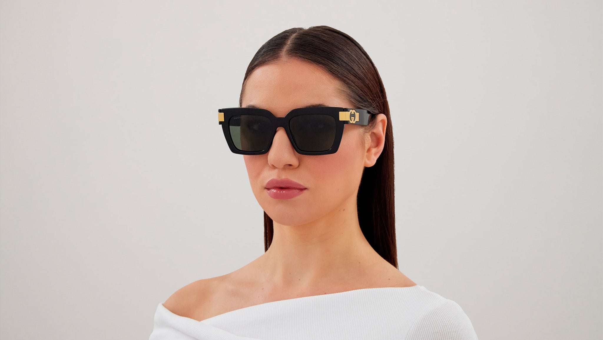 Occhiali da sole Gucci modello GG1689S linea GG Logo in iniettato forma a gatto codice colore 001 nero lucido con aste nero e lenti grigio tinta unita. Rivenditore autorizzato Gucci online. Gli occhiali vengono consegnati con custodia e accessori originali e sono coperti dalla garanzia ufficiale di 12 mesi del produttore.