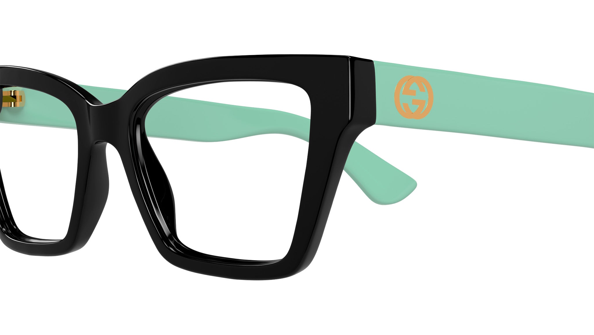 Occhiali da vista Gucci modello GG1715O linea GG Logo in iniettato forma a gatto codice colore 004 nero lucido con aste in verde e lenti demo. Rivenditore autorizzato Gucci online. Gli occhiali vengono consegnati con custodia e accessori originali e sono coperti dalla garanzia ufficiale di 12 mesi del produttore.