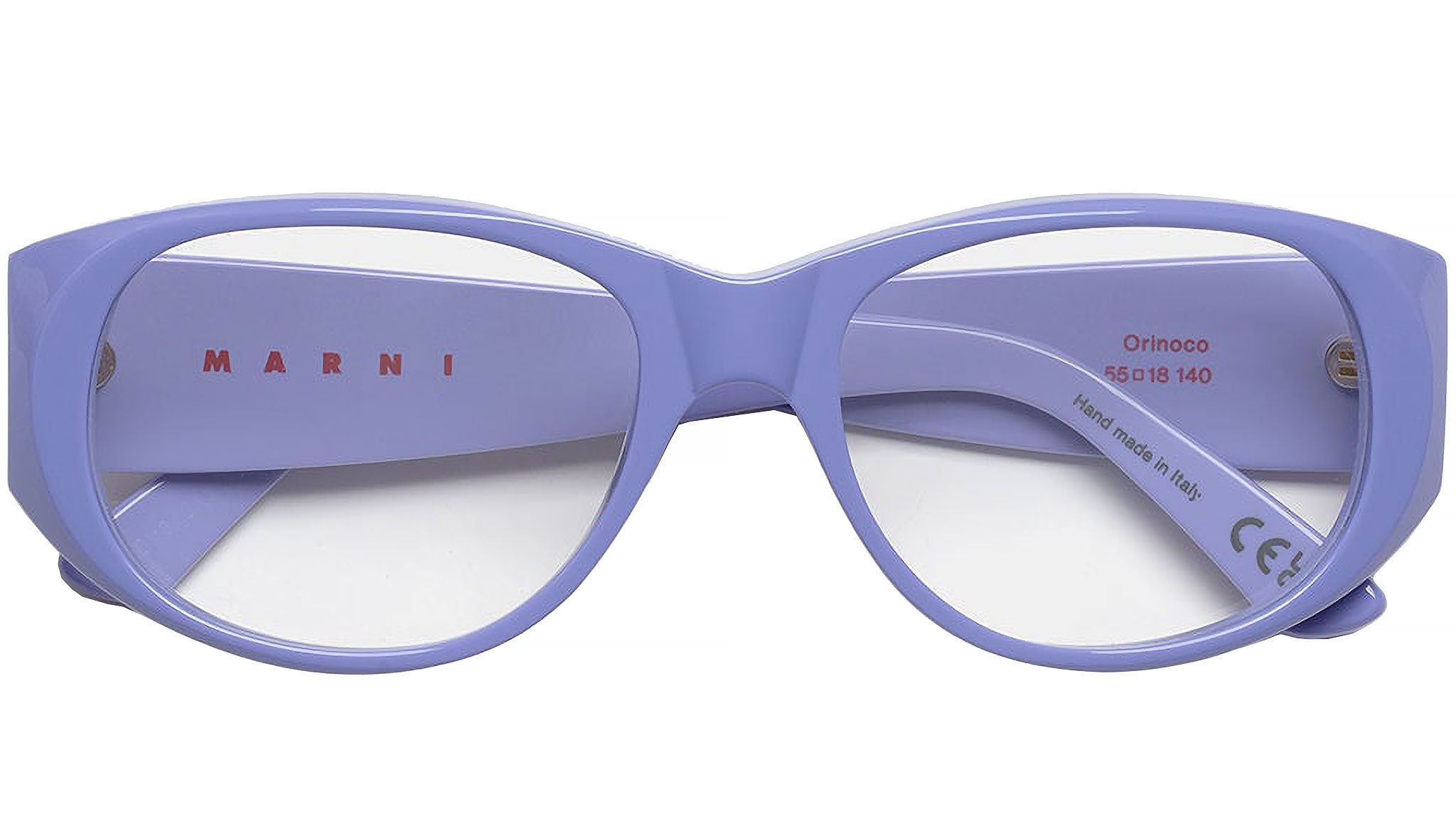 Designed exclusively for Marni, Orinoco is a wide, horizontal frame characterised by thick temples and broad lenses. The model’s characteristic V-shaped top line frames its oval lenses for a gender fluid contemporary design. Crafted from high-quality Italian acetate, the model has been polished and chiselled to form shiny, sleek rims that are comfortable in extended Optical use. This version comes in a bold solid lilac acetate with gold decors. Sizes: R Lens Width: 55 mm. Frame Front: Frame Side: 140 mm. Product Code Size R: DV8