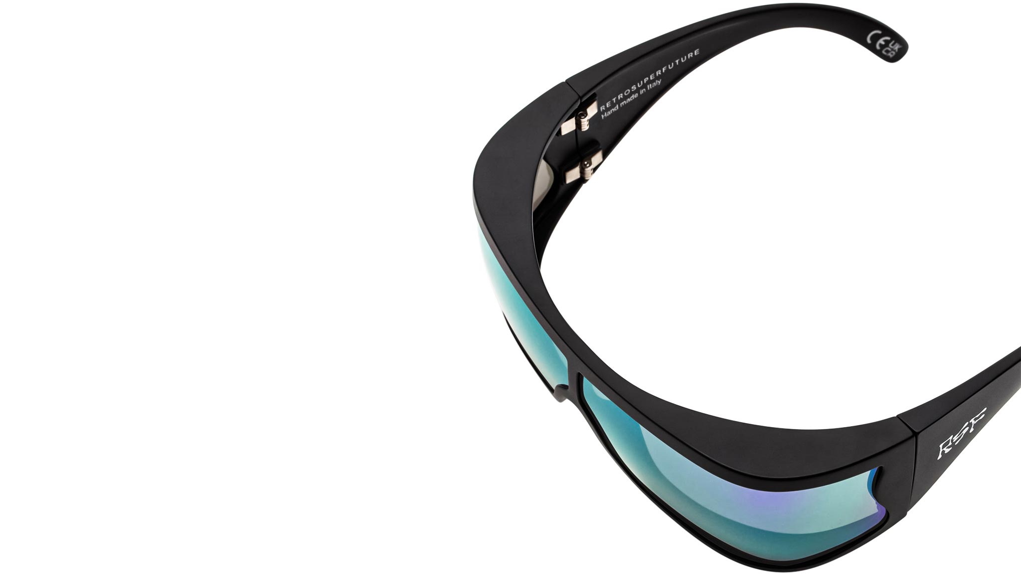 Bones is a unique hybrid between an oversized embracing sports shield, a unique high fashion frame and a raver’s dream. Bones’ thick yet functionally lightweight structure is composed of TR90 material. This thermoplastic material is commonly used in technical performance eyewear due to its ultra-resistant and ultra-lightweight properties. Bones is an eyewear piece of many strong characteristics, from the TR90 as a choice of material, the oversized wrap around design with its fresh curvy details to the selection of the lens. The lens is always s key player in RSF’s game, balancing aesthetic with function. Bones mounts an extra special, extra large Carl Zeiss wrap around ‘toric’ shield in a selection of astounding colored mirror finishes. Available in black matte TR90 with faded multicoloured mirrored lenses and silver details. Sizes: R Lens Width: 82 mm. Frame Front: Frame Side: 144 mm. Product Code Size R: 6A2