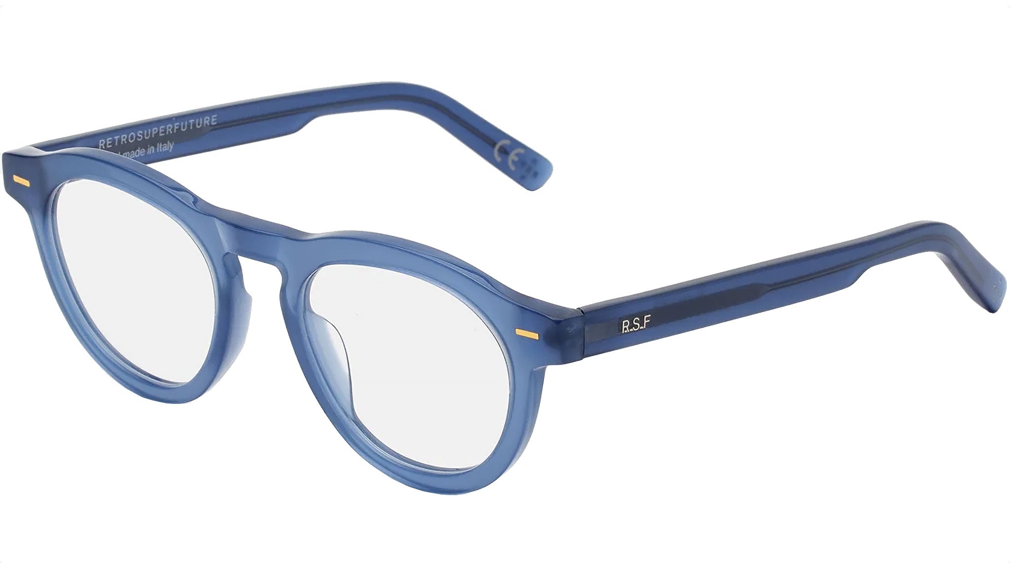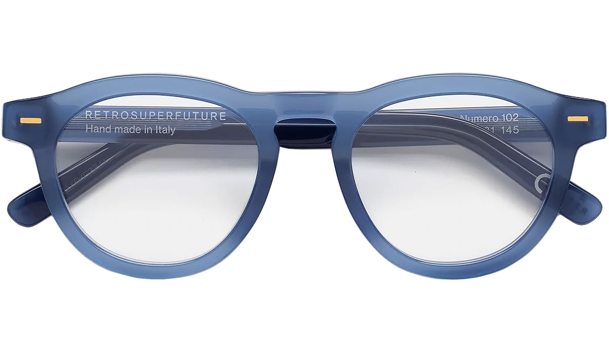 Numero 102 by Retrosuperfuture is a playful and casual rounded silhouette designed to be worn all-day, everyday. Characterized by its higher, extra comfy nose bridge design and RSF signature sturdy acetate rims. This shape is a slightly larger version of familiar rounded models: a reinterpretation of classic more fitted frames. To boost its character, Numero 102 was equipped with sophisticated geometric metal studs and linear temples. This version comes in an elegant opaline blue acetate. Sizes: R Lens Width: 50 mm Frame Front: Frame Side: 145 mm Product Code Size R: UDI
