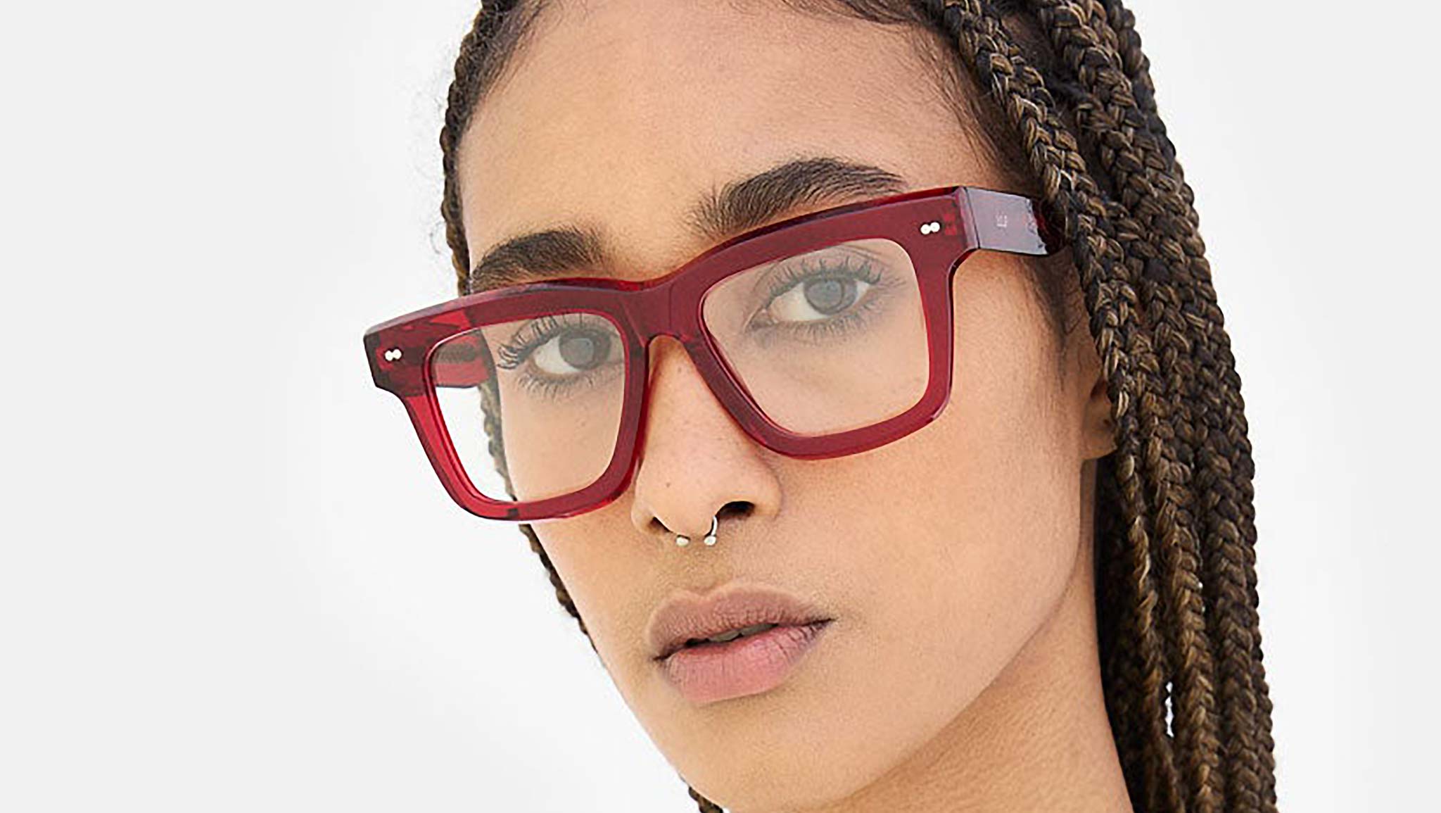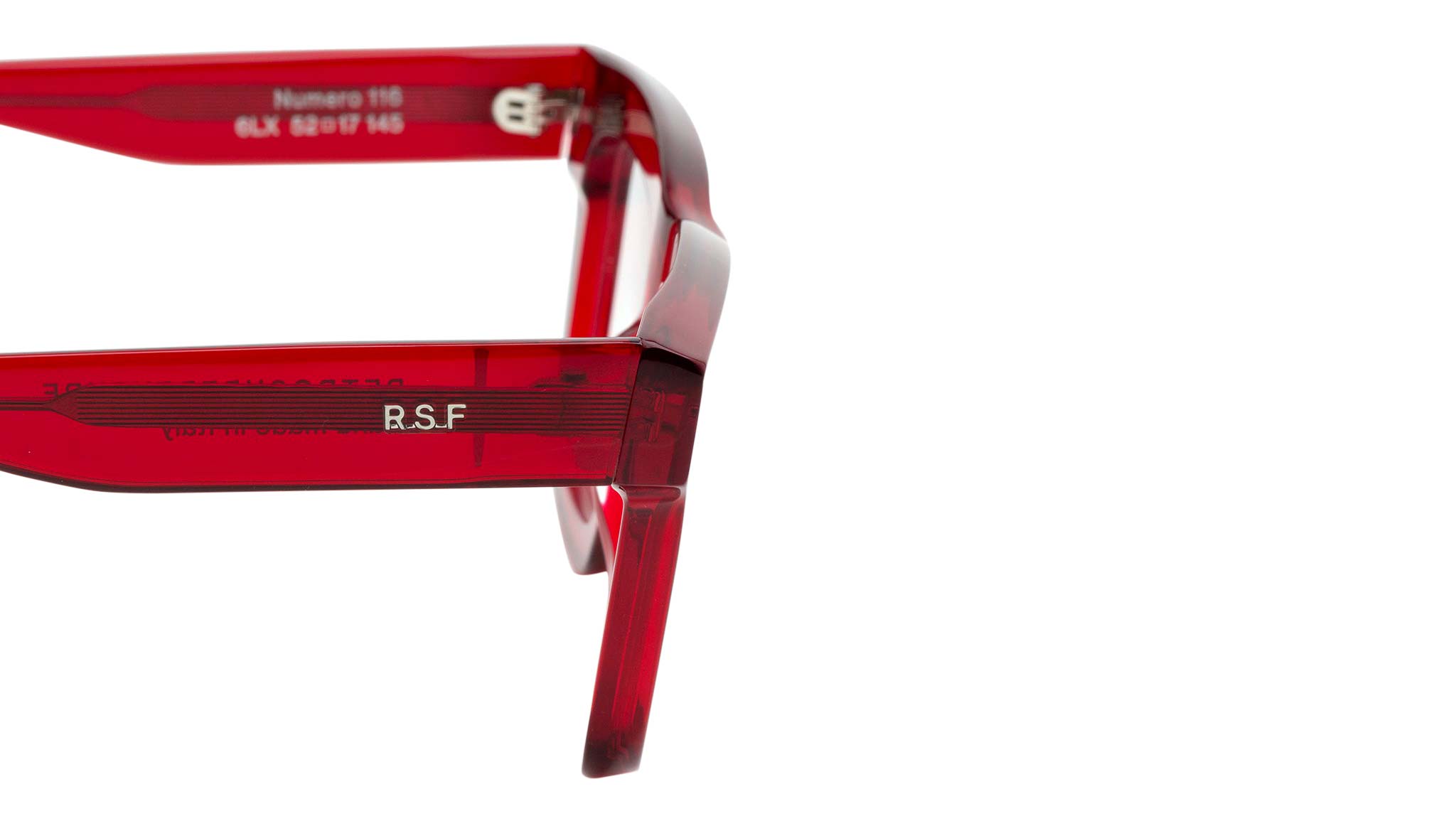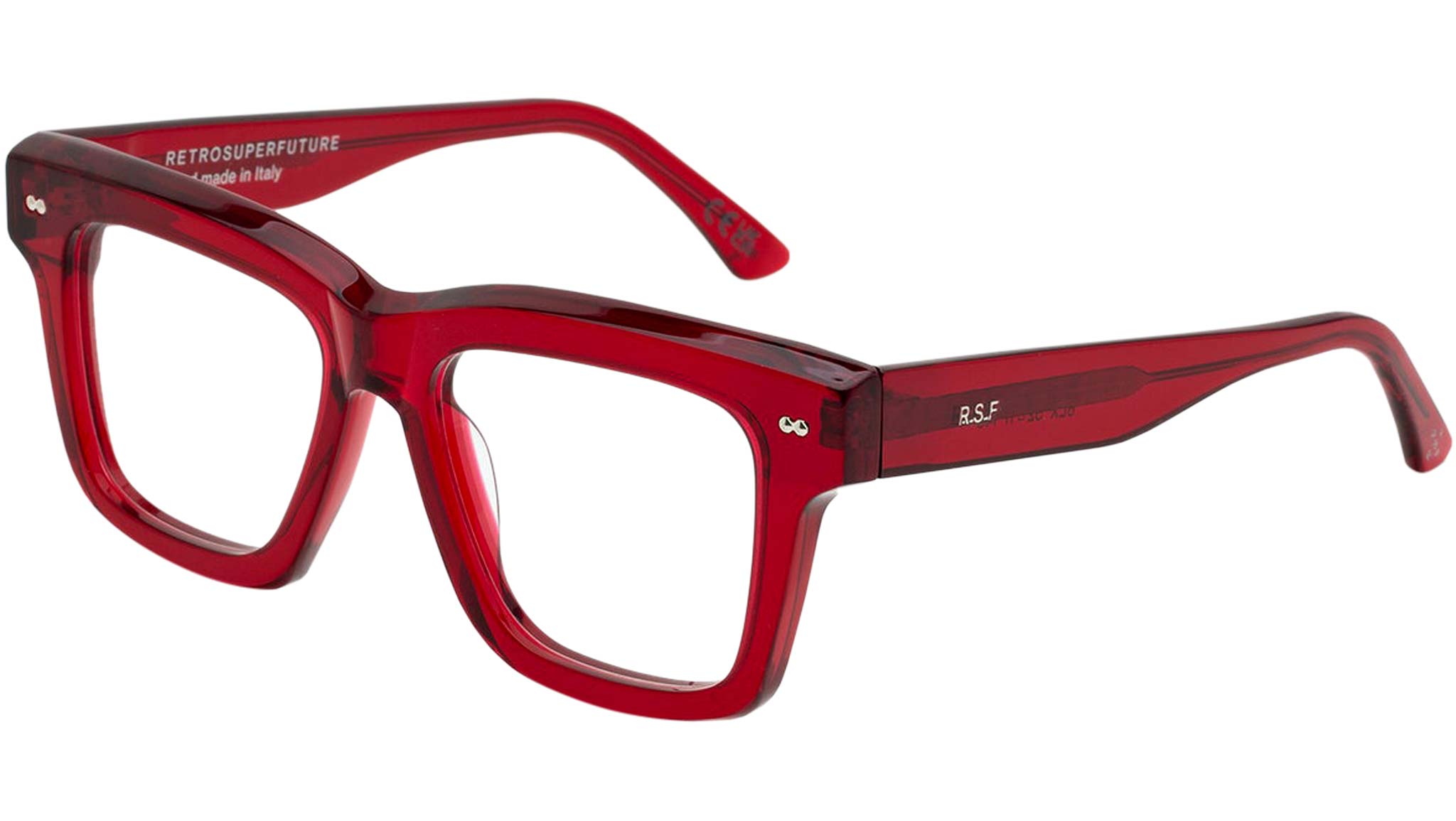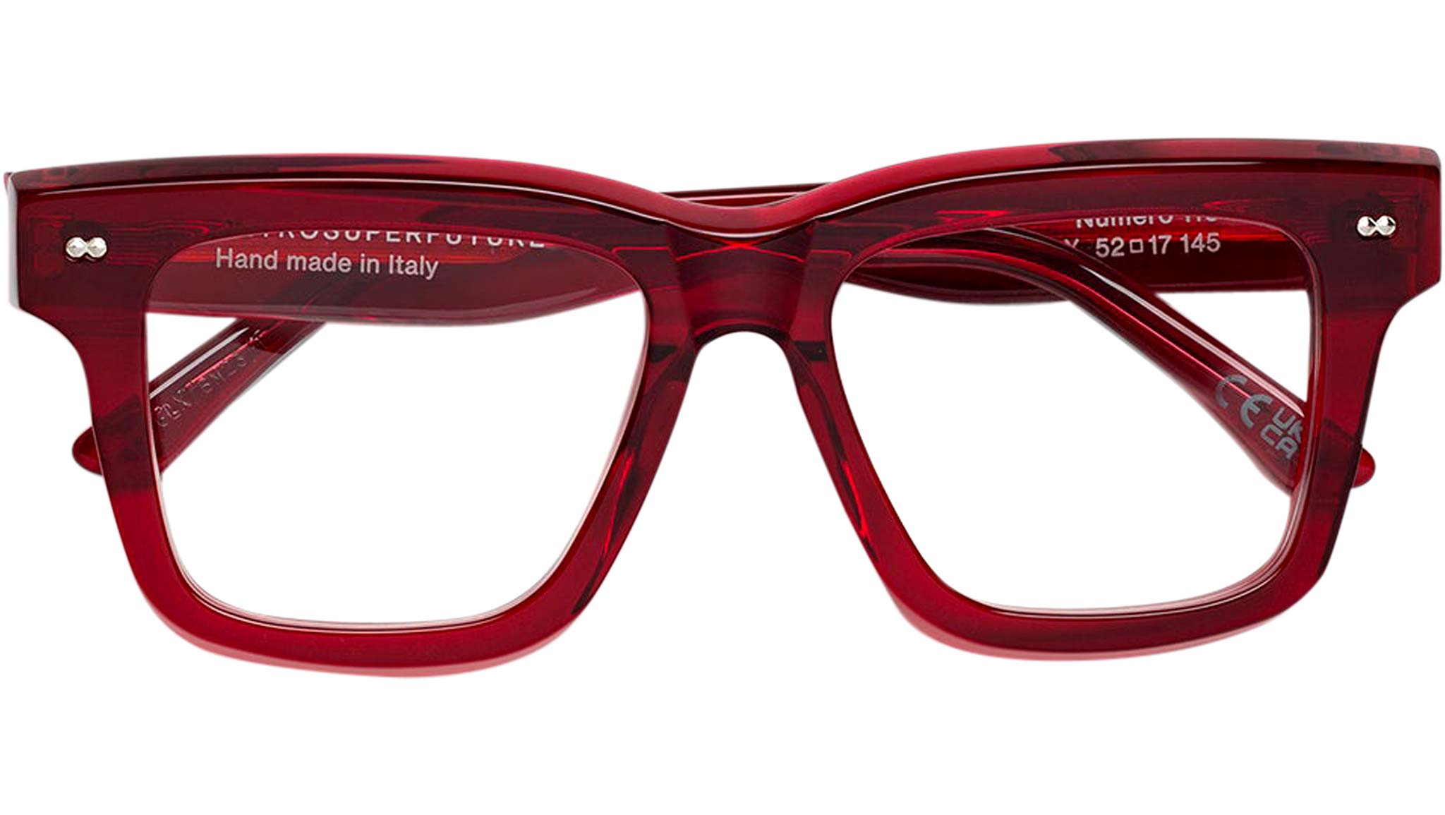 Numero 116 by Retrosuperfuture is a bold Optical frame characterized by an oversized design that reinterprets iconic sun shapes for everyday use. The model features sturdy acetate rims, a key feature of RSF eyewear, chiseled for lightness and comfort, without compromising its thick build. This is a model designed for those looking for a statement yet timeless piece of eyewear. This version comes in a dark, deep red acetate. Sizes: R Lens Width: 51 mm. Frame Front: Frame Side: 145 mm. Product Code Size R: 6LX