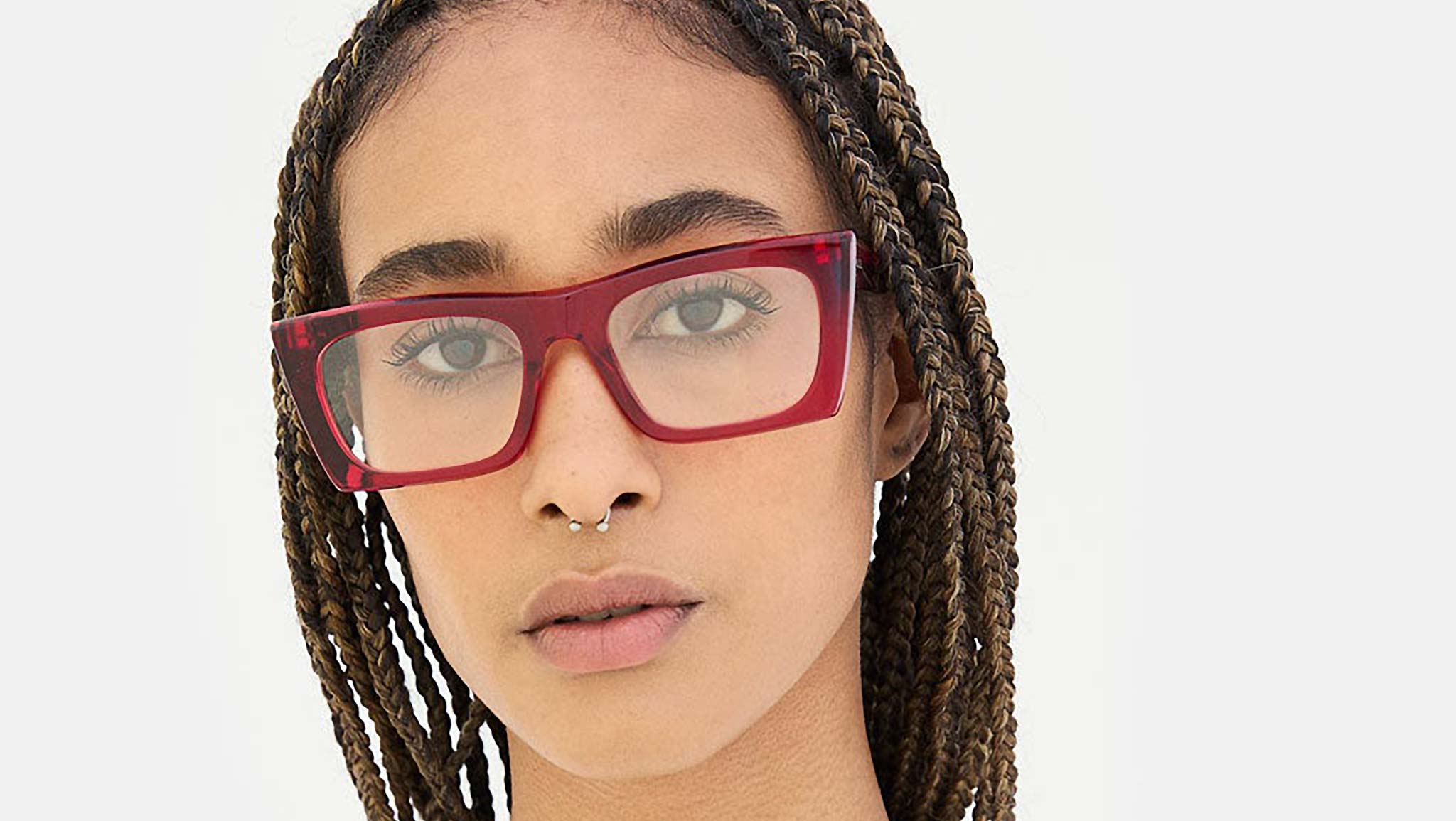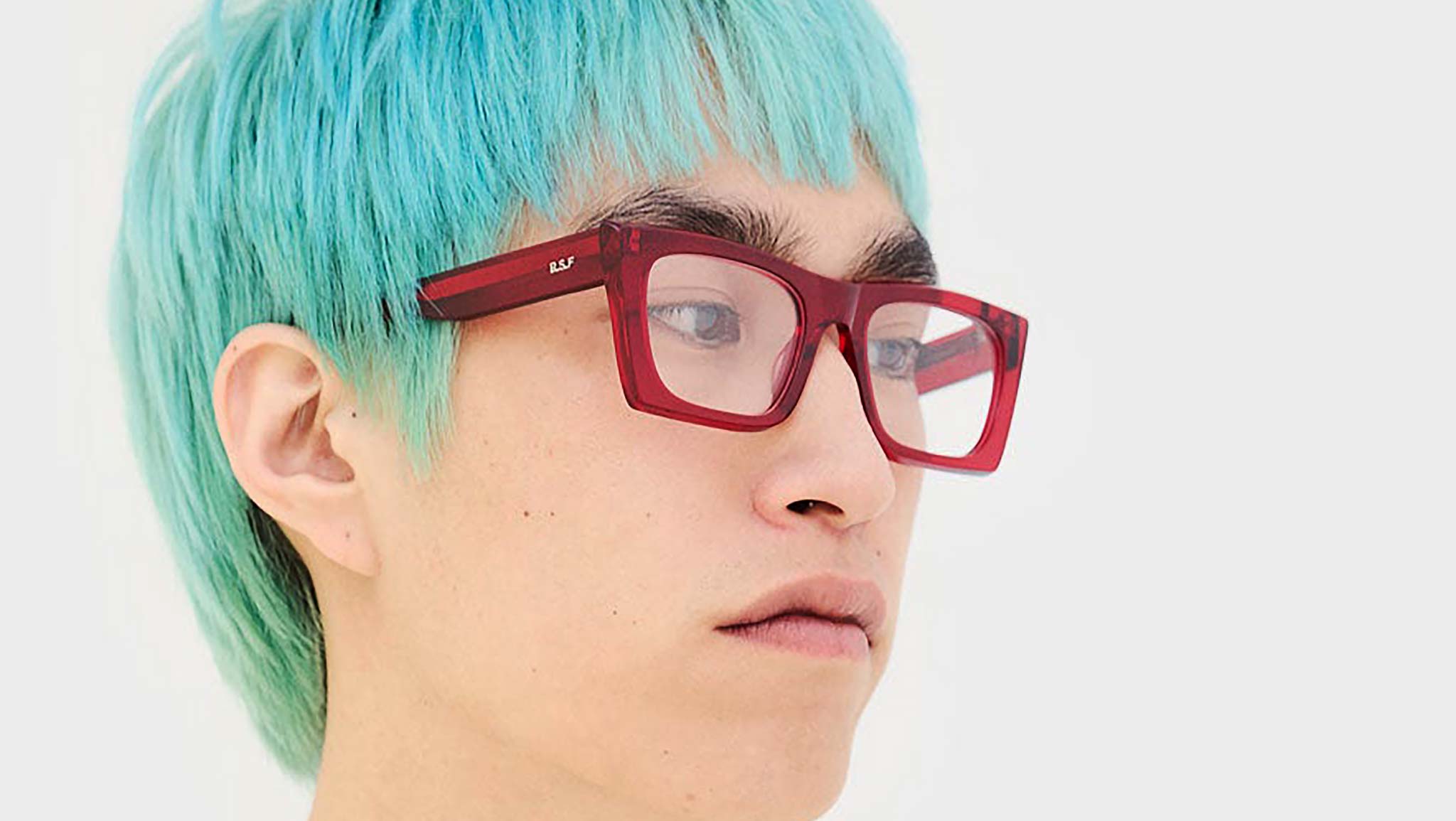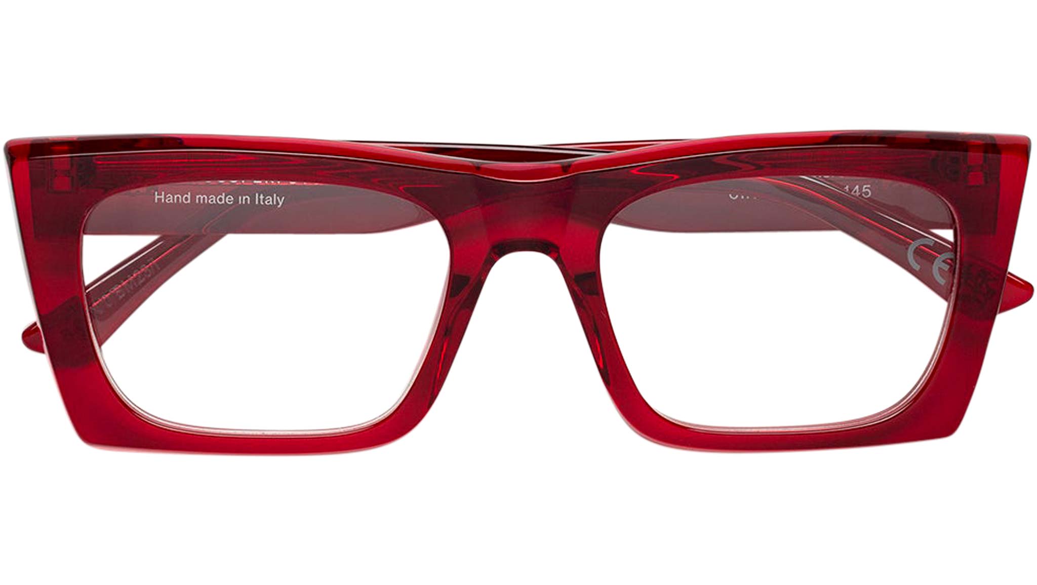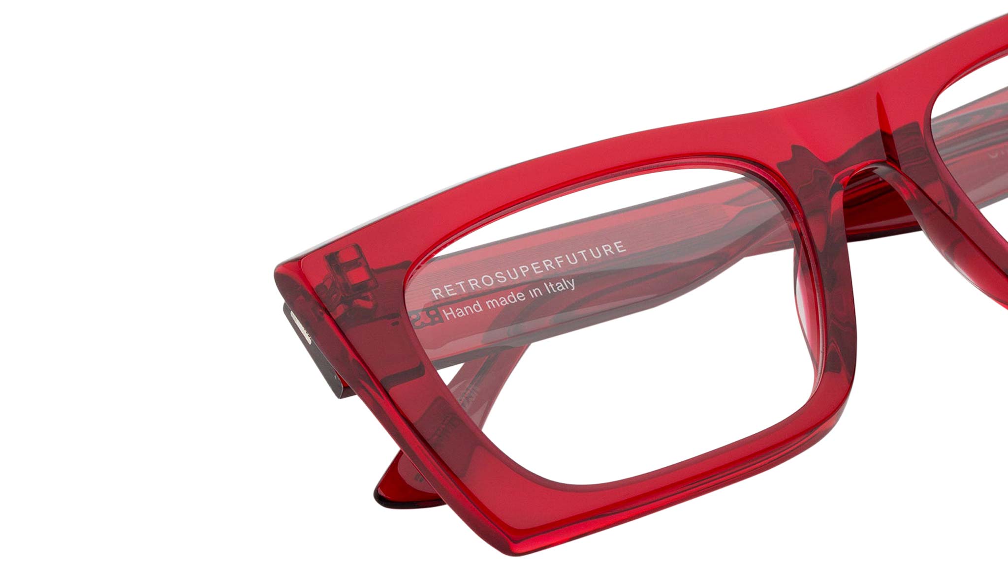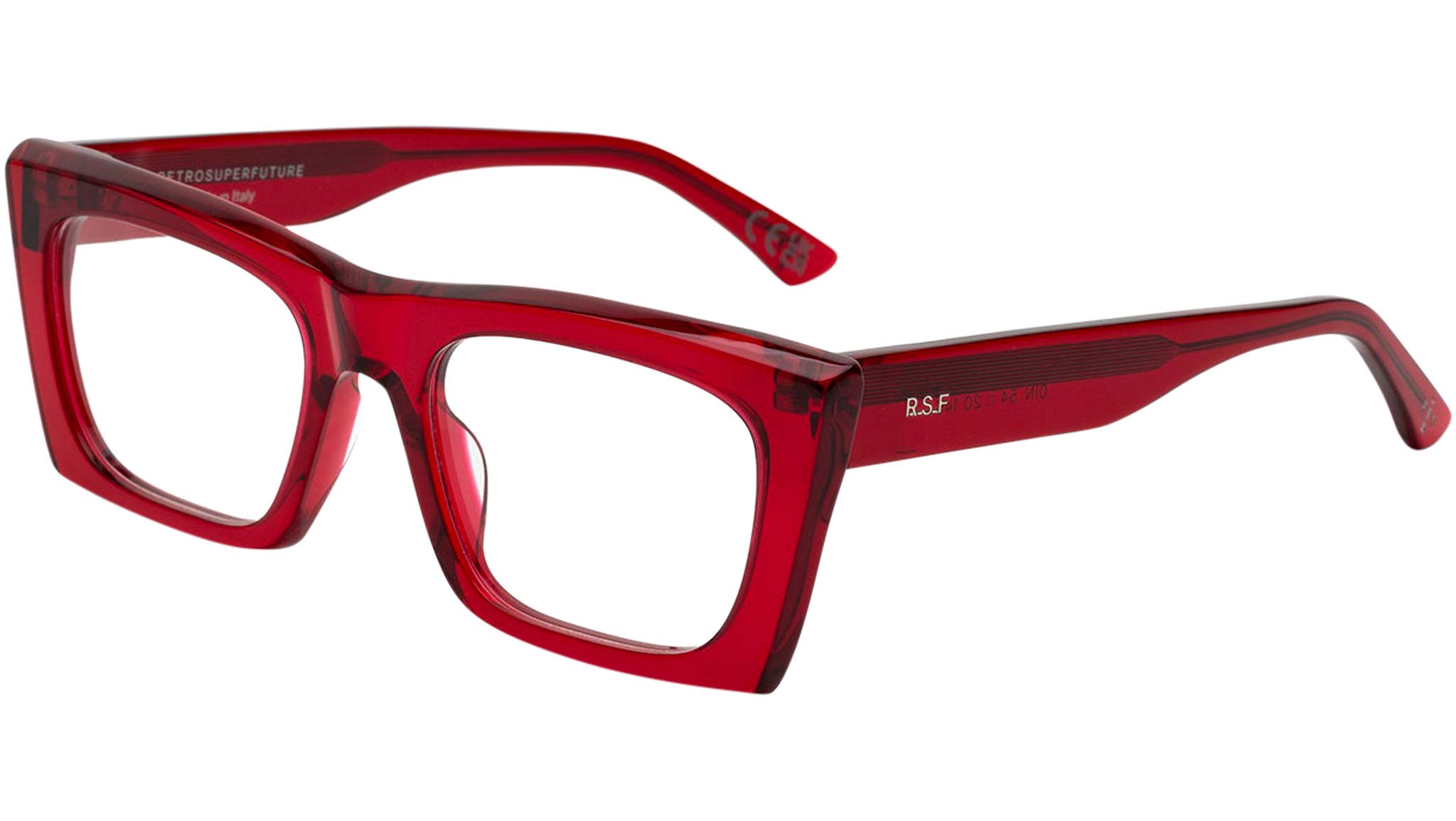 Numero 117 by Retrosuperfuture is an everyday piece of eyewear with character. The model features a sharp, angular profile, with pointy detailing on the temples giving it the characteristic stand-out look it has. A compact, sturdy design, Numero 117 is an elegant yet playful silhouette with a street edge. This model comes in a deep red acetate that highlights its sharp features. Sizes: R Lens Width: 54 mm. Frame Front: Frame Side: 145 mm. Product Code Size R: 0IN