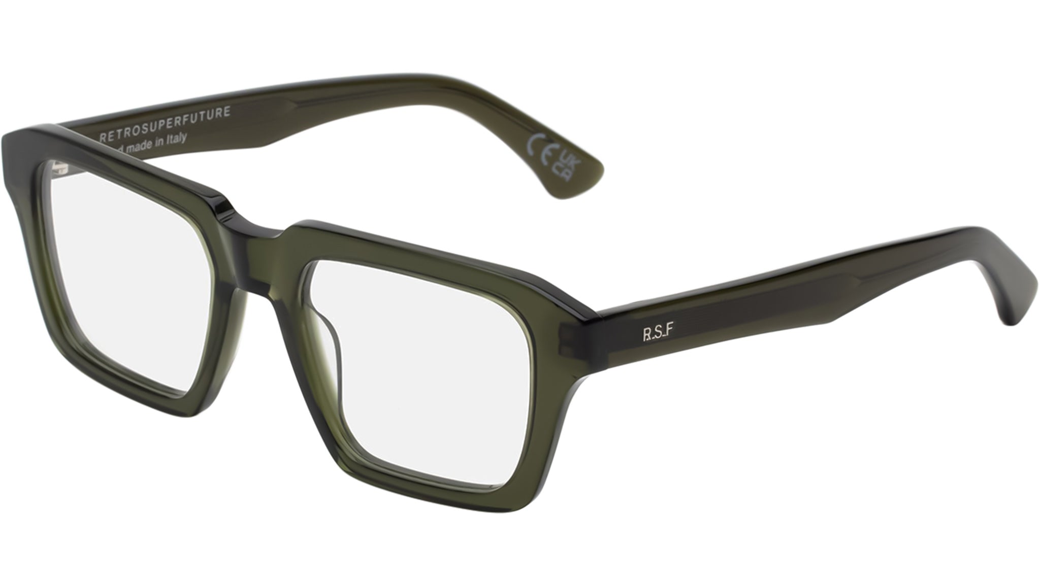 Numero 121 by Retrosuperfuture: an oversized  silhouette with a unique character. This optical model features a sturdy geometric acetate frame and temples that fuse a 70s aesthetic with a contemporary touch. This version of N121 is available in crystal grey acetate. Sizes: R Lens Width: 53 mm. Frame Front: Frame Side: 145 mm. Product Code Size R: HQ9