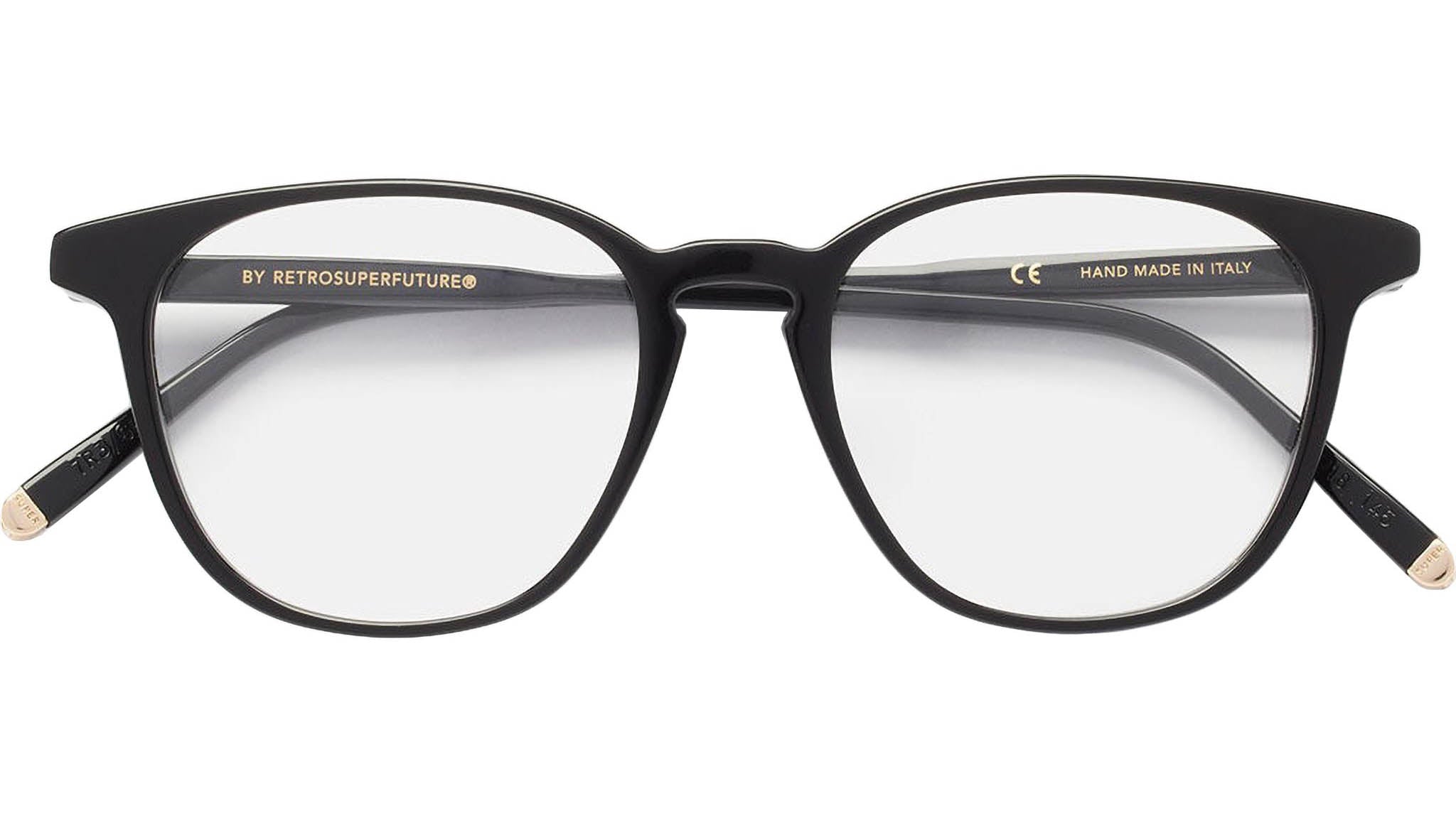 Numero 51 by Retrosuperfuture is a timeless everyday frame, characterized by a square outline and carefully crafted rims. With its wide rectangular lenses and sturdy temple tips this is a minimal everyday silhouette that comes in a shiny black acetate with gold metal detailing. Prescription lenses not included. The box contains a hard case and a cleaning cloth.