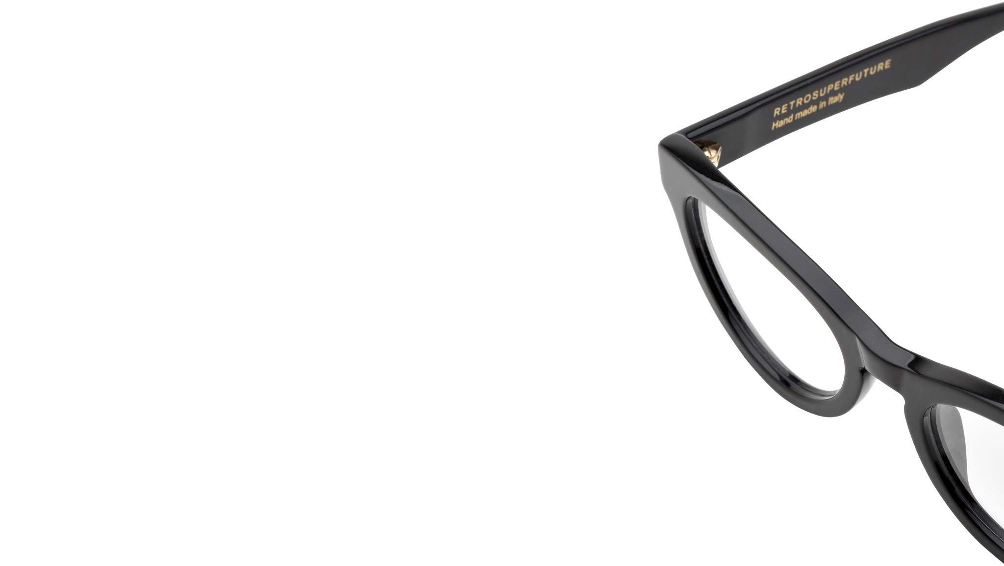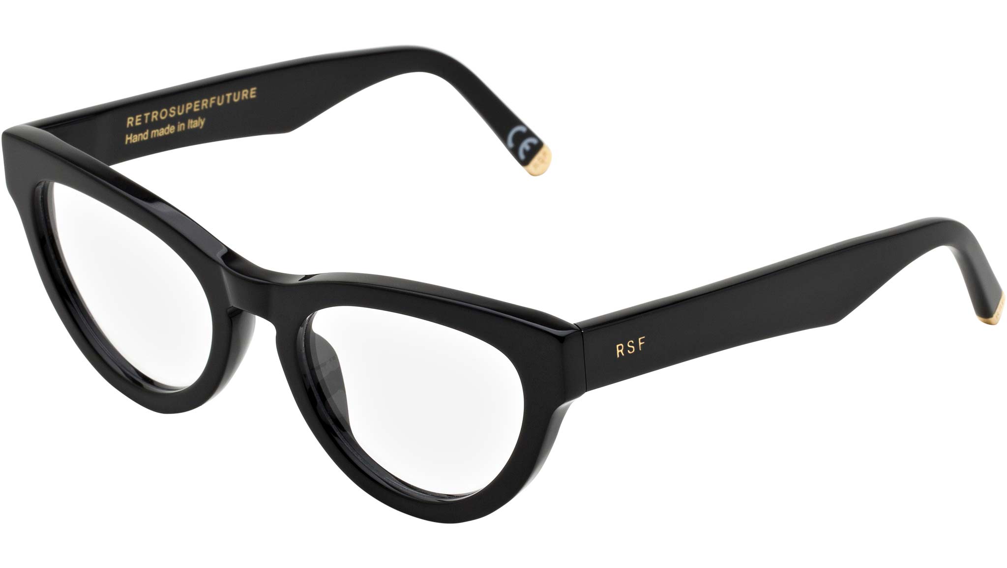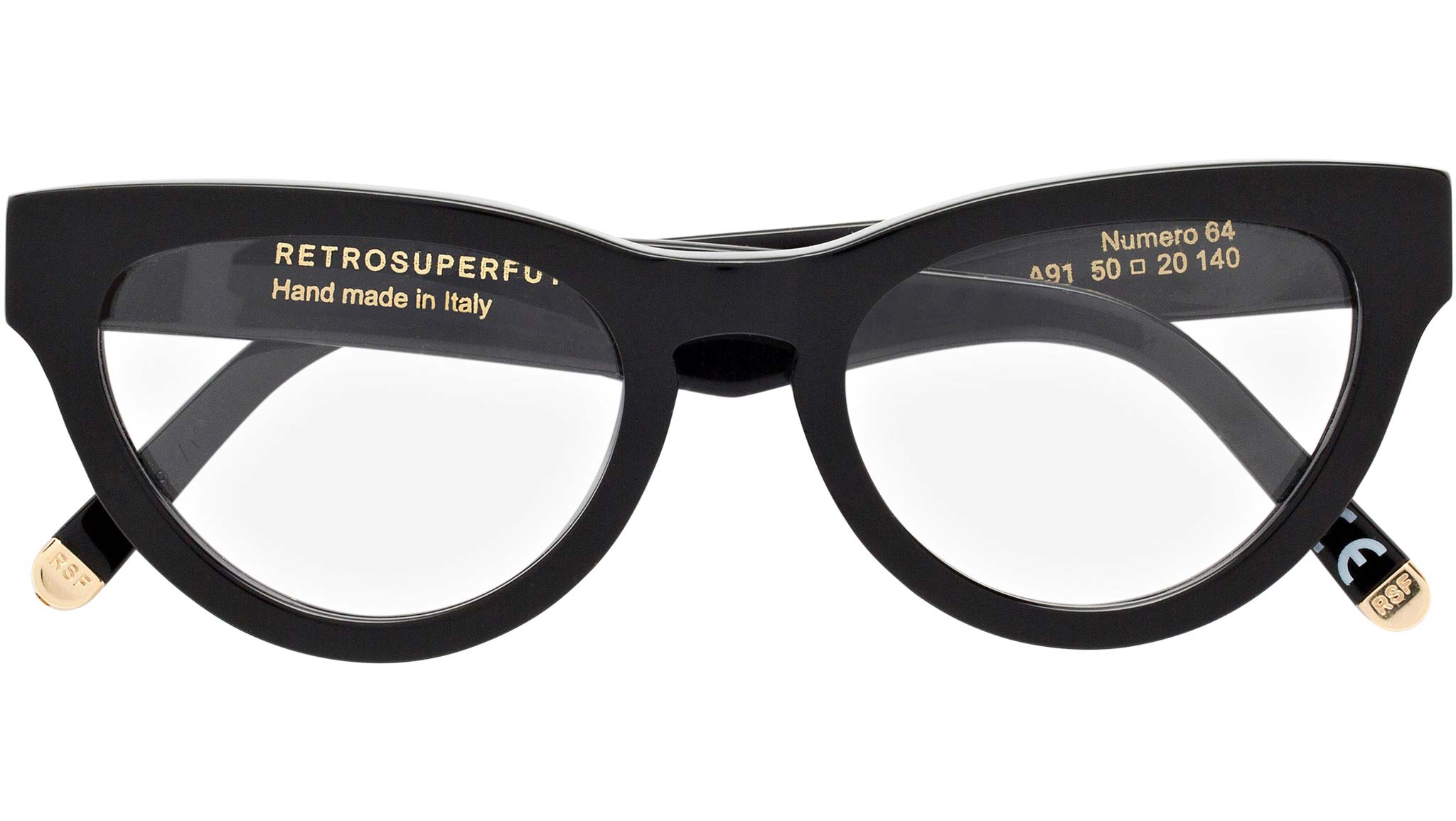 Numero 64 by Retrosuperfuture is an iconic cate-eye silhouette designed for the all-day optical statement. The model features a bold cat-eye design, with thick rims and wide rounded lenses. This version comes in a shiny black acetate. Prescription lenses not included. The box contains a hard case and a cleaning cloth
