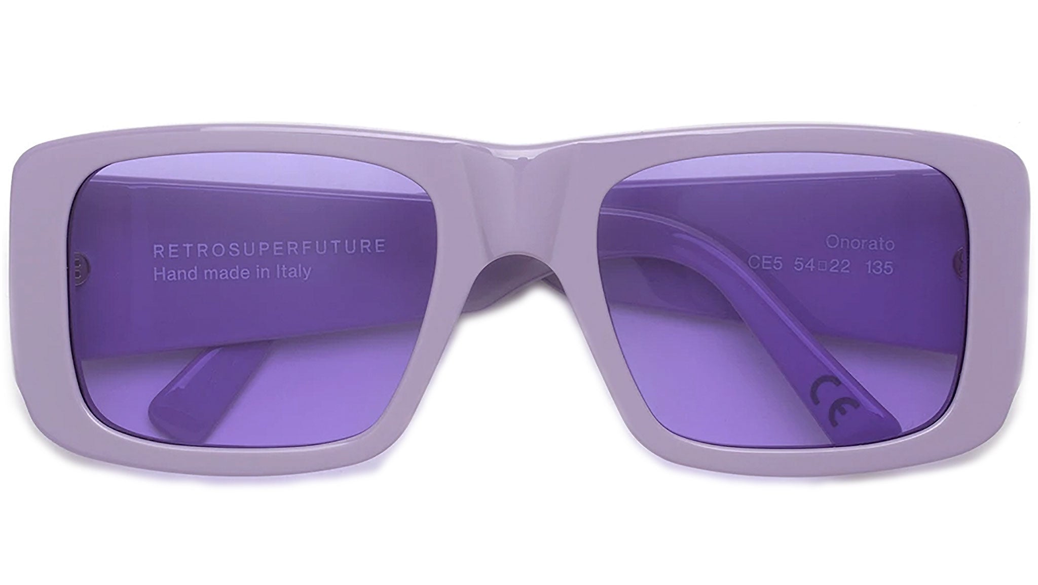 A key RSF statement piece, Onorato is a model inspired by 1970s references, from Aristotle Onassis to Miles Davis. A bold acetate frame with a sturdy, oversized design, Onorato features a straight upper line and a bold nose-bridge. Thick acetate rims curve around the temples match its distinctive wide temple tips. Oversized and with a street edge, this version comes with a lilac acetate and matching purple tinted lenses.