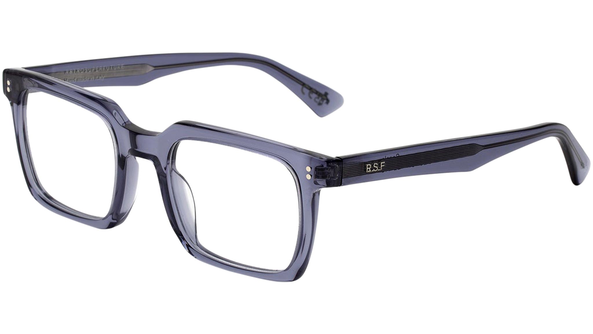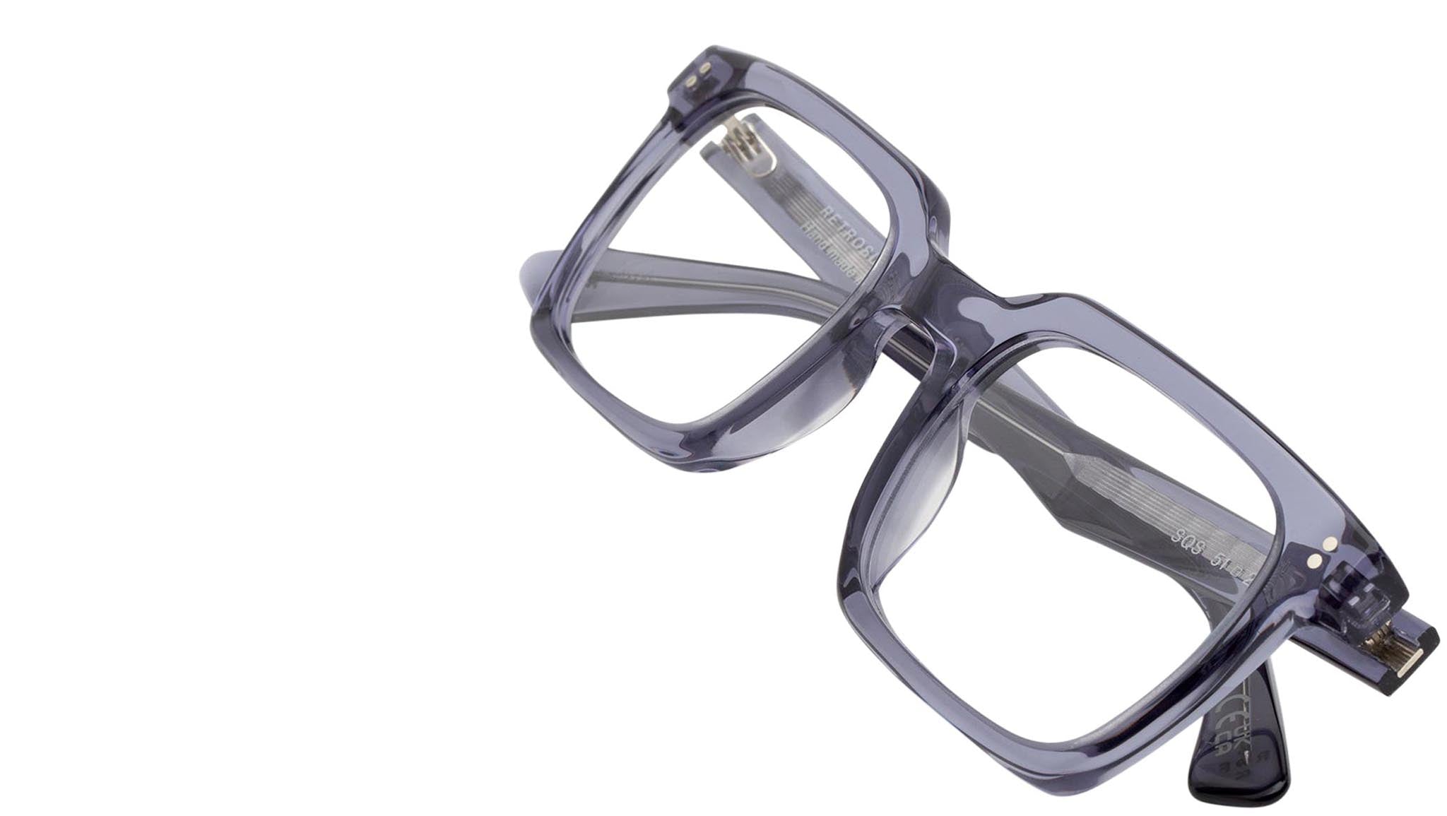 Secolo is an angular, clean shape designed for everyday optical use. A familiar silhouette, Secolo features squared rims with wide lenses for comfortable daily use. Its protruding temple tips feature two metal studs, while the lowered nose-bridge references classic vintage pieces. This version comes in an elegant blue crystal acetate. Sizes: R Lens Width: 51 mm. Frame Front: Frame Side: 145 mm. Product Code Size R: SQS