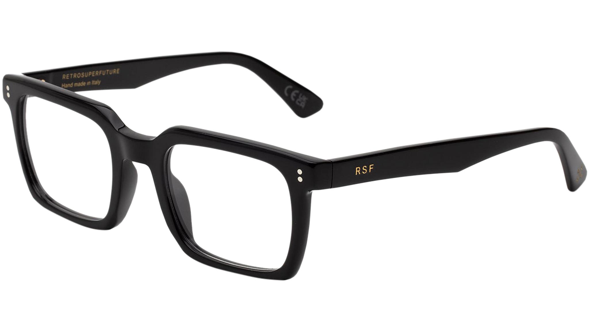 Secolo is an angular, clean shape designed for everyday optical use. A familiar silhouette, Secolo features squared rims with wide lenses for comfortable daily use. Its protruding temple tips feature two metal studs, while the lowered nose-bridge references classic vintage pieces. This version comes in an all-black shiny acetate. Sizes: R Lens Width: 51 mm. Frame Front: Frame Side: 145 mm. Product Code Size R: 8JD