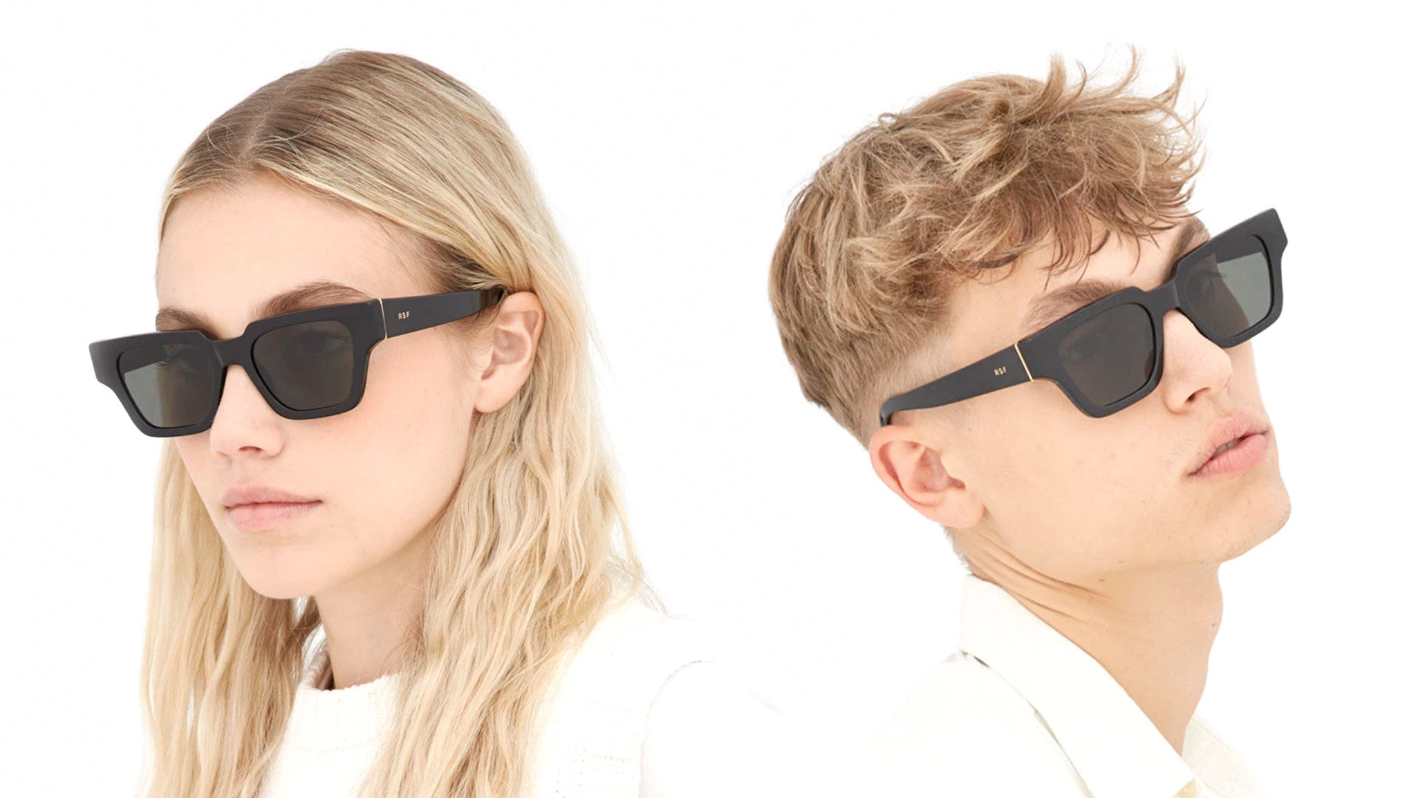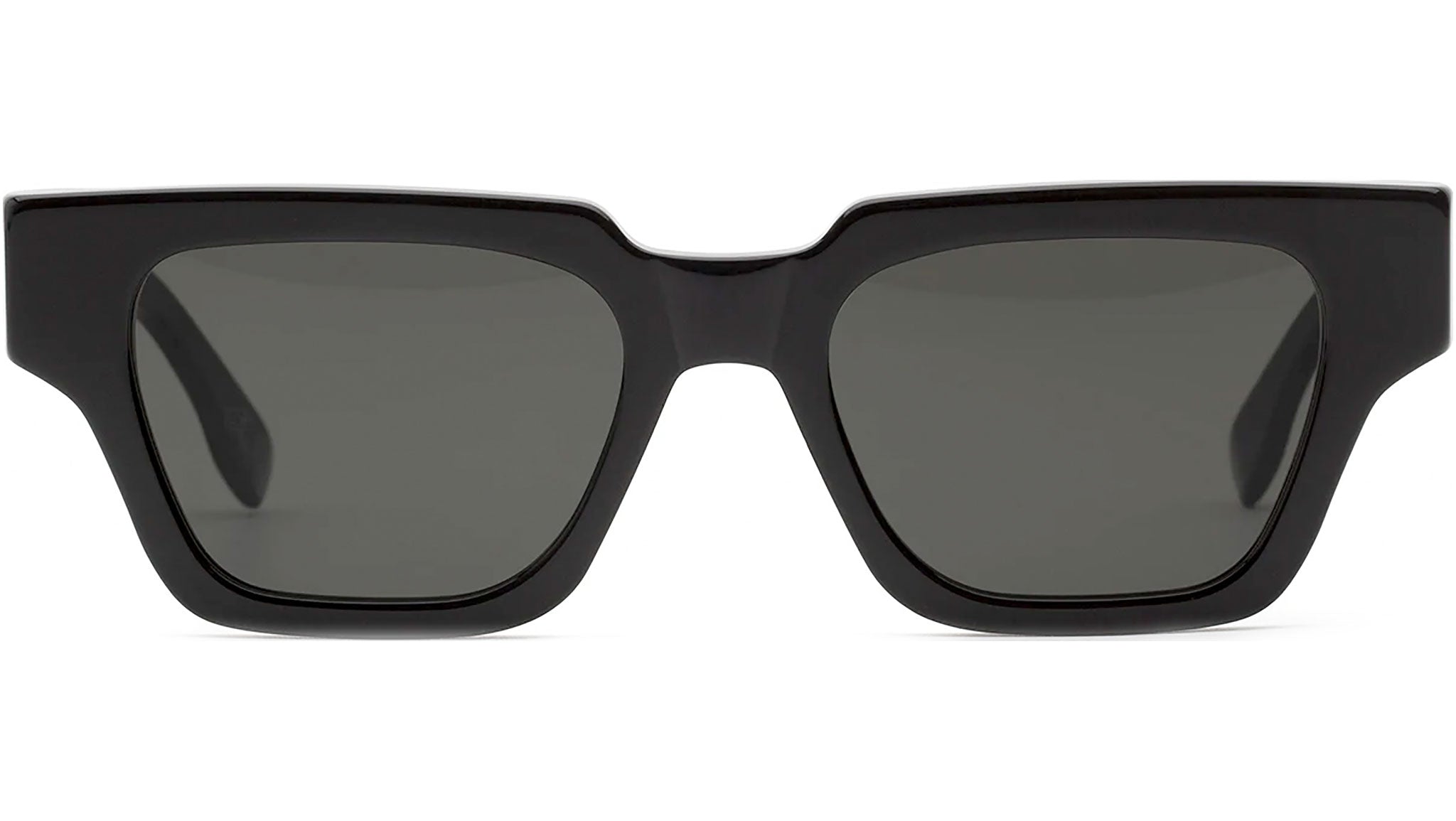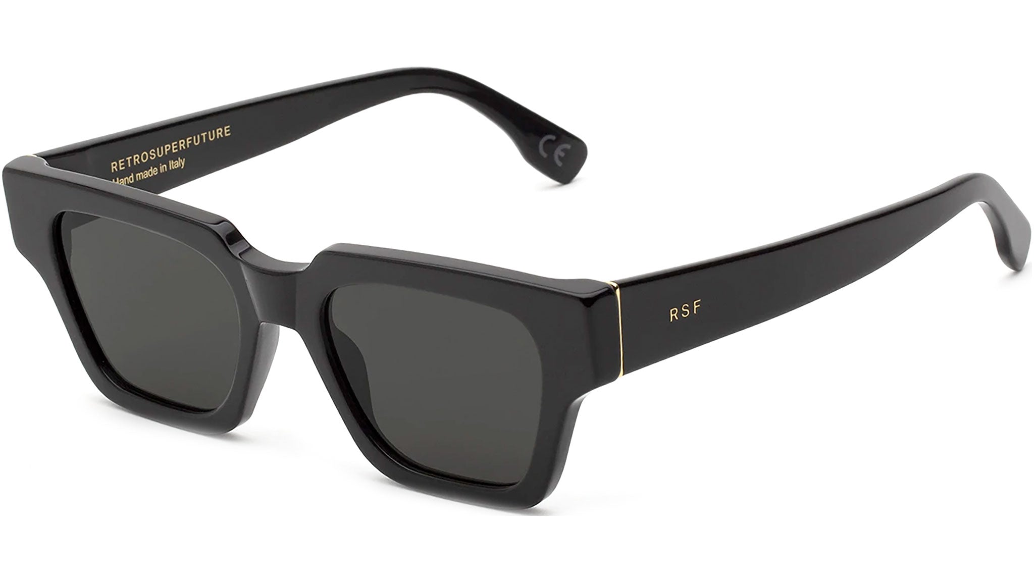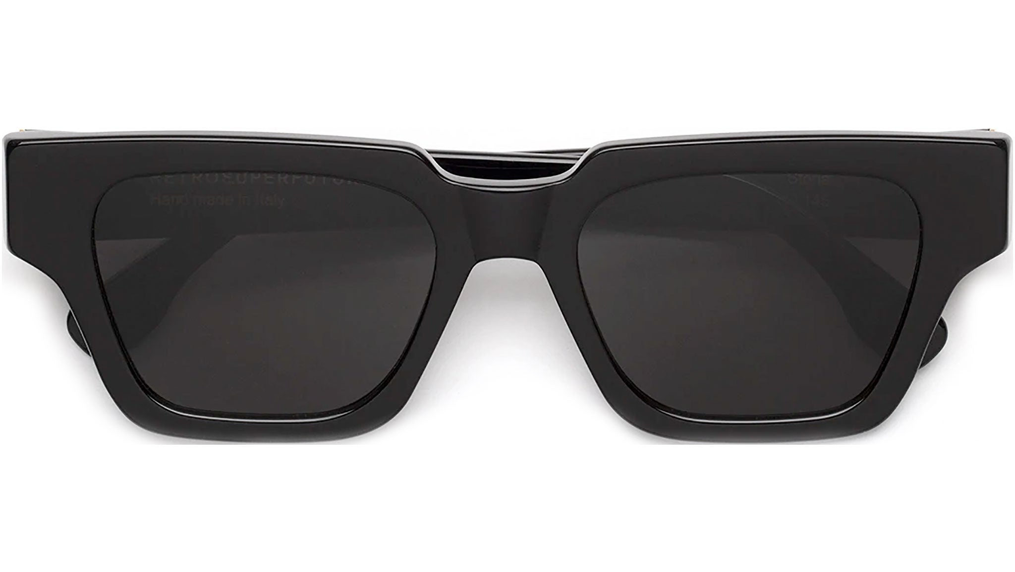 Strand black are handcrafted rectangular aceate frame sunglasses in 'classic black tone. Transparent rubber nose pads and acetate trim at temple tips. Black lenses.
