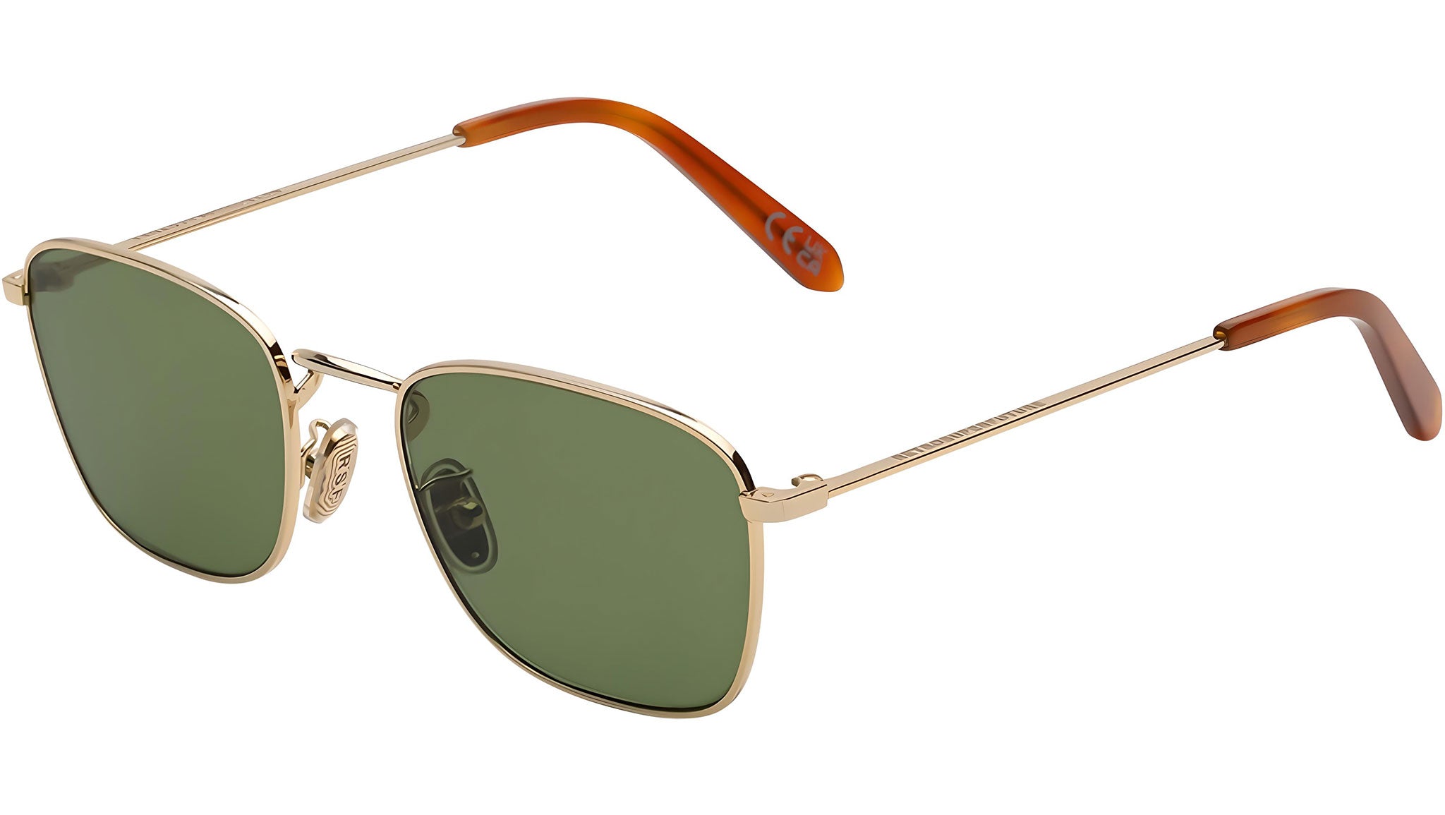 Strand is a fresh design with an essential and sleek lightweight metal frame. A single, slim yet sturdy wire is the core of the entire piece, circumnavigating squared-out lenses in high-grade tempered glass by Barberini, and finishing at the end of the frame with the temple tips which are wrapped in a thin functionally comfortable crystal acetate. This version of the Strand features gold metal paired with timeless green tempered glass lenses and dark crystal acetate tips. Sizes: R. Lens Width: 51 mm. Frame Front: 0 mm. Frame Side: 140 mm. Product Code Size R: W13.