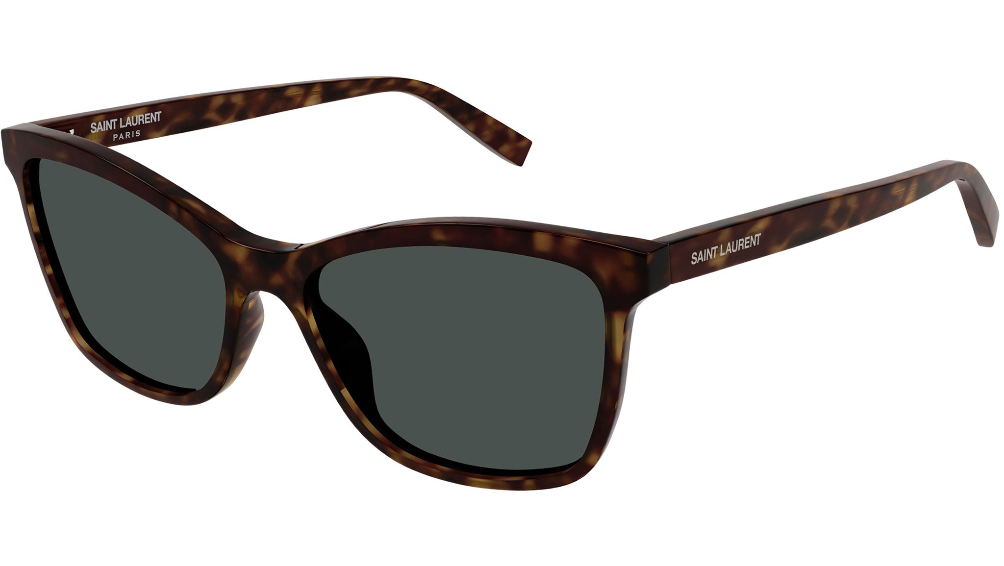 Occhiali da sole Saint Laurent modello SL 502 linea Classic codice colore 002 tartaruga scuro lucido in acetato forma cat eye con lenti color grigio fumo tinta unita.