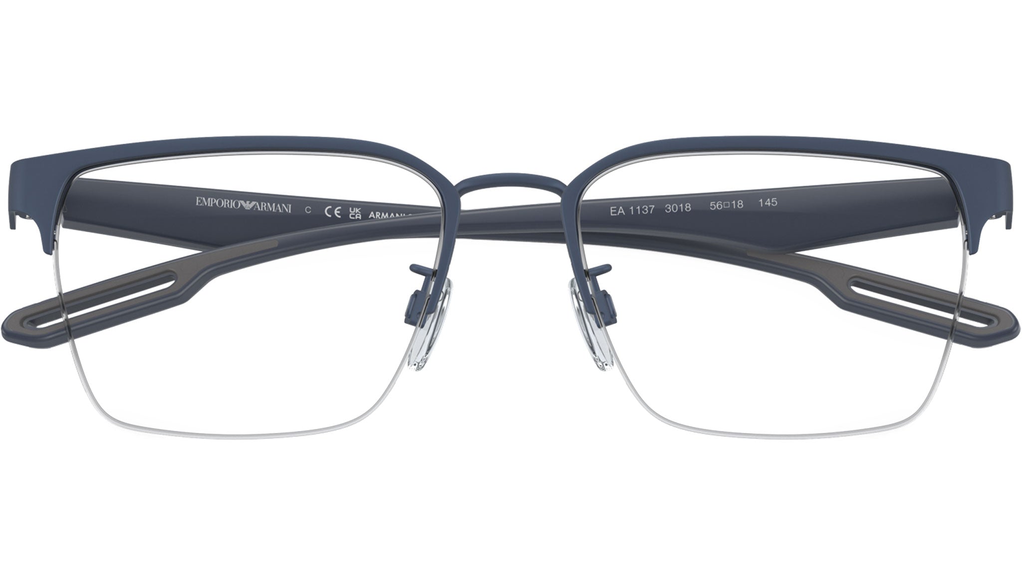 Occhiali da vista Emporio Armani linea Runway modello EA1137 codice colore 3018 con montatura semi rim in metallo blu opaco e lenti demo. Fitting: con naselli regolabili. Linea: Runway. Codice modello: 1137. Codice colore: 3018. Rivenditore Emporio Armani autorizzato online. Tutti i modelli Armani vengono consegnati con custodia e accessori originali e sono coperti da garanzia ufficiale del produttore di 12 mesi.