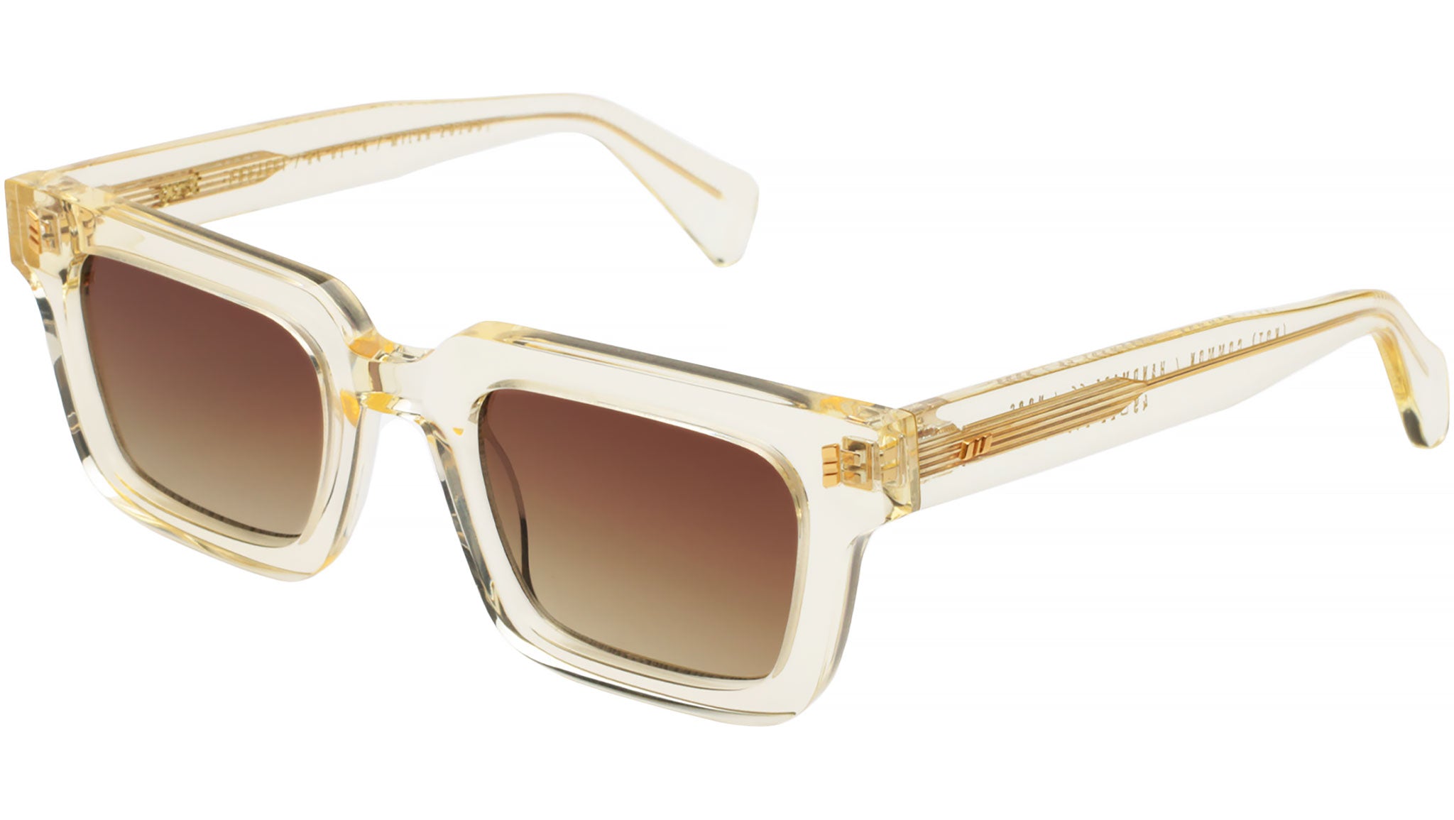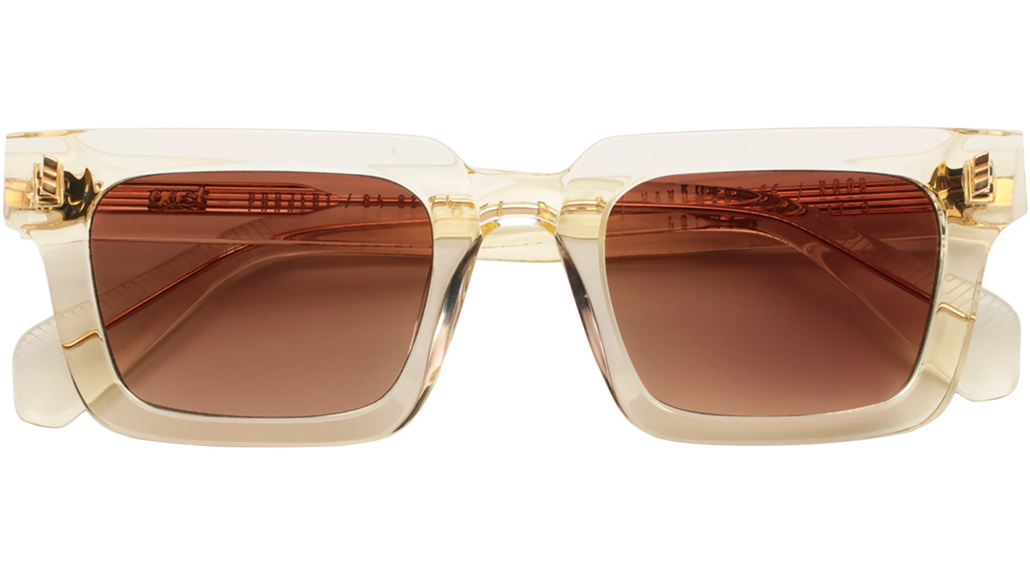 Gast (NOT) COMMON Champagne. Handmade sunglasses with champagne acetate frame and gold custom wire core. Gradient brown nylon lenses – 100% UVA / UVB protection with anti-reflective inside coating. Five barrels metal hinges and premium silver logo box with hard case and microfiber cleaning cloth.