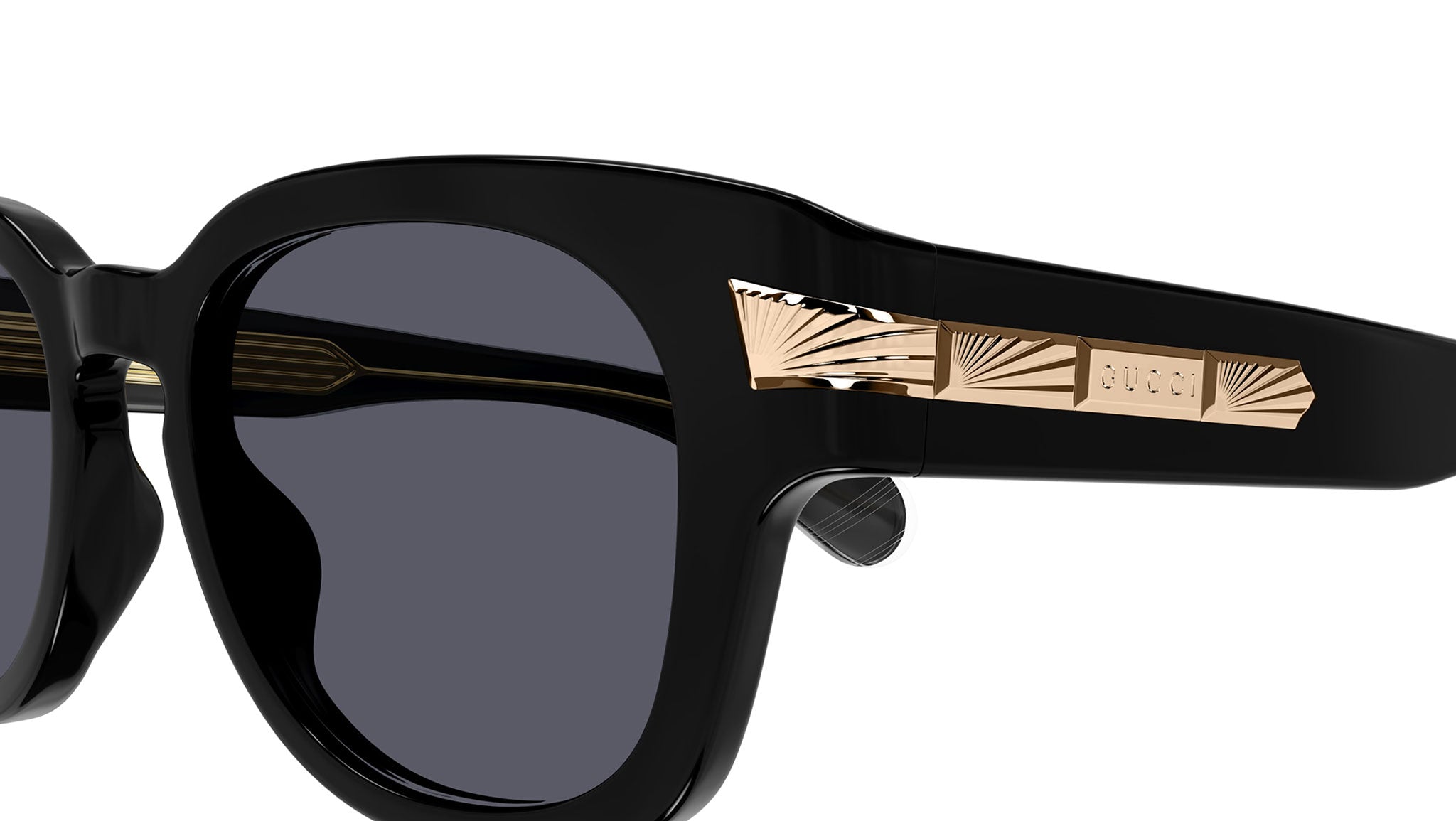 Occhiali da sole Gucci linea Lettering modello GG1518S rettangolari in acetato riciclato codice colore 001 nero lucido tinta unita con aste nero e lenti color grigio tinta unita.