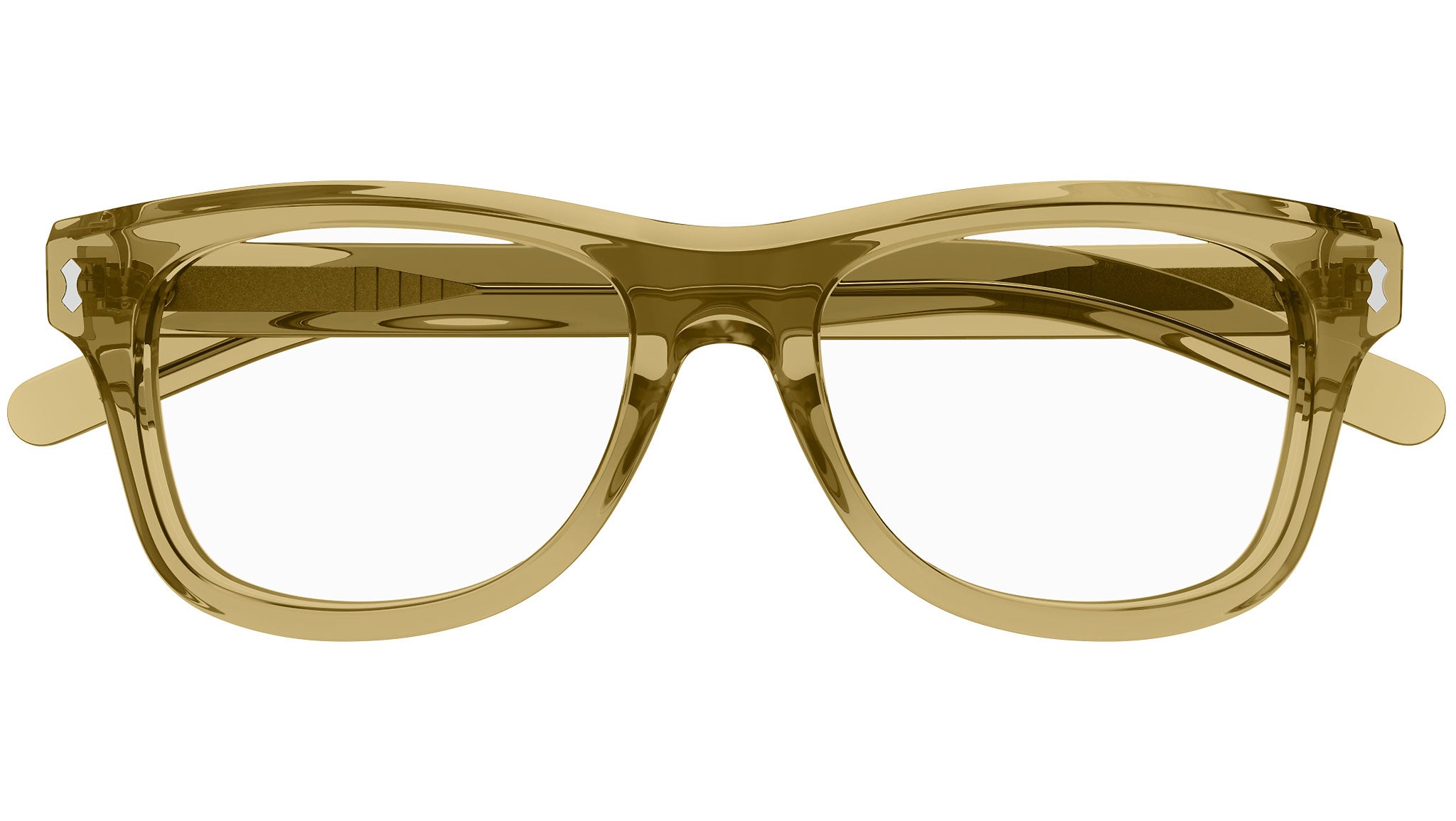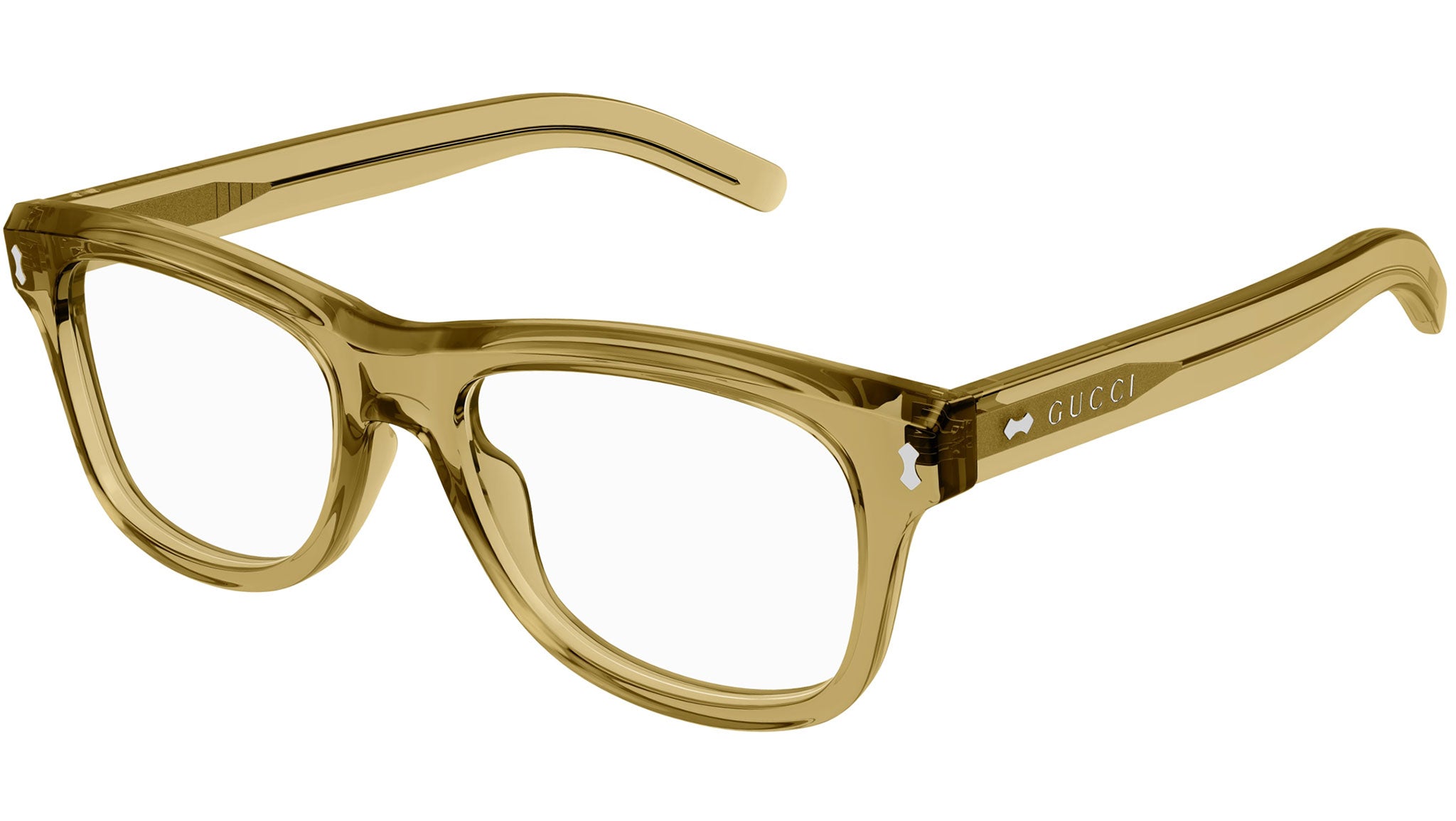 Occhiali da vista Gucci Rivets modello GG1526O pantos in acetato riciclato codice colore 004 senape trasparente lucido con astine giallo e lenti demo.