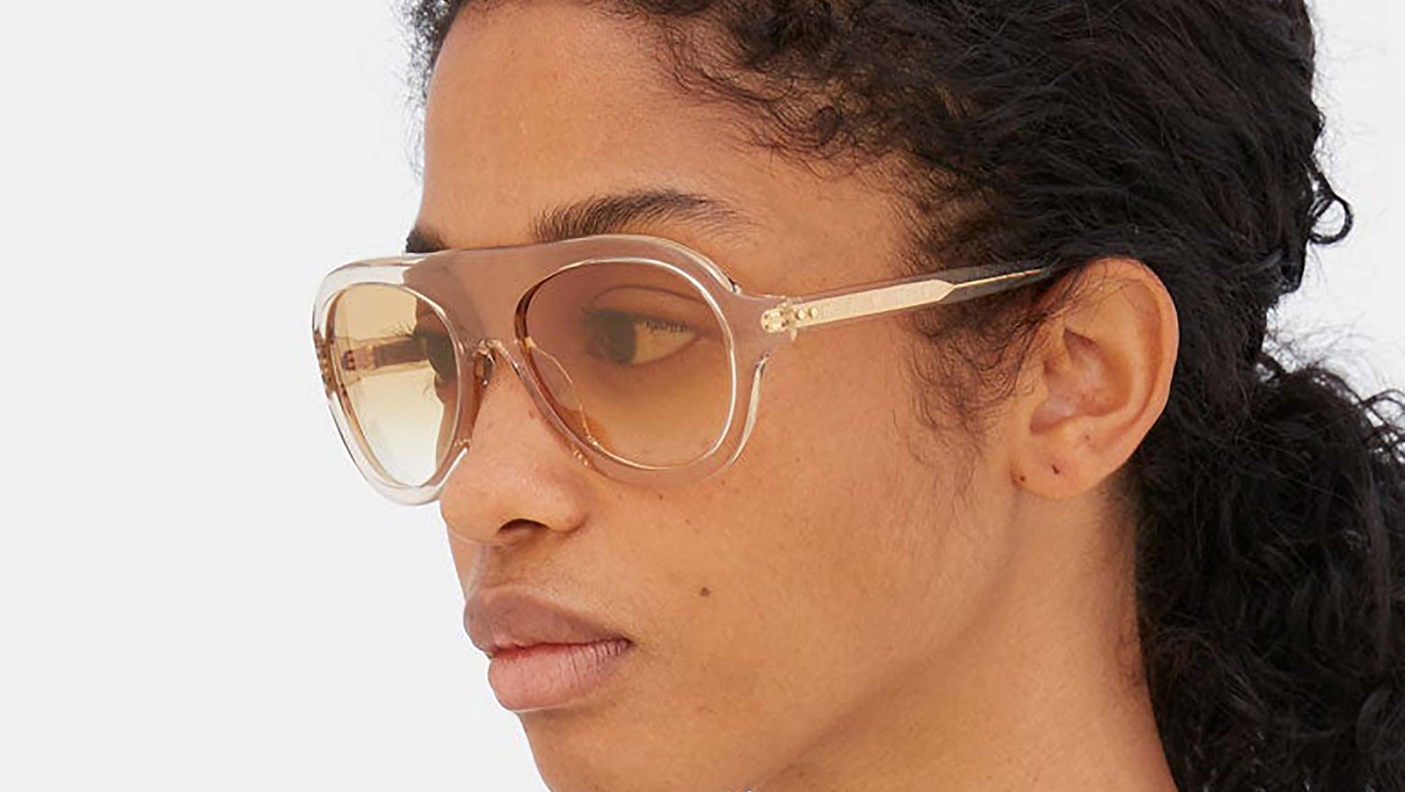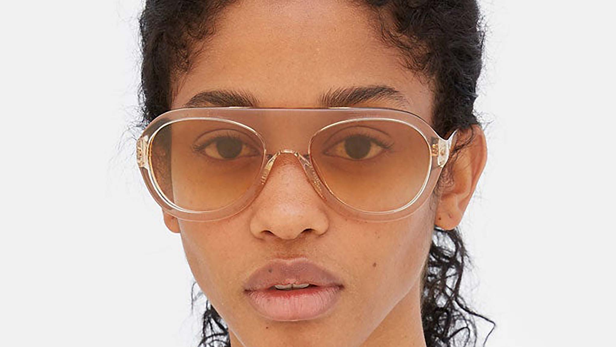 Low bridge fit. Mount Toc is a bold interpretation of classic aviator-style designs. In true Marni fashion, this timeless design was updated with bold geometries and quirky detailing, for an aesthetics that references 1970s sportswear glamour. Its broad structure features a sturdy nose-bridge and pear-shape lenses encased within chunky acetate rims. A unique detail: wrap-around temple design. This model comes in a crystal resin acetate with light tinted lenses. Sizes: R / R Lens Width: Frame Front: Frame Side: Product Code Size R: 05P Product Code Size R: TR9