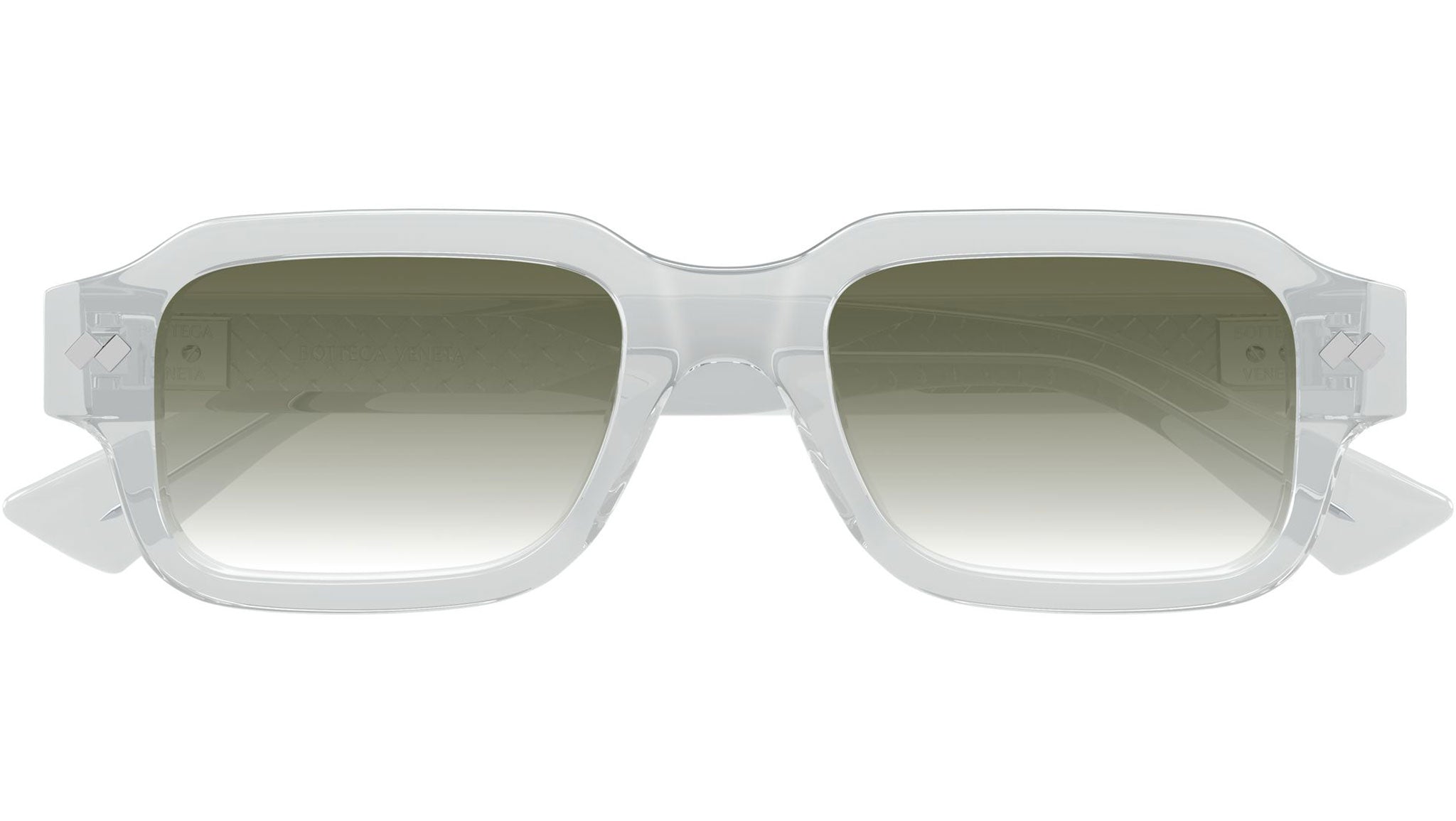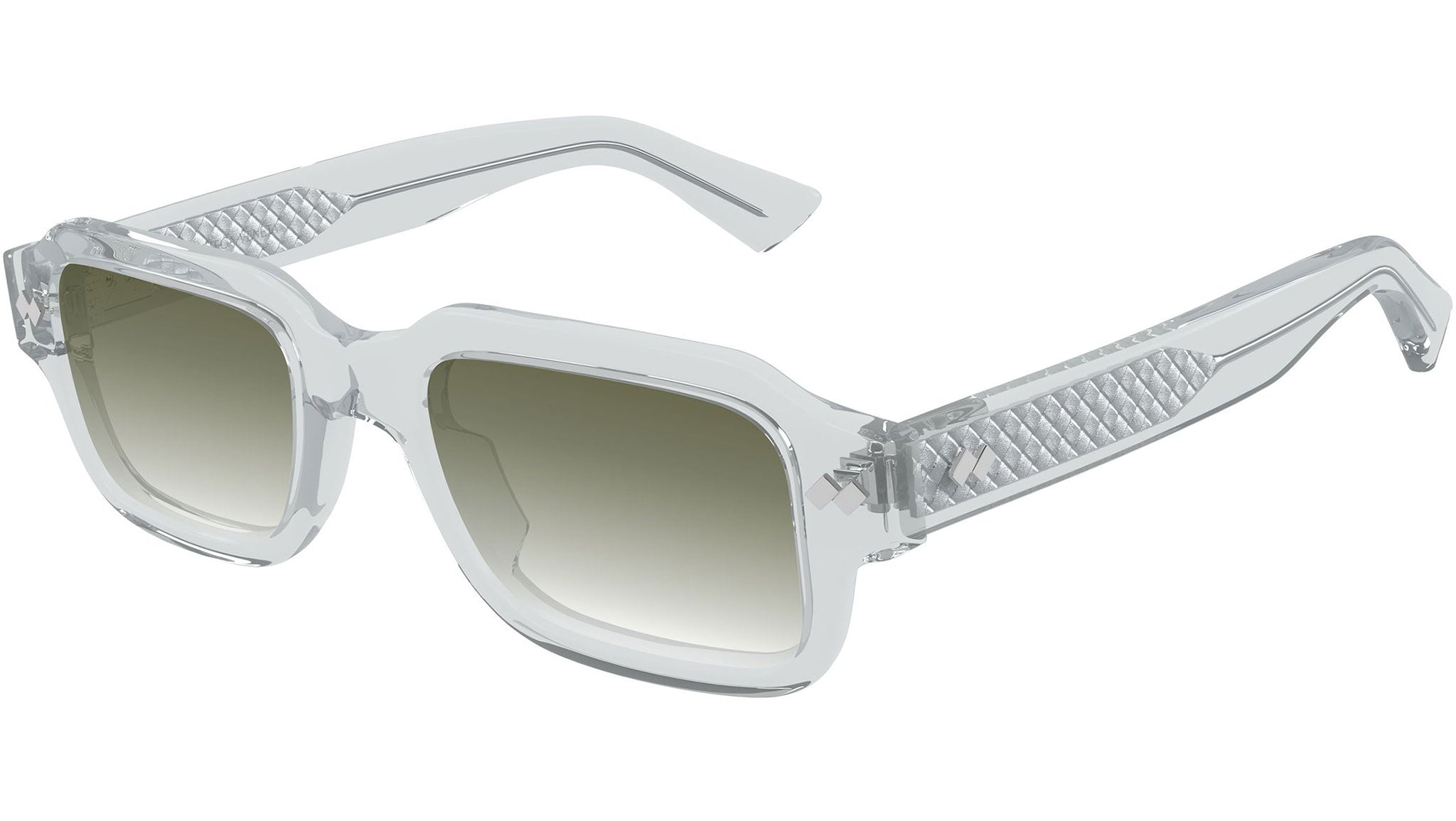 Occhiali da sole Bottega Veneta BV1442S 003 uomo con montatura rettangolare in acetato riciclato grigio chiaro trasparente lucido e lenti verde sfumato. Linea: Intrecciato. Codice modello: BV1442S. Codice colore: 003. Made in Japan. Rivenditore autorizzato Bottega Veneta online. Gli occhiali vengono consegnati con custodia e accessori originali e sono coperti dalla garanzia ufficiale di 12 mesi del produttore.
