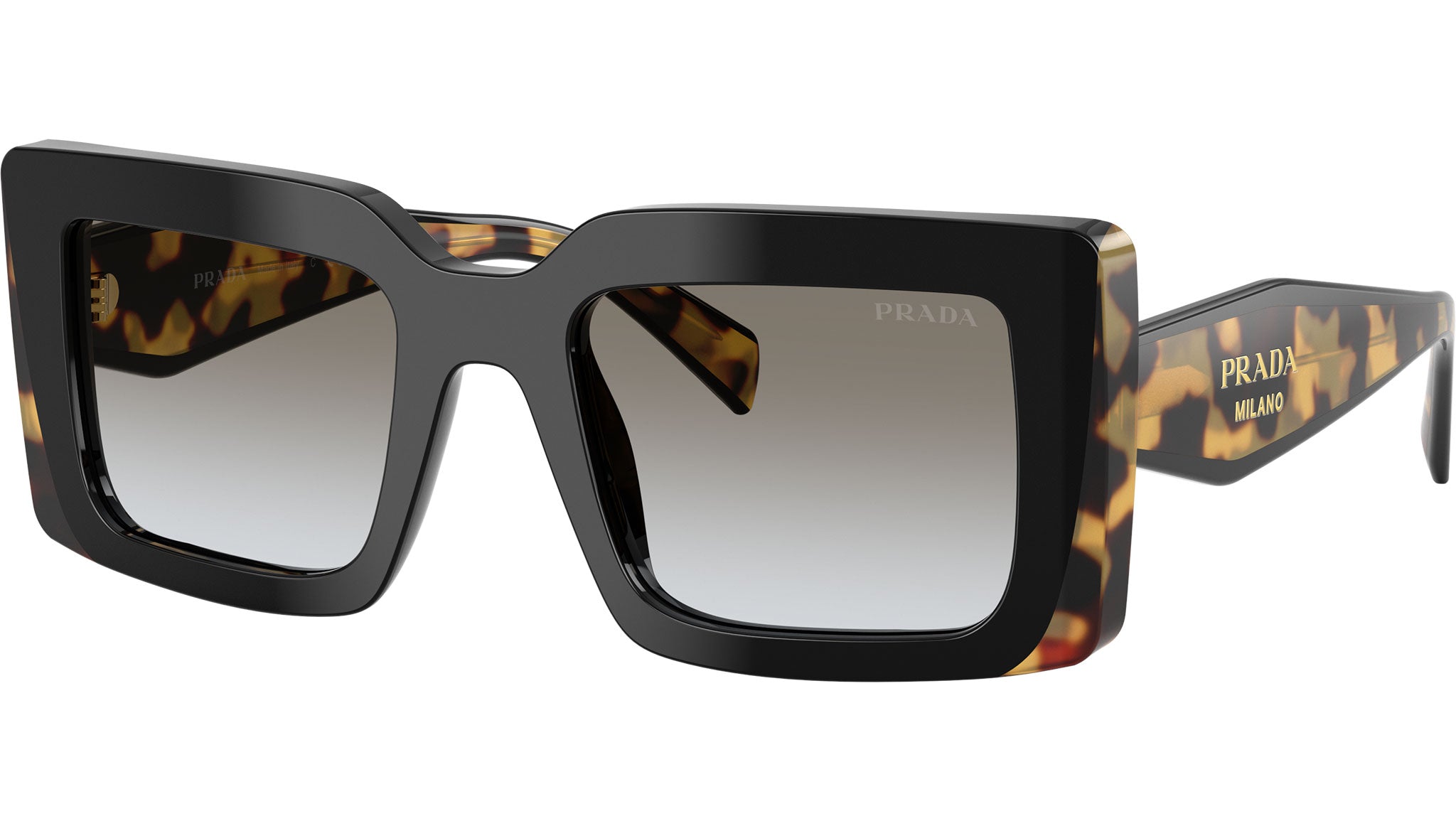 Occhiali da sole Prada PR D01S 0CD80L donna con montatura rettangolare in acetato nero / tartaruga e lenti in bio poliammide color grigio sfumato. Vestibilità a ponte alto. Linea: Design. Codice modello: PRD01S. Codice colore: 0CD80L. Made in Italy. Rivenditore autorizzato Prada online. Gli occhiali vengono consegnati con custodia e accessori originali e sono coperti dalla garanzia ufficiale di 12 mesi del produttore.