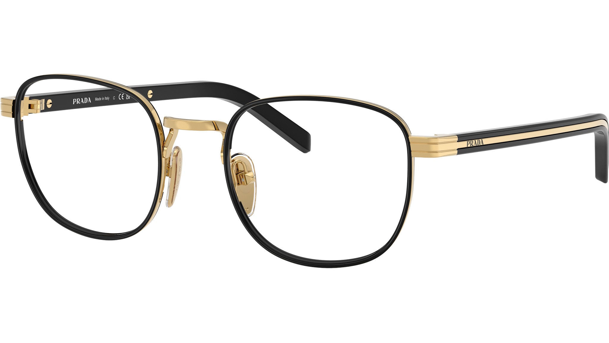 Occhiali da vista Prada PR D50V 5AK1O1 uomo con montatura pantos in metallo oro / nero e lenti demo. Naselli regolabili. Linea: Heritage. Codice modello: PRD50V. Codice colore: 5AK1O1. Made in Italy. Rivenditore autorizzato Prada online. Gli occhiali vengono consegnati con custodia e accessori originali e sono coperti dalla garanzia ufficiale di 12 mesi del produttore.