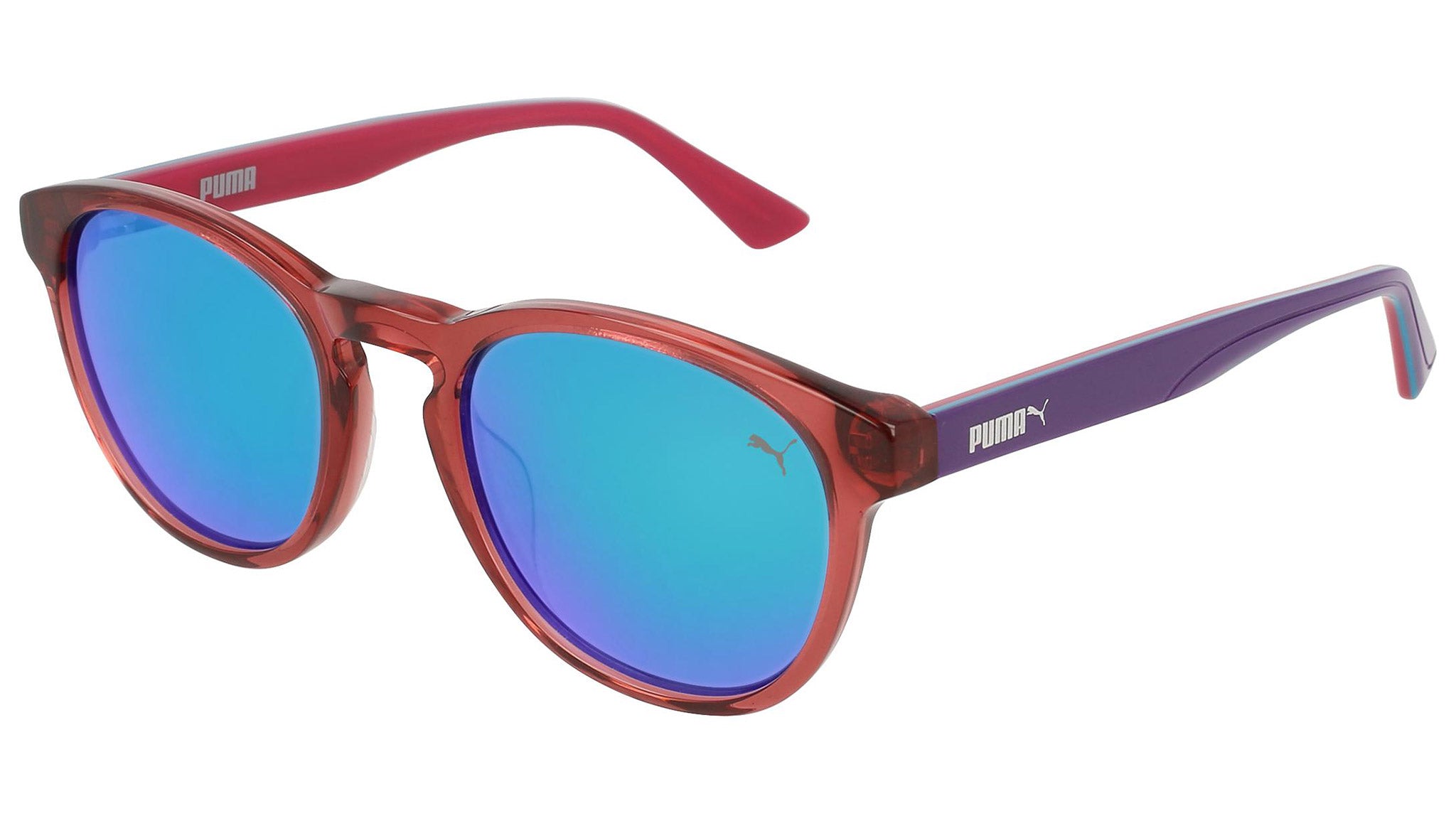 Puma for Kids model PJ0023S 006 transparent shiny pink sunglasses, with blue lenses. These kids are on the move. They roam the streets in search for recognition, emotions and daily kicks: celebrating with friends at the Luna Park, a thrilling jump, a trick on a skateboard, or simply seeing something new.