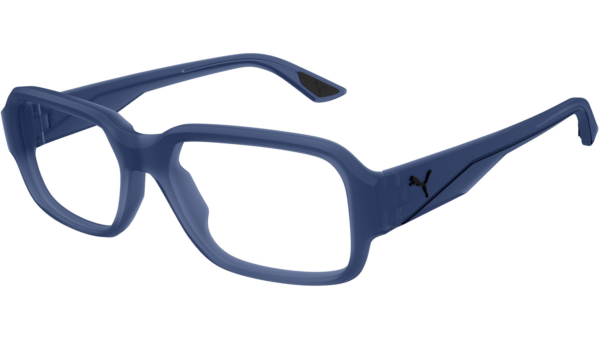 Occhiali da vista Puma Sport modello PU0439O variante colore 005 blu scuro opaco trasparente con lenti demo. Rivenditore autorizzato Puma online. Gli occhiali vengono consegnati con custodia e accessori originali e sono coperti dalla garanzia ufficiale di 12 mesi del produttore.