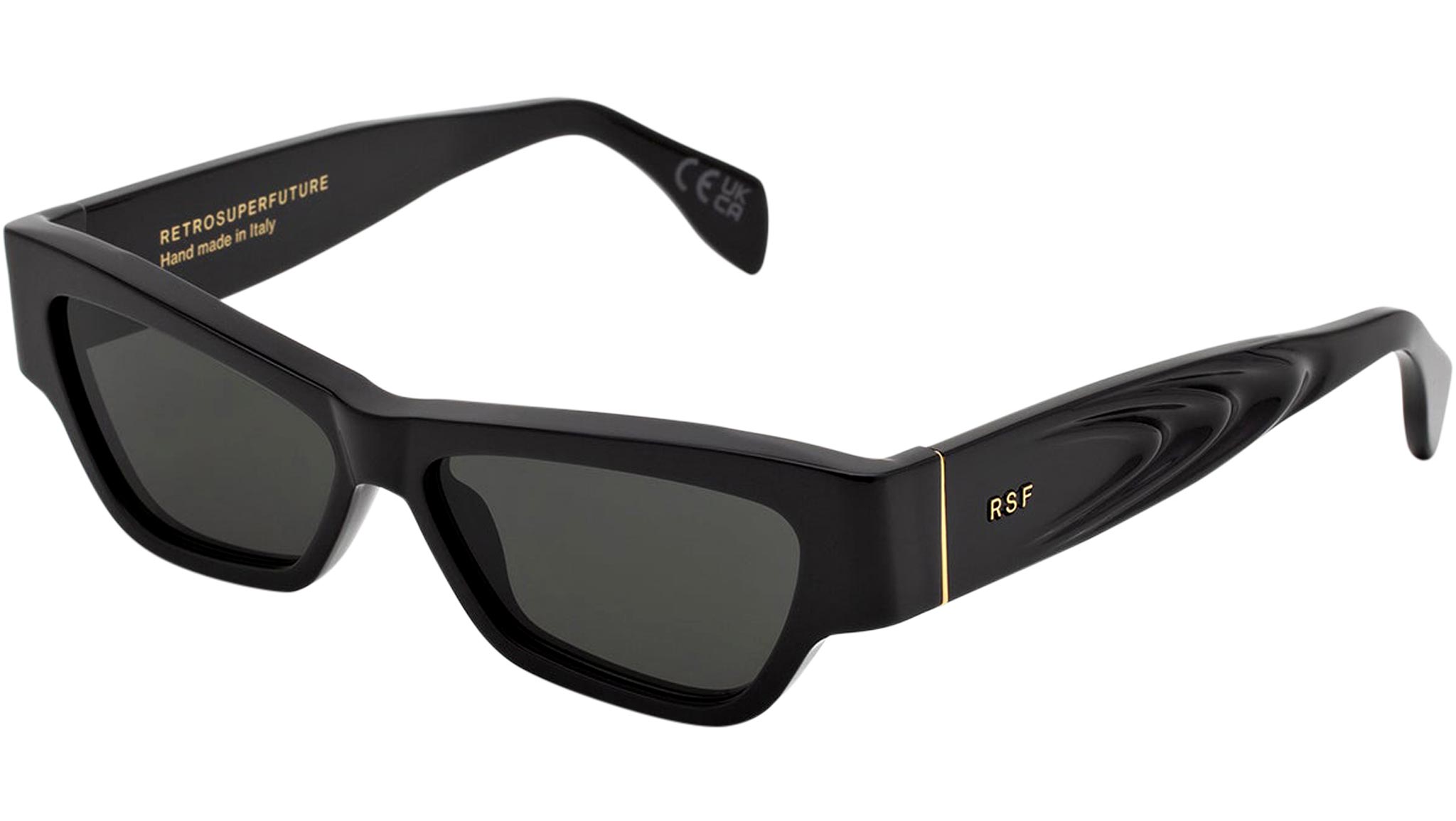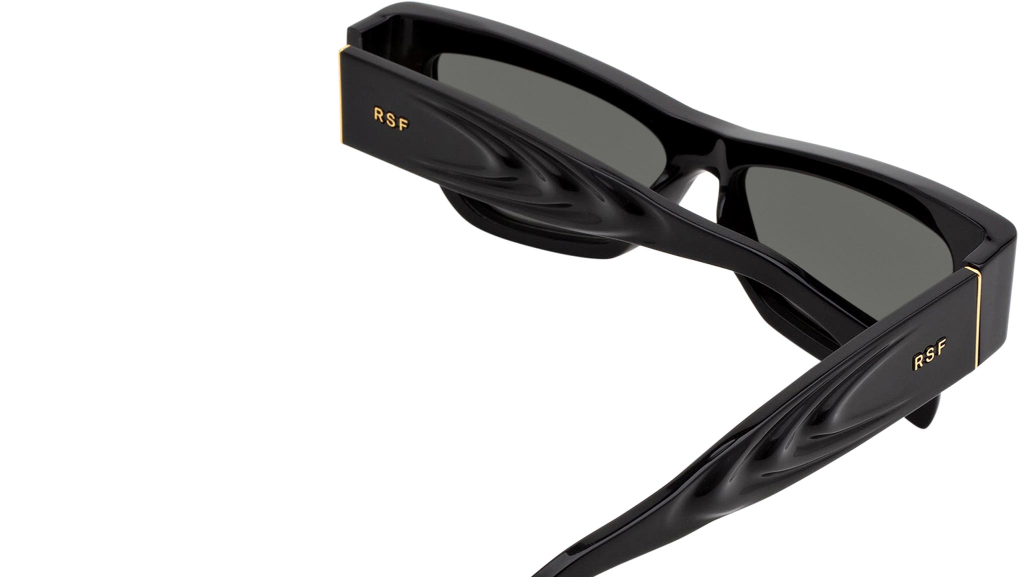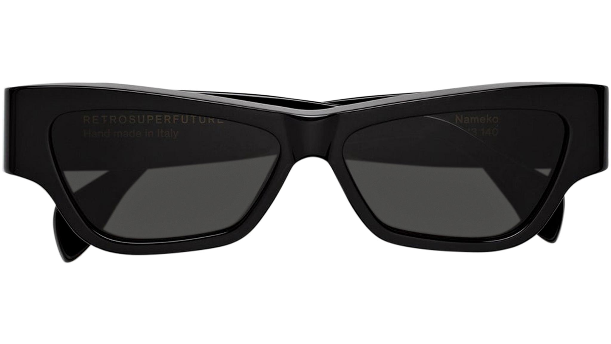 Nameko is an edgy and mischievous eyewear piece that embodies RSF's playful design approach. With a low-riding, wide silhouette, the frame includes a thick brow-line and sturdy geometric frontal frame. The lower half of the frame features slanted, thinner rims. Notably, Nameko stands out with its unique and otherworldly thermoform design on the temples, making it a distinctive and contemporary eyewear piece. This version comes in a timeless black acetate and matching lenses. Sizes: R Lens Width: 56 mm. Frame Front: Frame Side: 140 mm. Product Code Size R: K8U