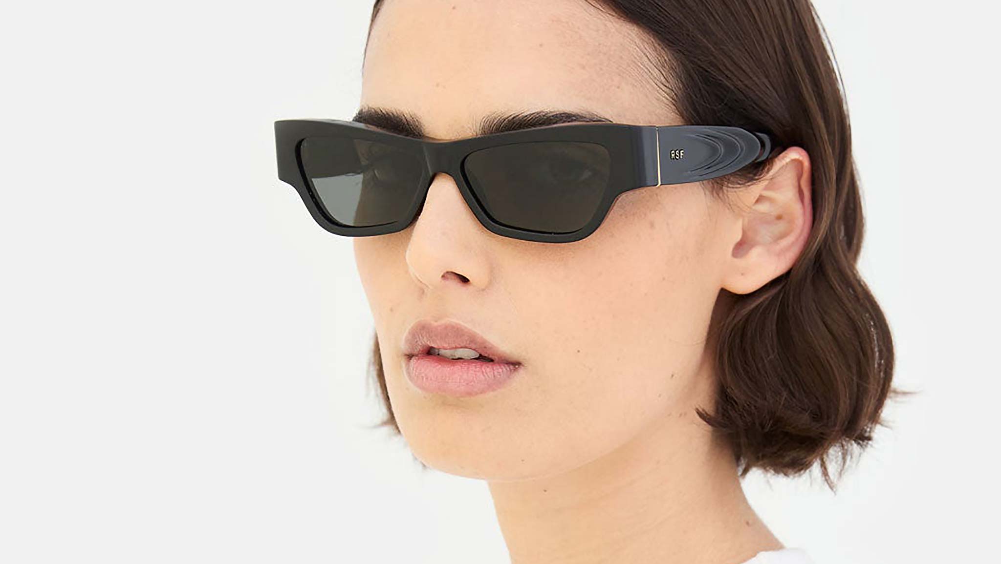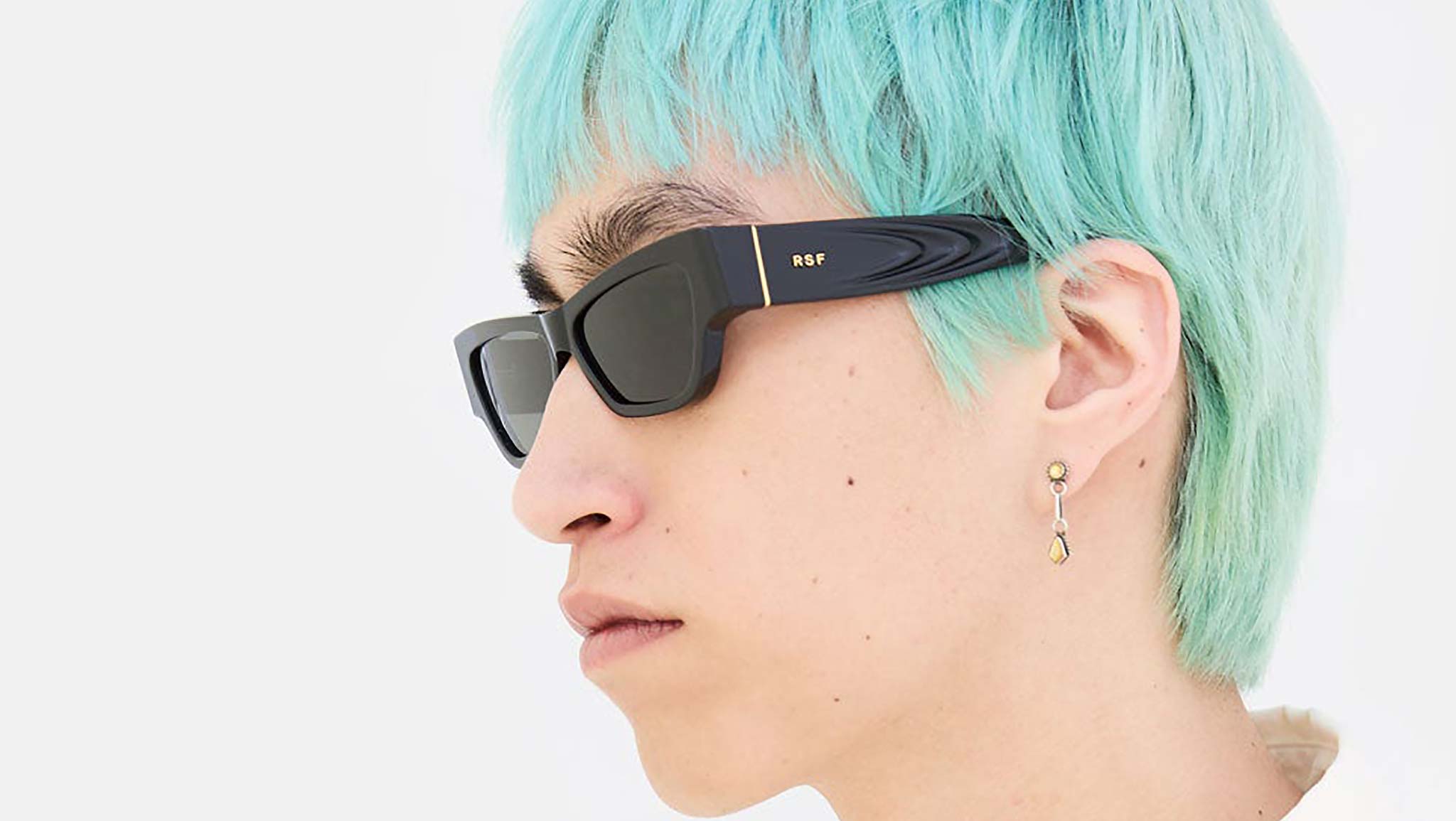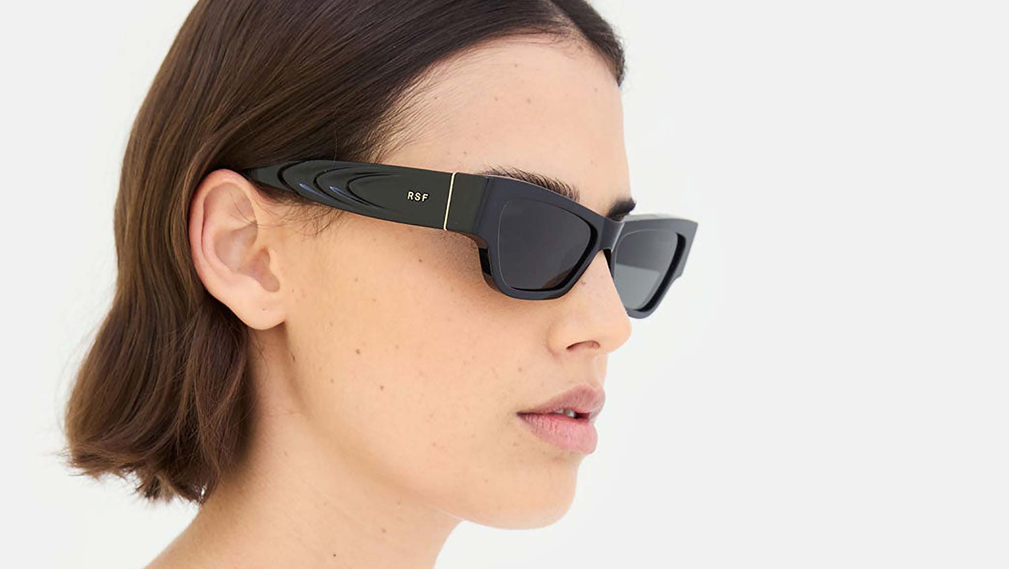 Nameko is an edgy and mischievous eyewear piece that embodies RSF's playful design approach. With a low-riding, wide silhouette, the frame includes a thick brow-line and sturdy geometric frontal frame. The lower half of the frame features slanted, thinner rims. Notably, Nameko stands out with its unique and otherworldly thermoform design on the temples, making it a distinctive and contemporary eyewear piece. This version comes in a timeless black acetate and matching lenses. Sizes: R Lens Width: 56 mm. Frame Front: Frame Side: 140 mm. Product Code Size R: K8U