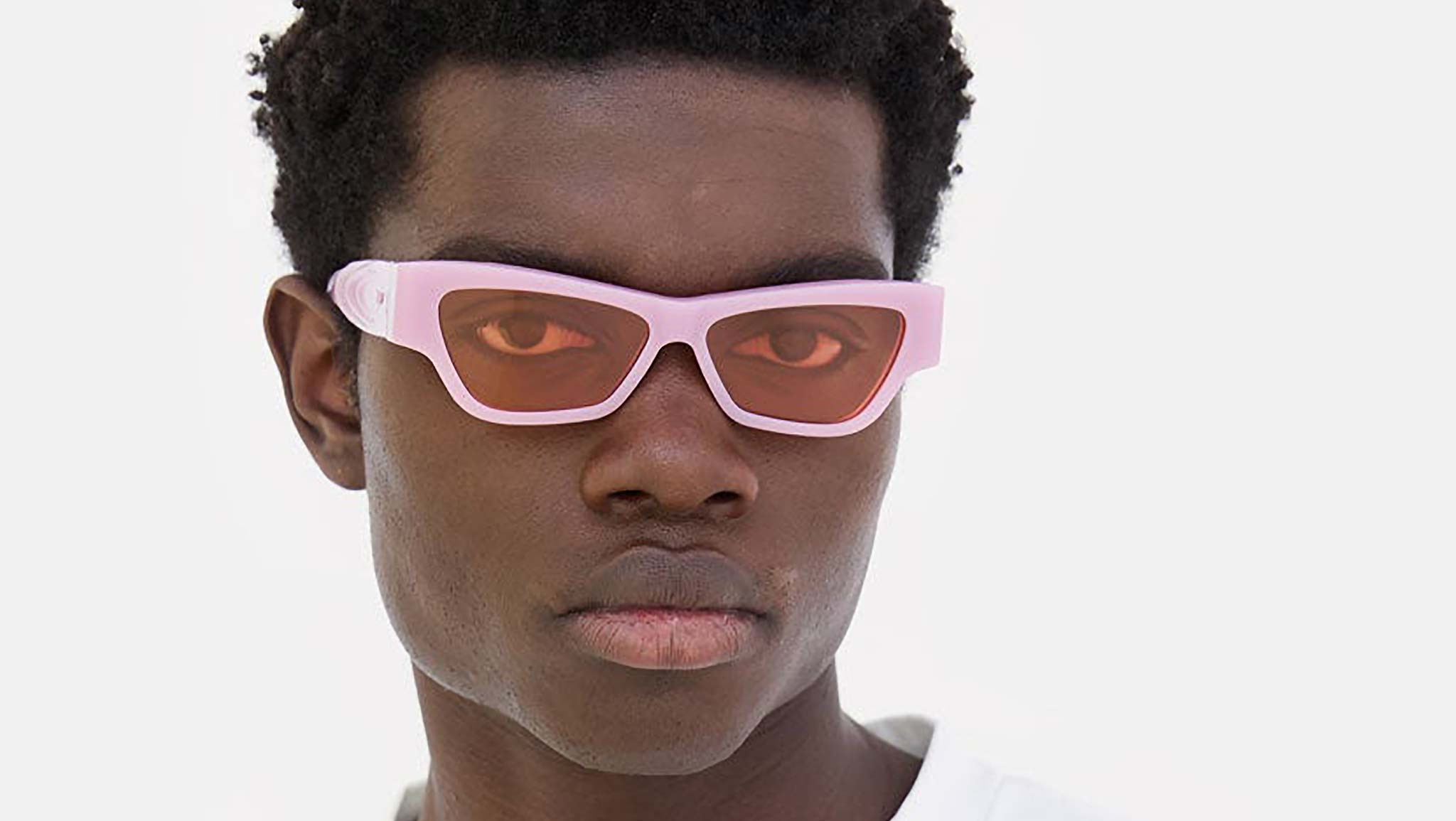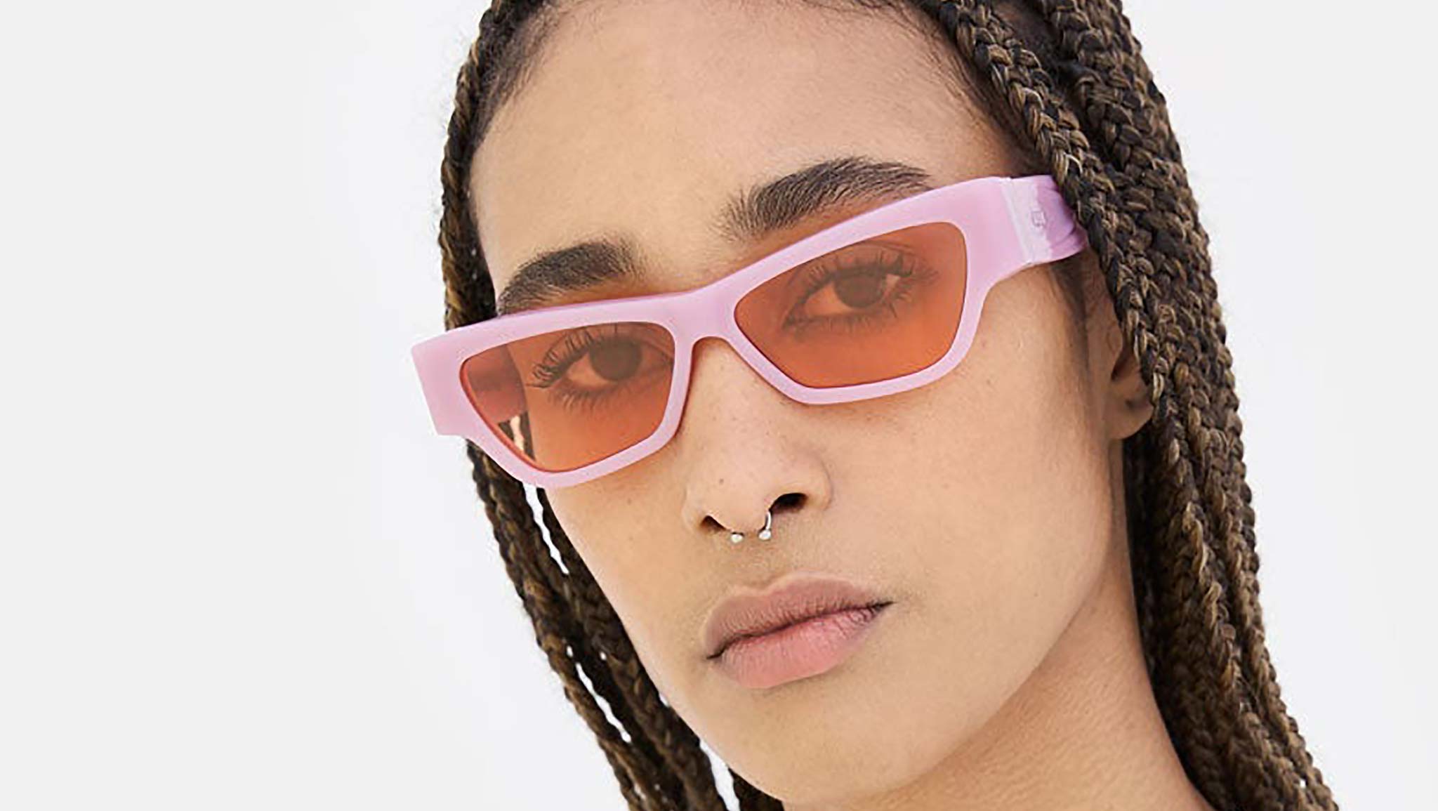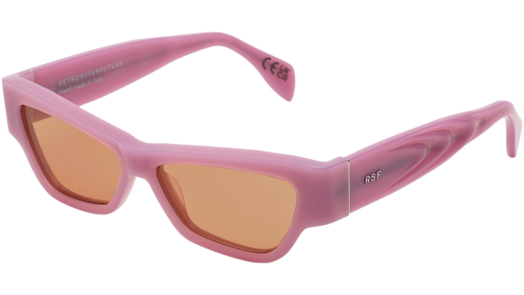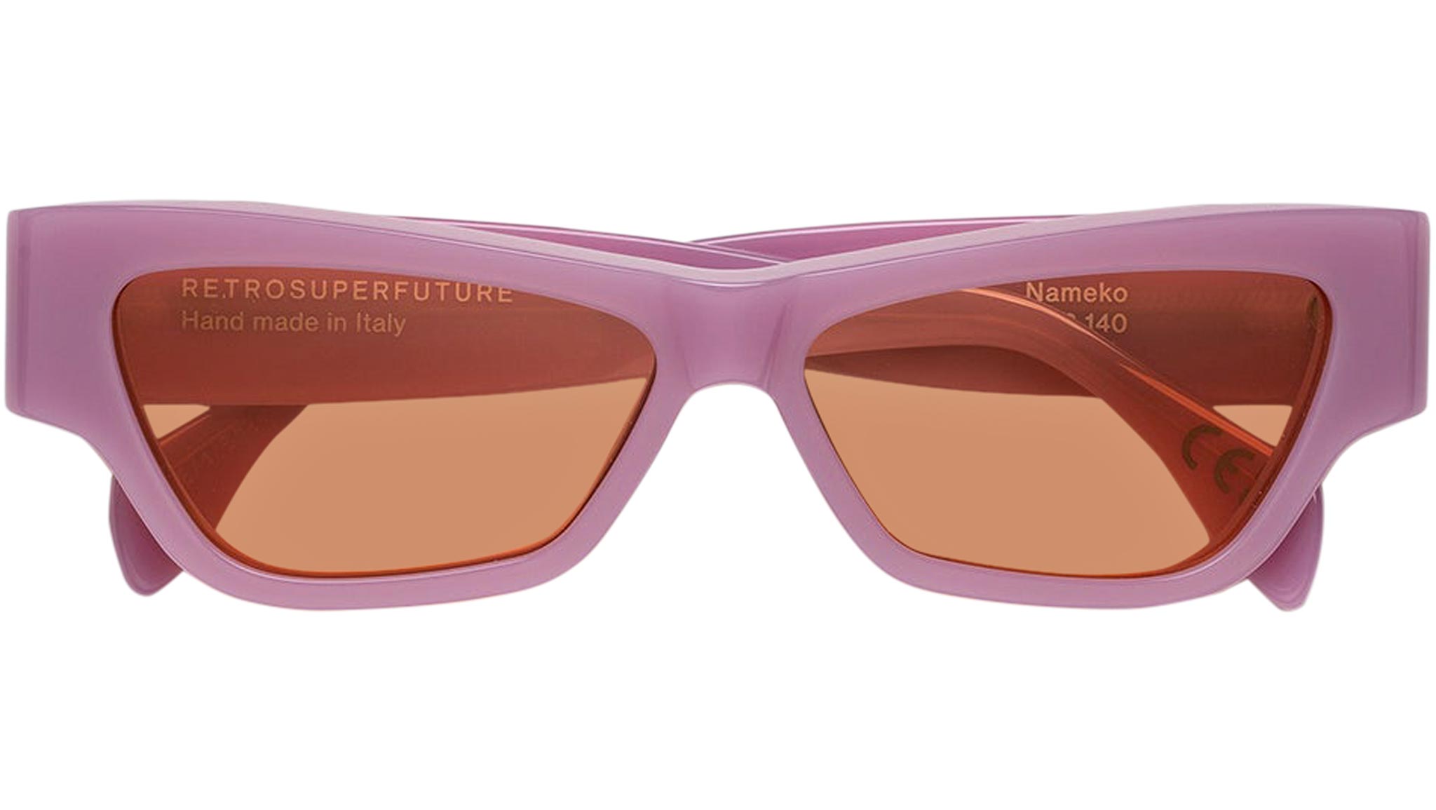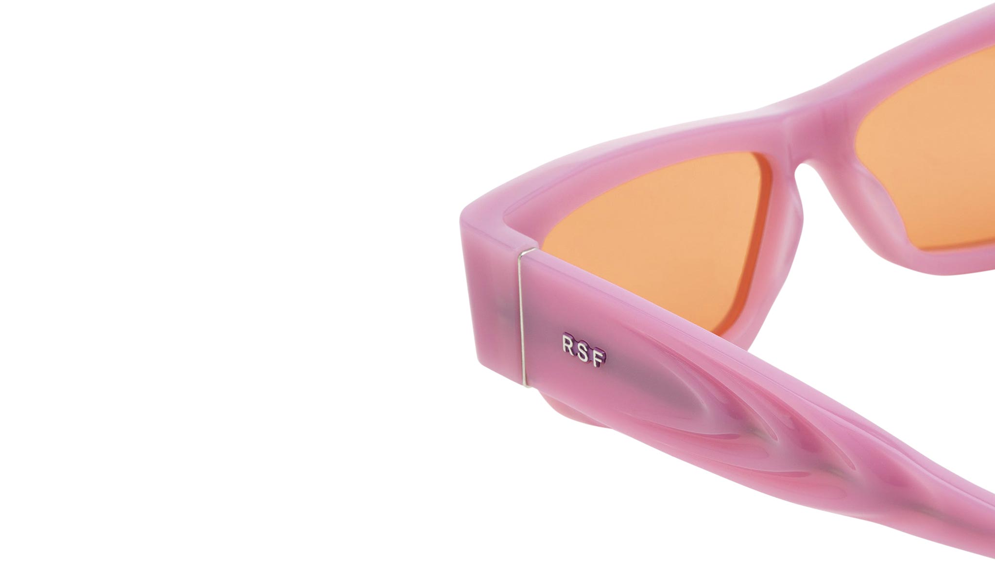 Nameko is an edgy and mischievous eyewear piece that embodies RSF's playful design approach. With a low-riding, wide silhouette, the frame includes a thick brow-line and sturdy geometric frontal frame. The lower half of the frame features slanted, thinner rims. Notably, Nameko stands out with its unique and otherworldly thermoform design on the temples, making it a distinctive and contemporary eyewear piece. This version comes in a lilac acetate and orange lenses. Sizes: R Lens Width: 56 mm. Frame Front: Frame Side: 140 mm. Product Code Size R: KUE