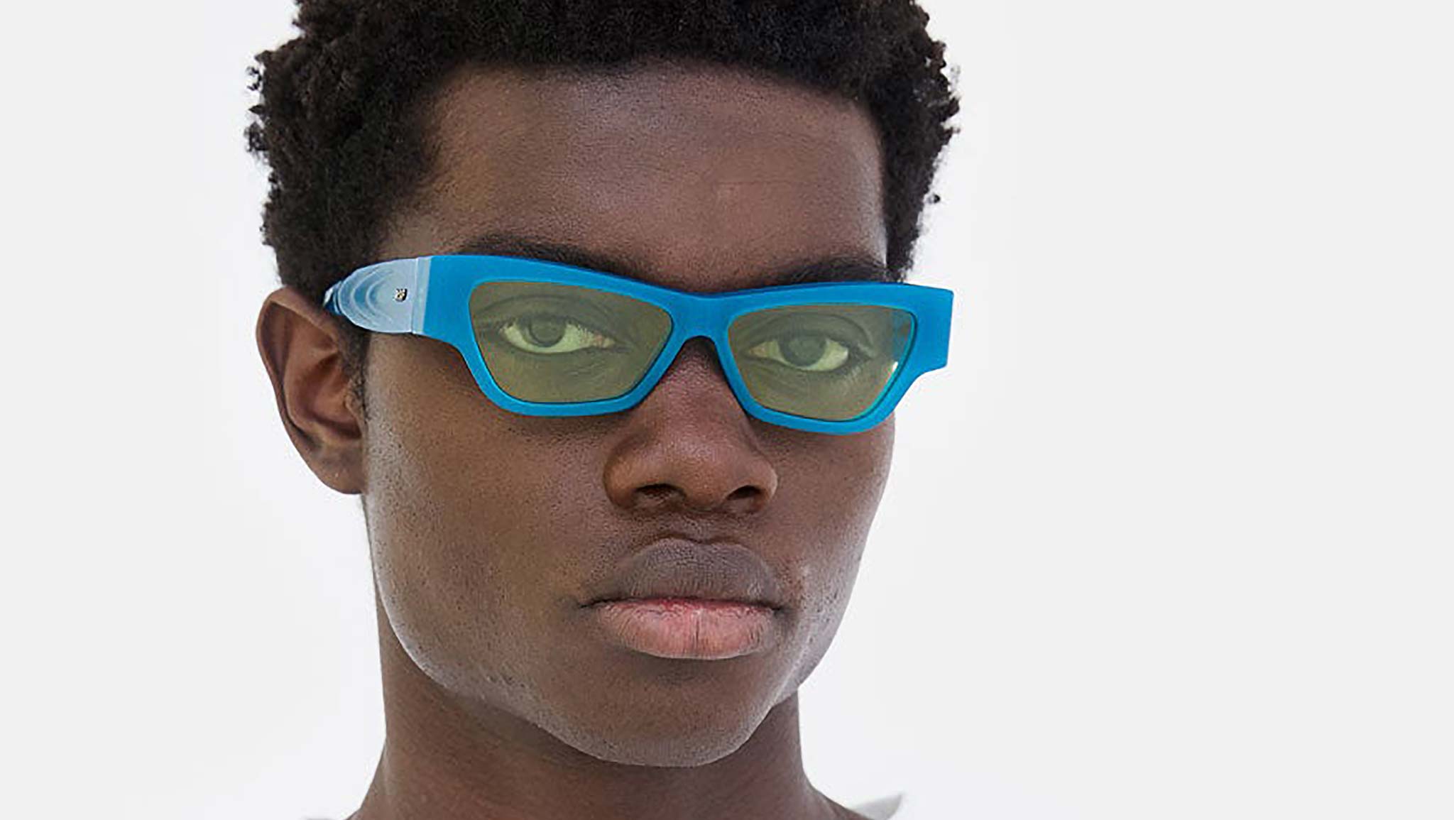 Nameko is an edgy and mischievous eyewear piece that embodies RSF's playful design approach. With a low-riding, wide silhouette, the frame includes a thick brow-line and sturdy geometric frontal frame. The lower half of the frame features slanted, thinner rims. Notably, Nameko stands out with its unique and otherworldly thermoform design on the temples, making it a distinctive and contemporary eyewear piece. This version comes in an opaline blue acetate and acid green lenses. Sizes: R Lens Width: 56 mm. Frame Front: Frame Side: 140 mm. Product Code Size R: 27H