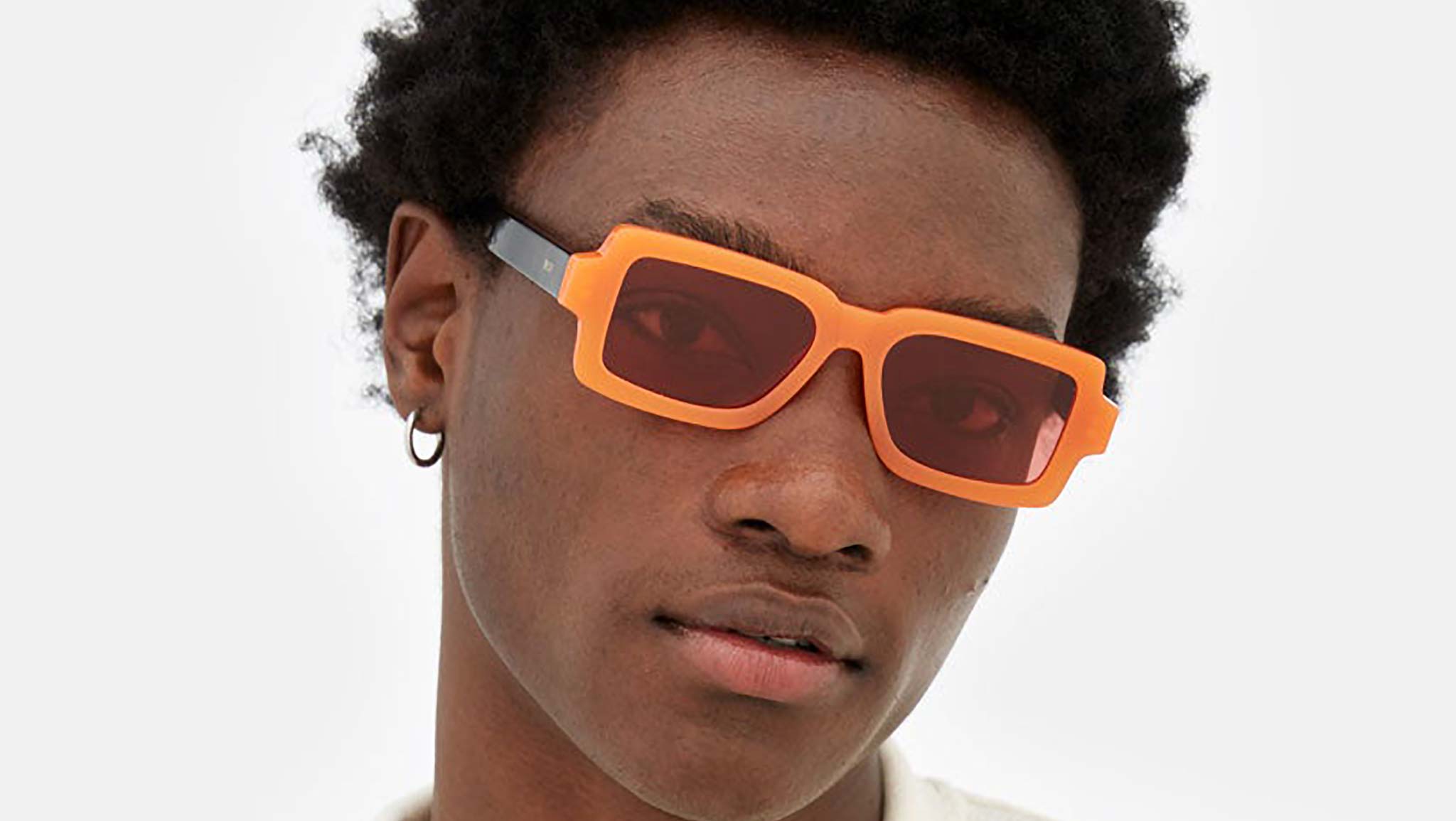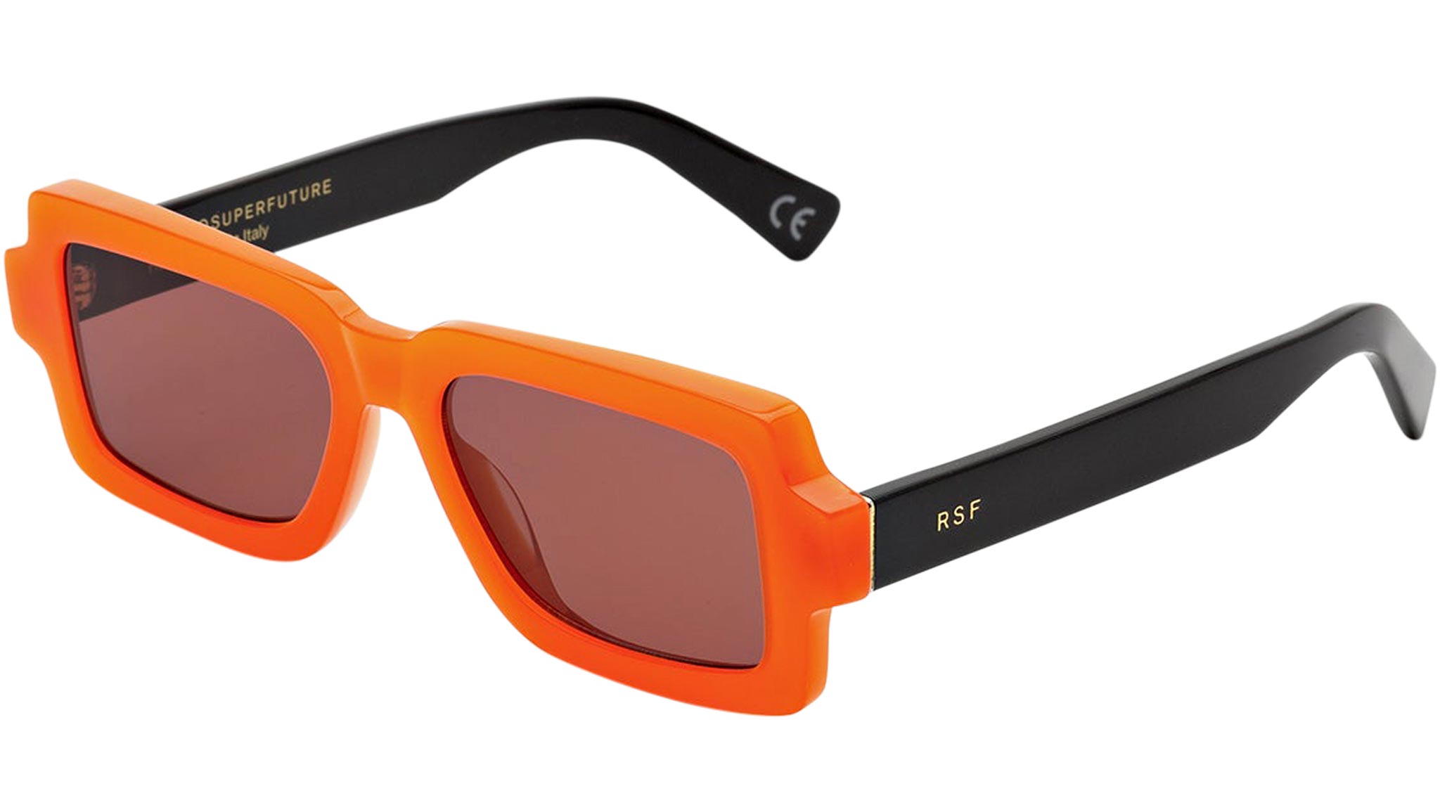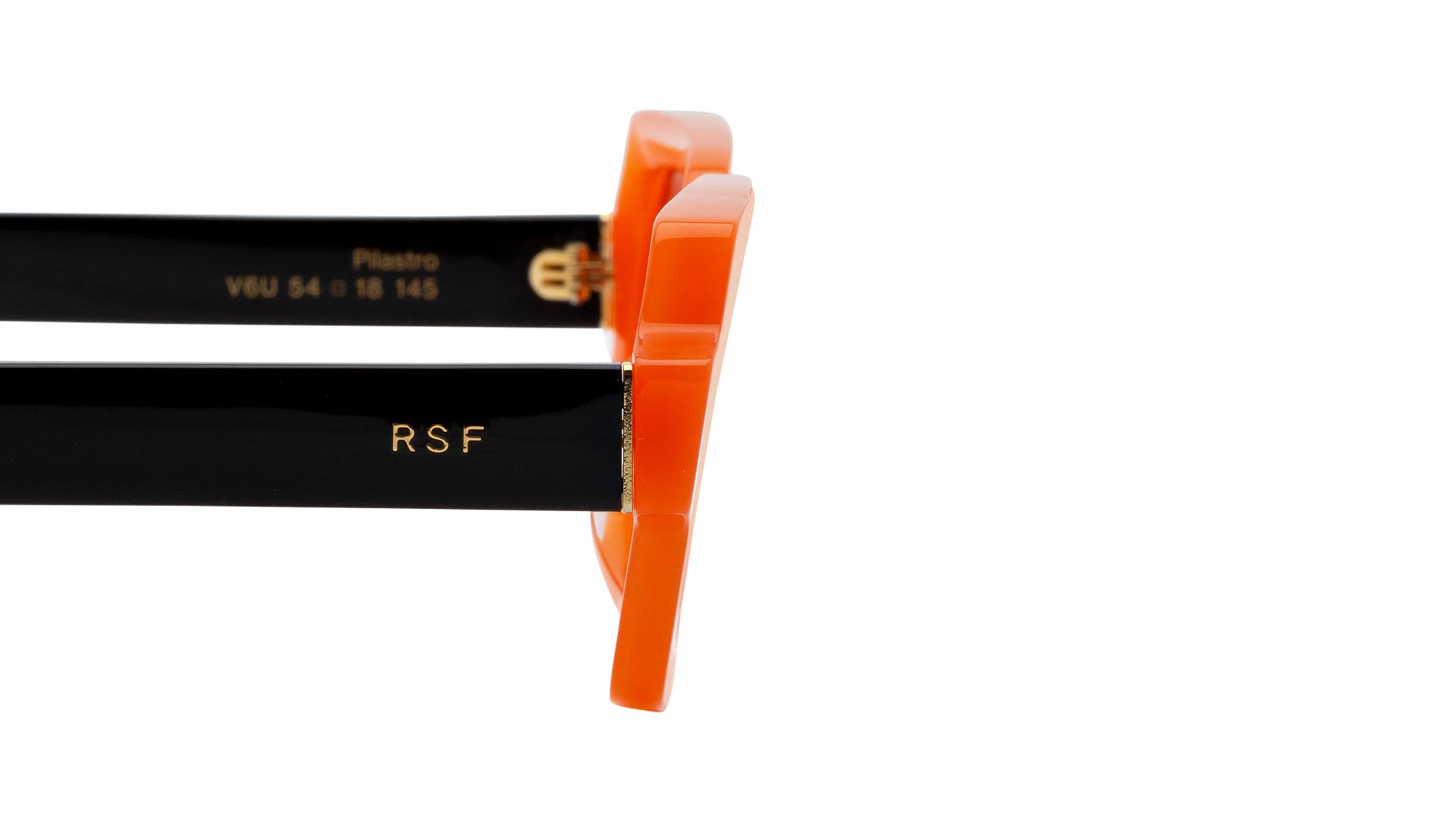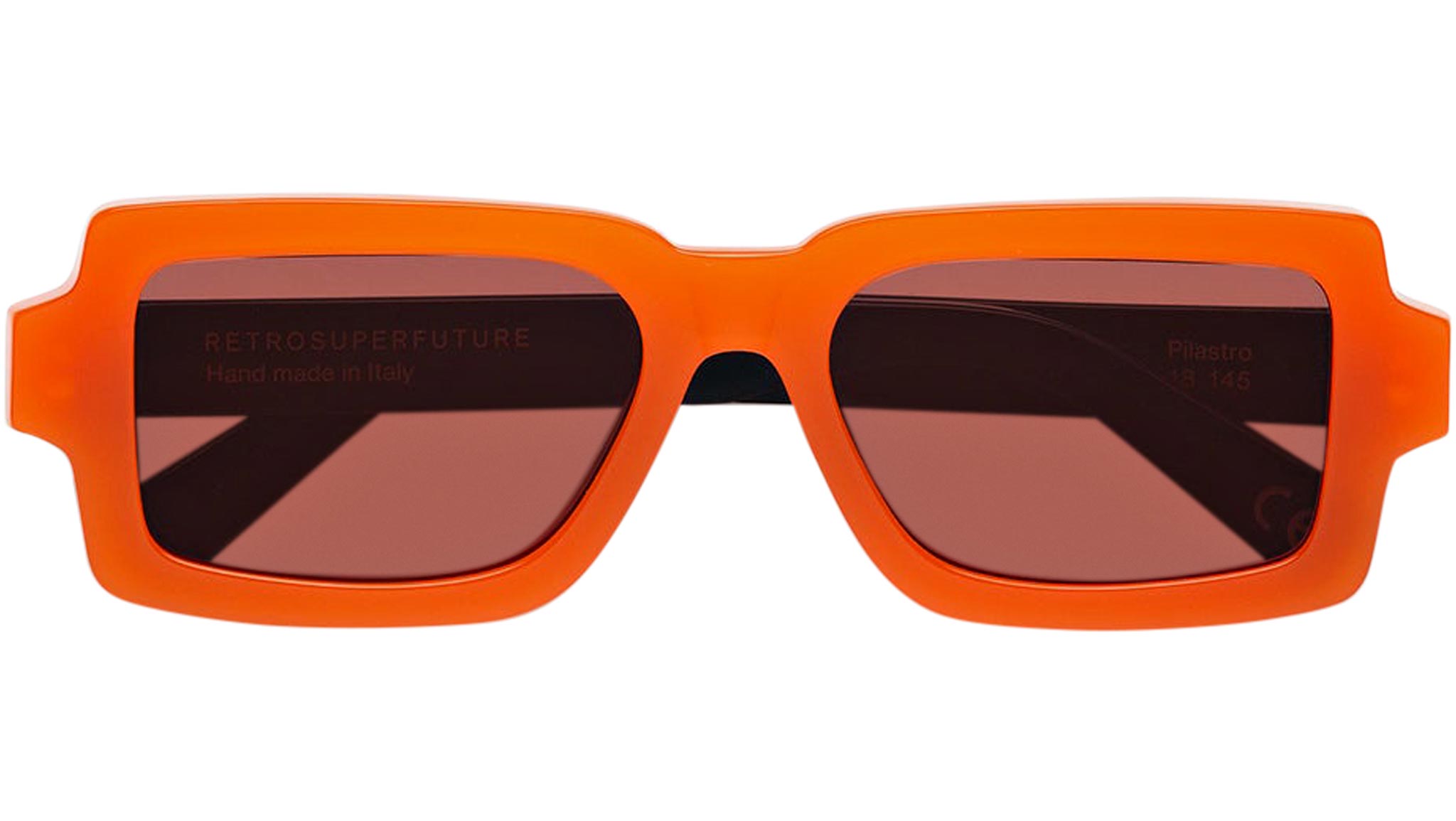 Pilastro is a sharp contemporary silhouette characterized by a unique geometric design. The model’s innovative shape features rectangular rims that stand out for their particularly wide and low-riding proportions. The thick acetate construction of the Pilastro is a crossover between 1970s exuberance and 2000s street-edge. Conceived as a unisex shape, this version of the Pilastro features a bold orange acetate with Bordeaux lenses. Sizes: R Lens Width: 54 mm. Frame Front: Frame Side: 145 mm. Product Code Size R: V6U