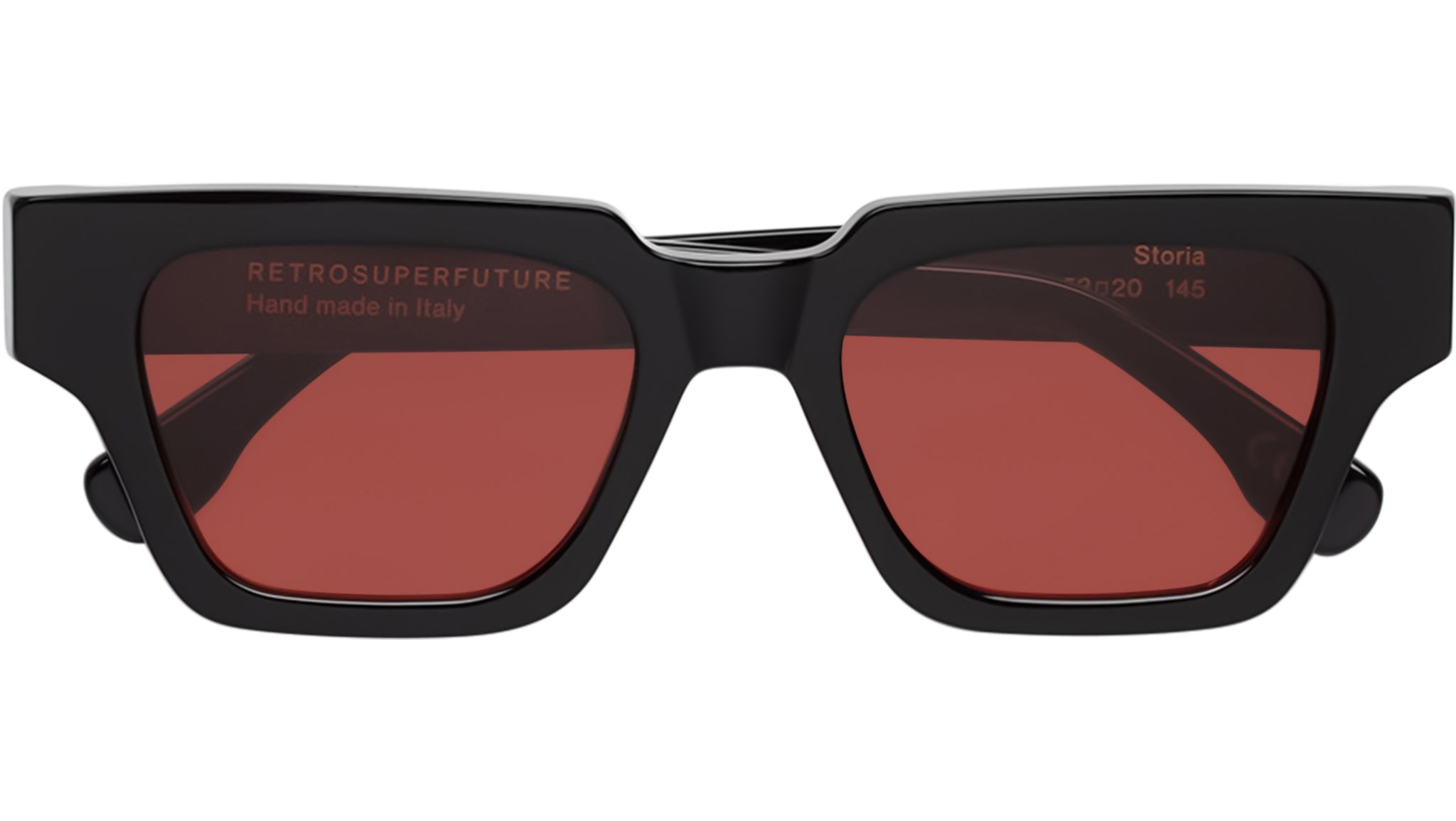 An iconic model designed to transcend seasonal trends, Storia matches the timelesselegance of casual style with a sharp street edge. Storia is a cool, sleek angular silhouette characterized by a geometric brow-line, with precise angles sculpted around its low nose-bridge and defined lines around its thick temple-tips. This is a quintessential unisex model that comes in a shiny black acetate with sophisticated bordeaux lenses. Sizes: R. Lens Width: 53 mm. Frame Front: Frame Side: 145 mm. Product Code Size R: 1VF.