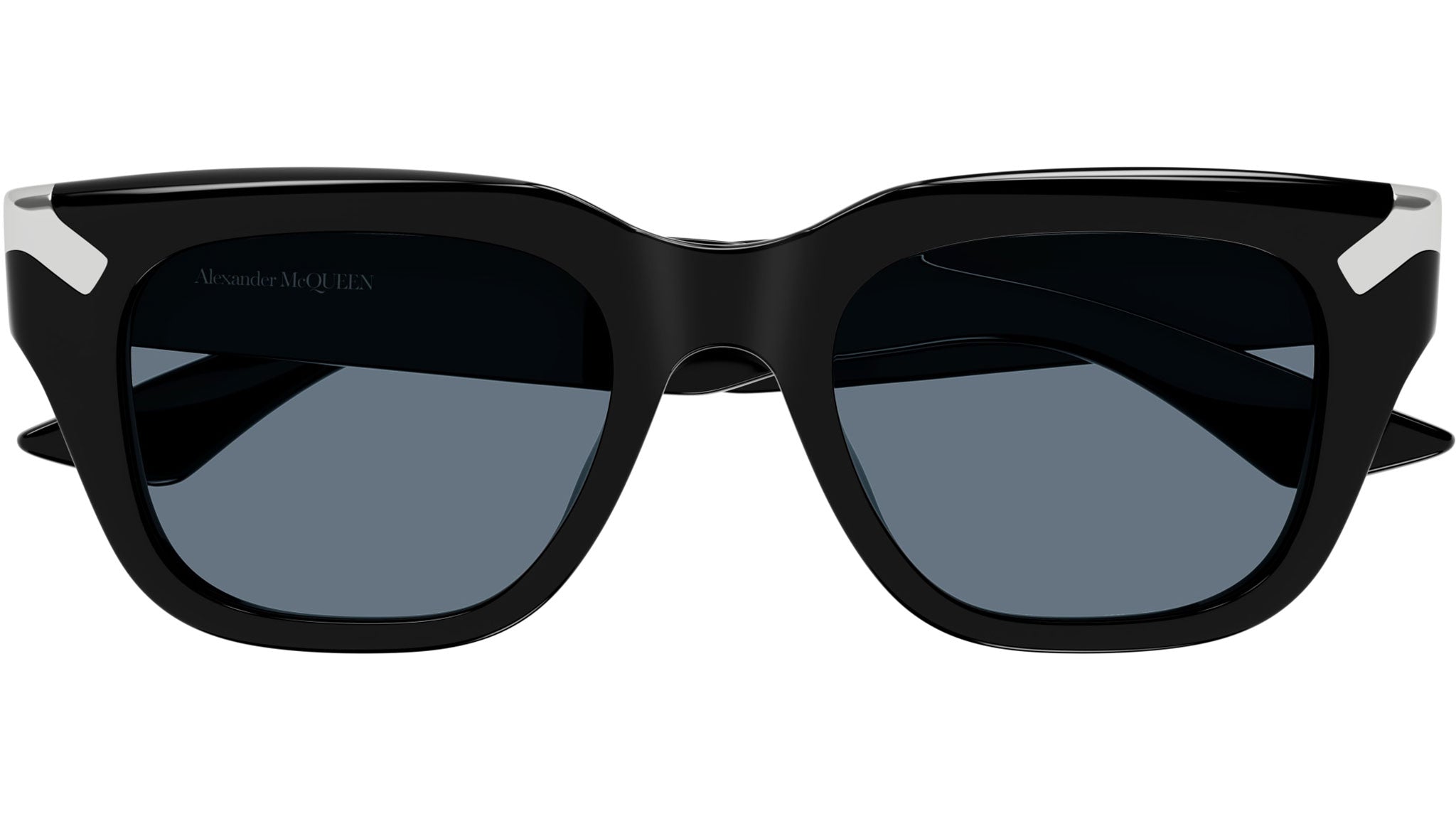 Occhiali da sole Alexander McQueen Icons modello AM0439S rectangle in acetato riciclato codice colore 002 nero lucido tinta unita con aste nero e lenti color blu tinta unita.