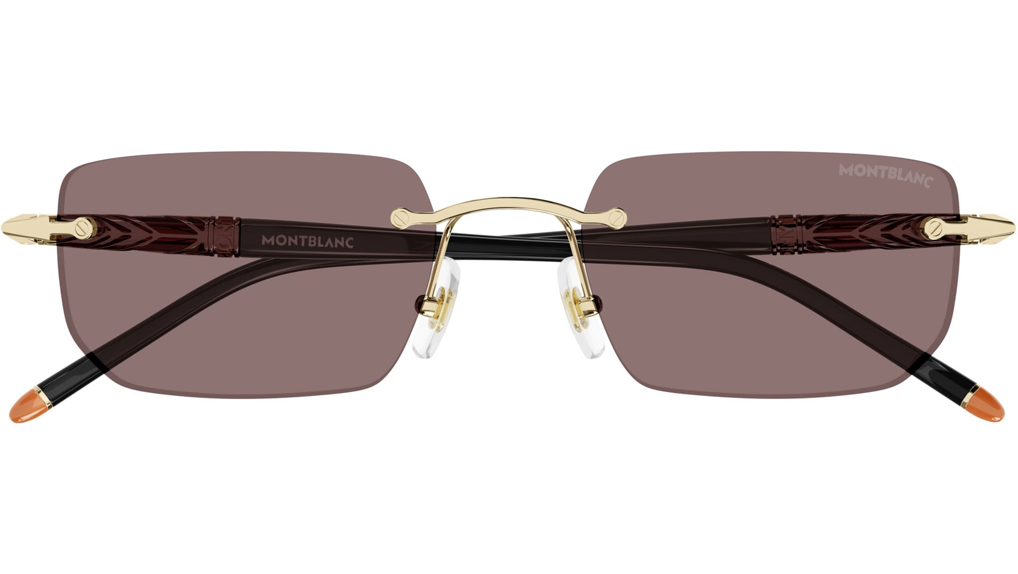 Occhiali da sole Montblanc modello MB0348S linea Meisterstück forma rettangolare in metallo, codice colore 003 oro chiaro lucido con aste color nero e lenti color marrone tinta unita.